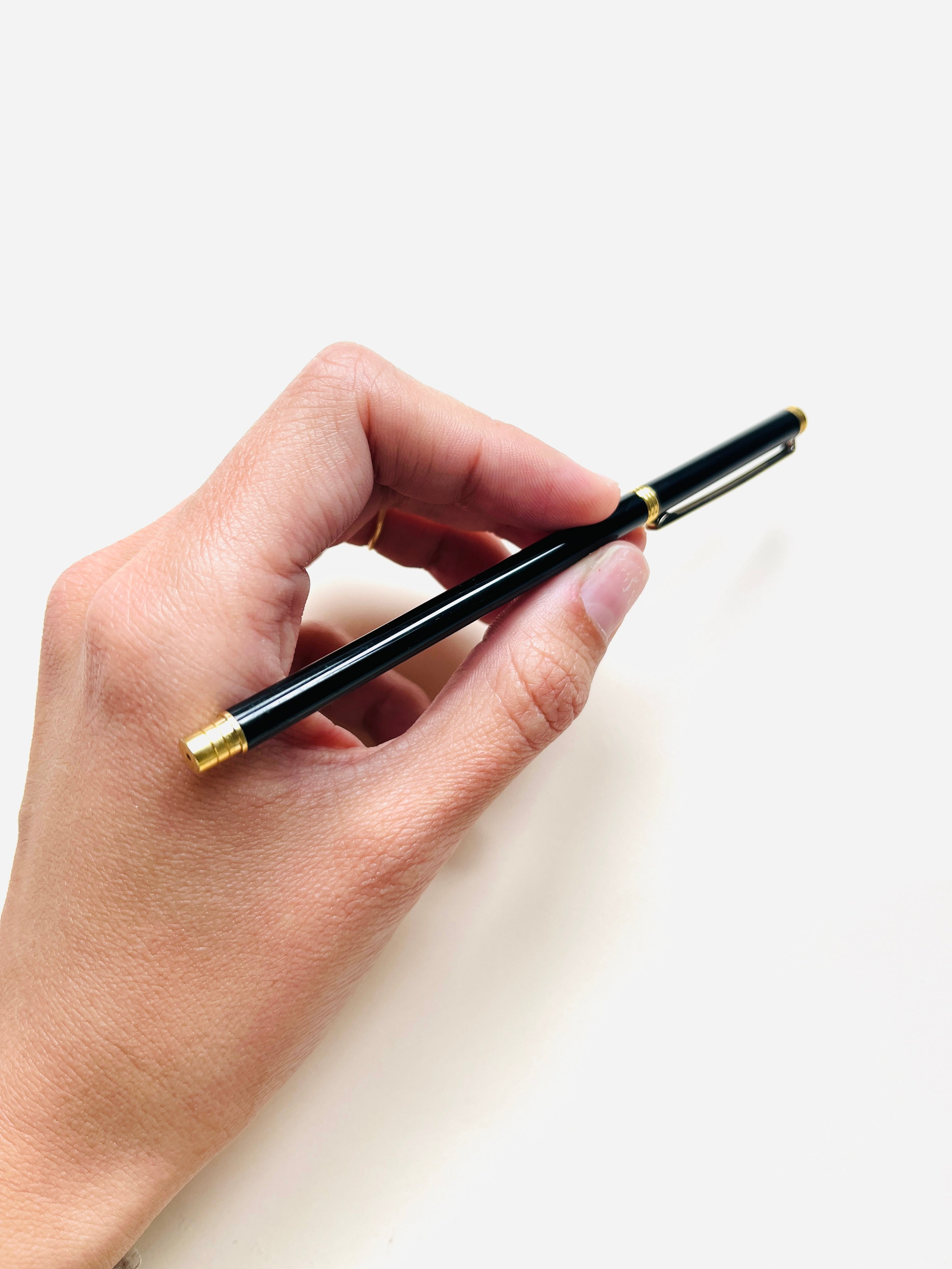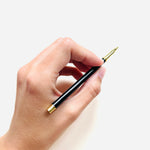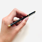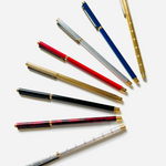 Bolígrafo vintage original de finales de los años 80 de primera mano. Tamaño ultrafino, estructura dorada y esmaltado en color negro. Recambio de mina nuevo incluido.