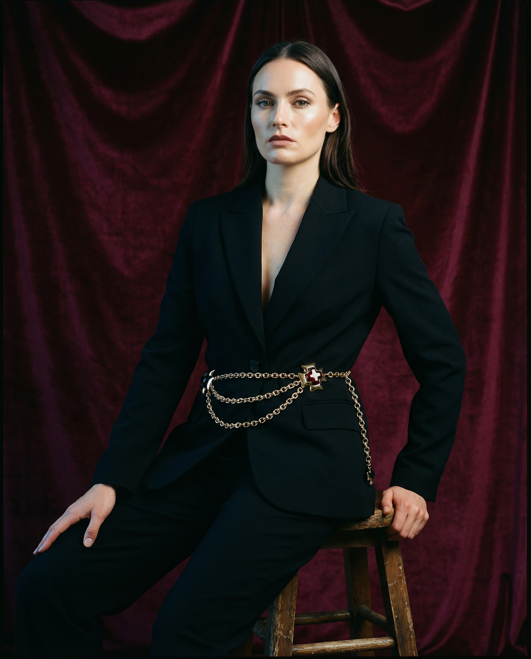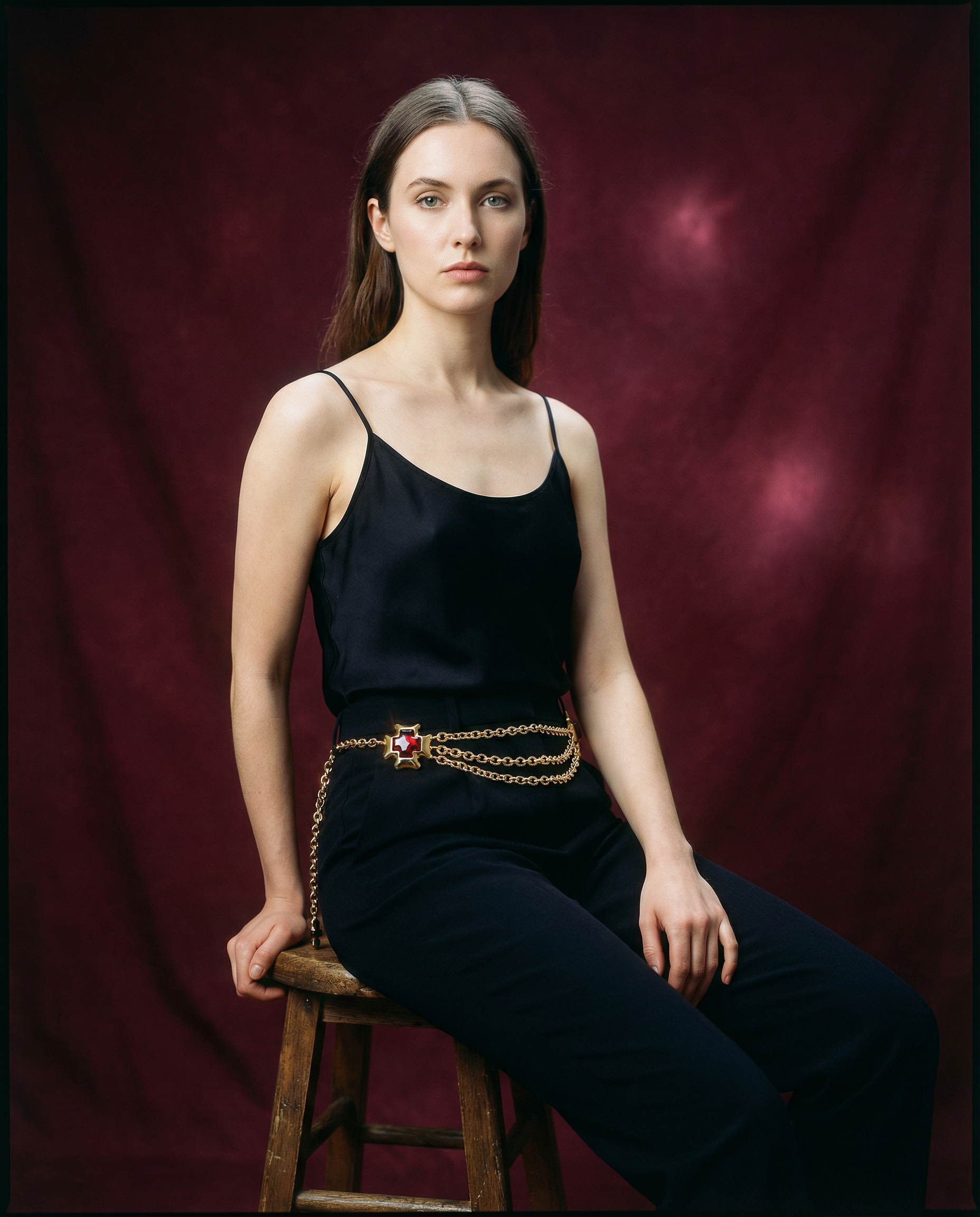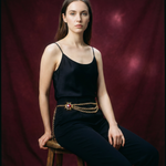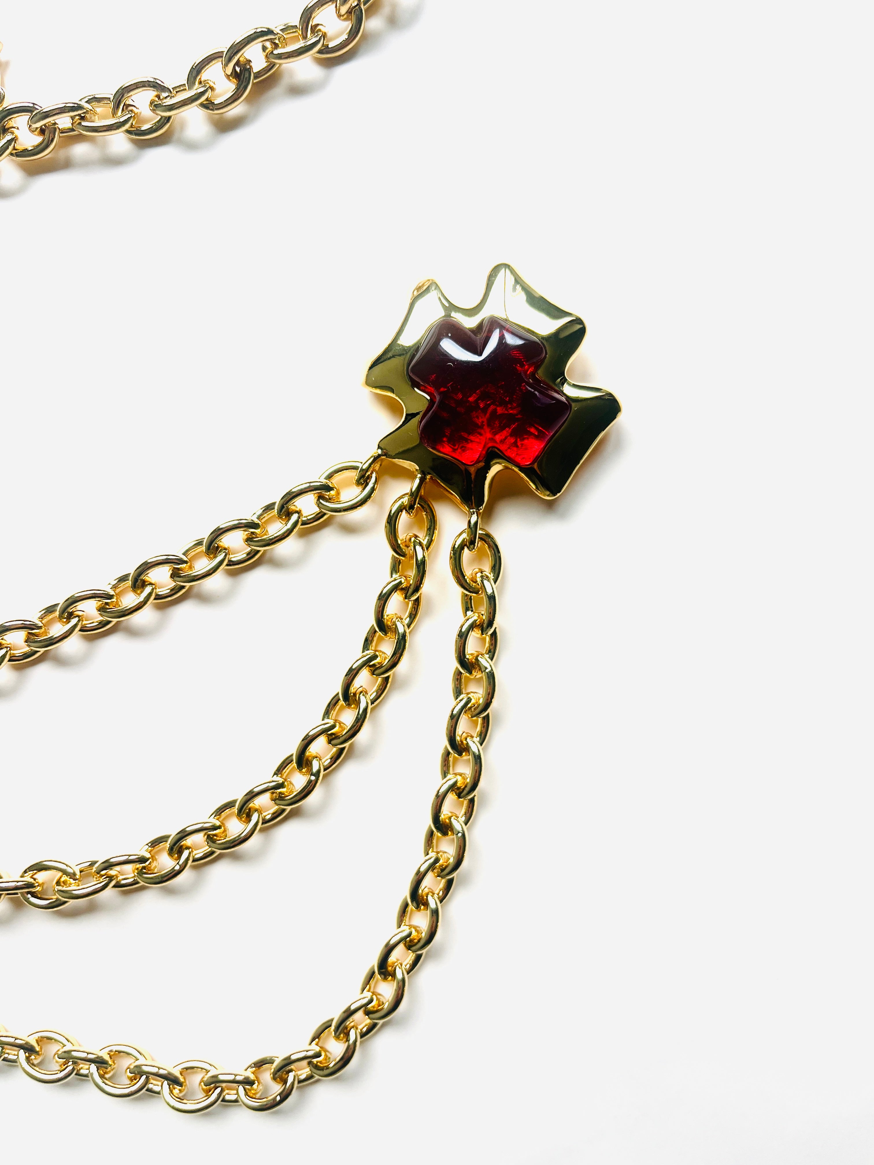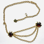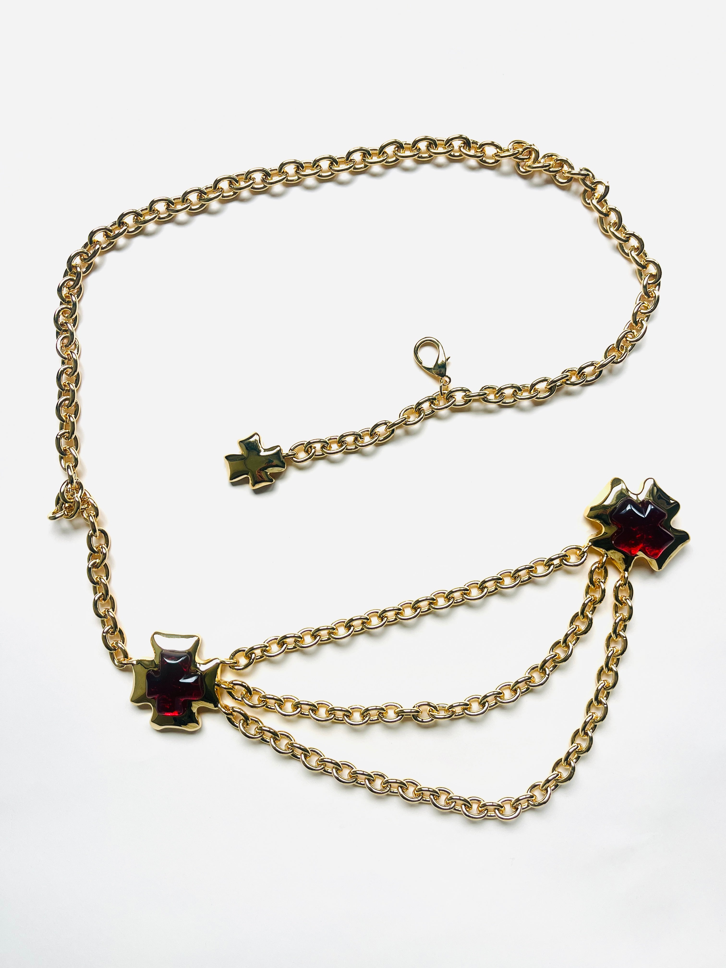 Maxi belt of vintage gold chains with red crystal in the shape of a cross from the brand Les Bernard VO (Made in USA).