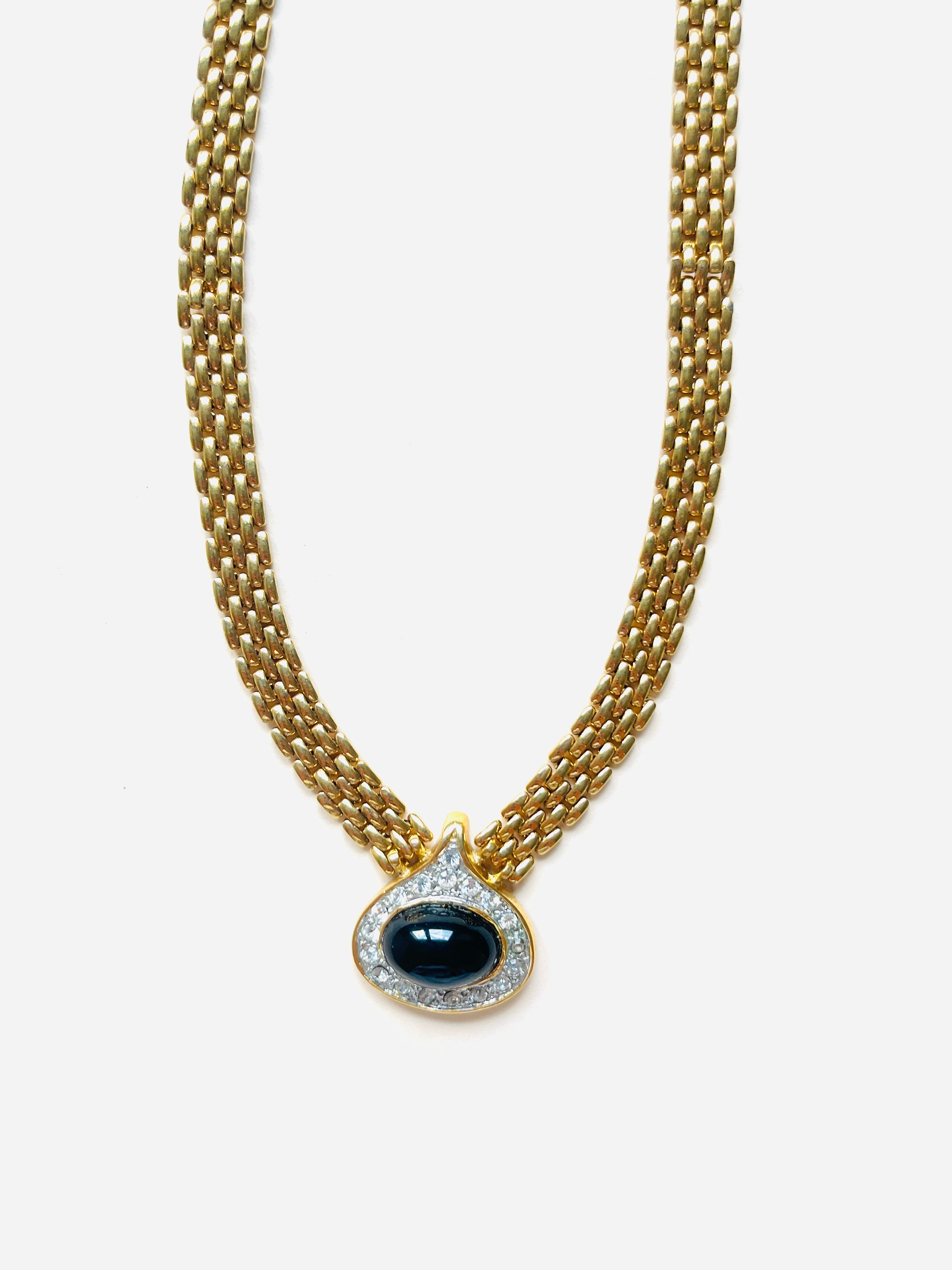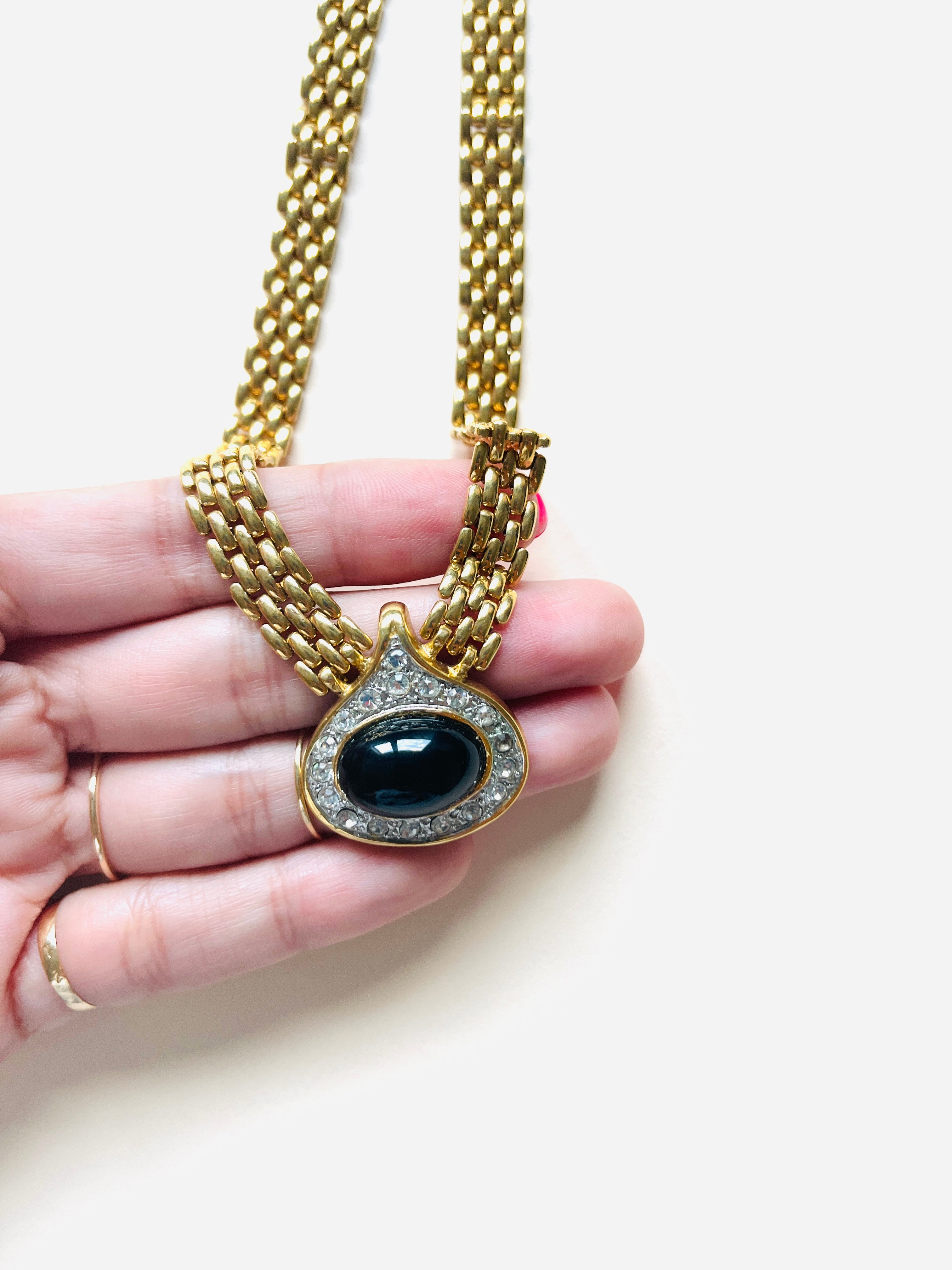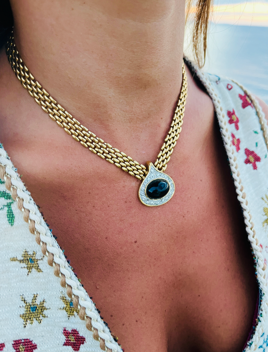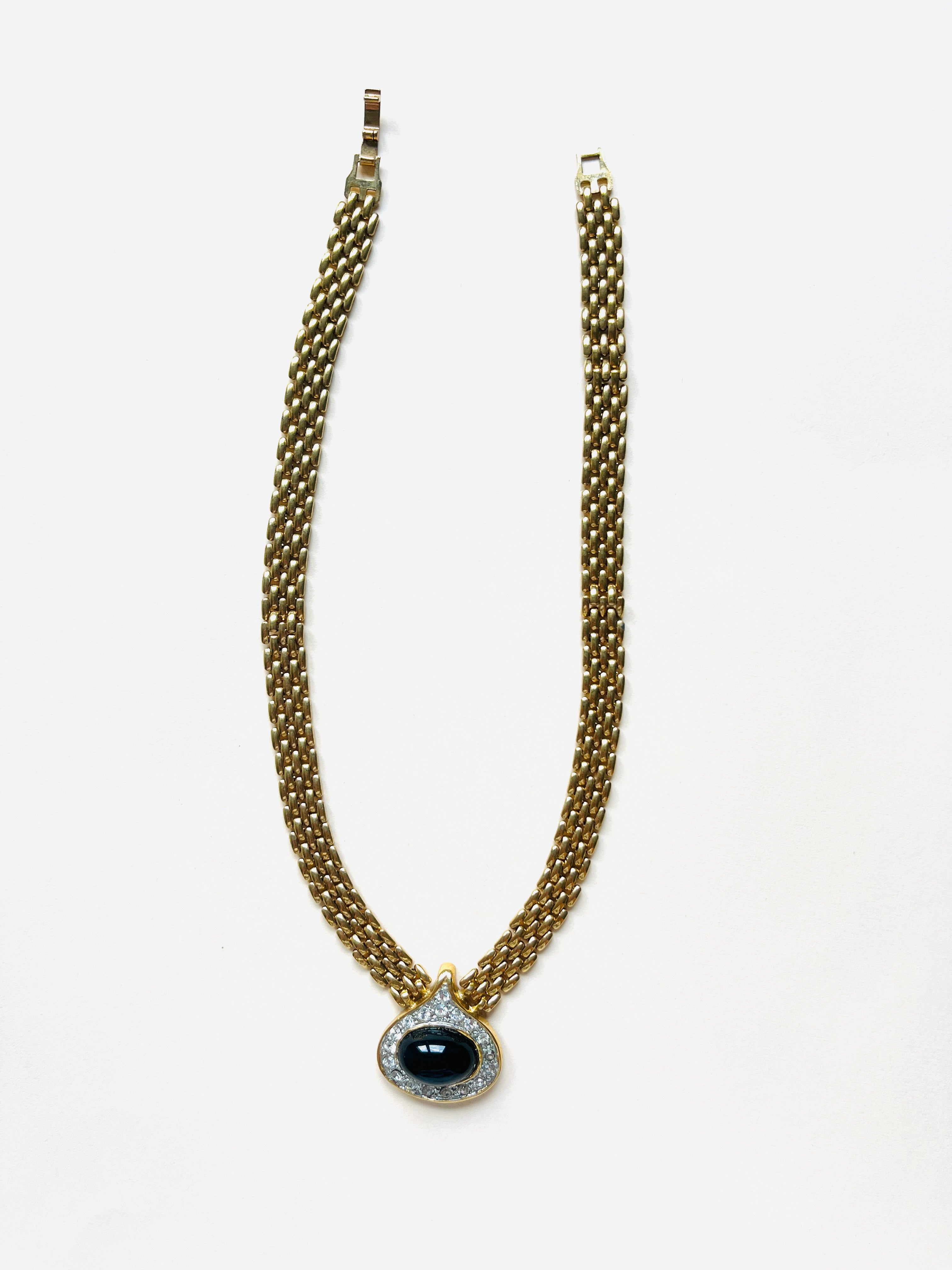 Collar vintage original de los años 90. Base dorada con cadena de eslabones bismark en dorado, piedra central negra y apliques de cristal blanco.