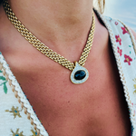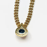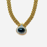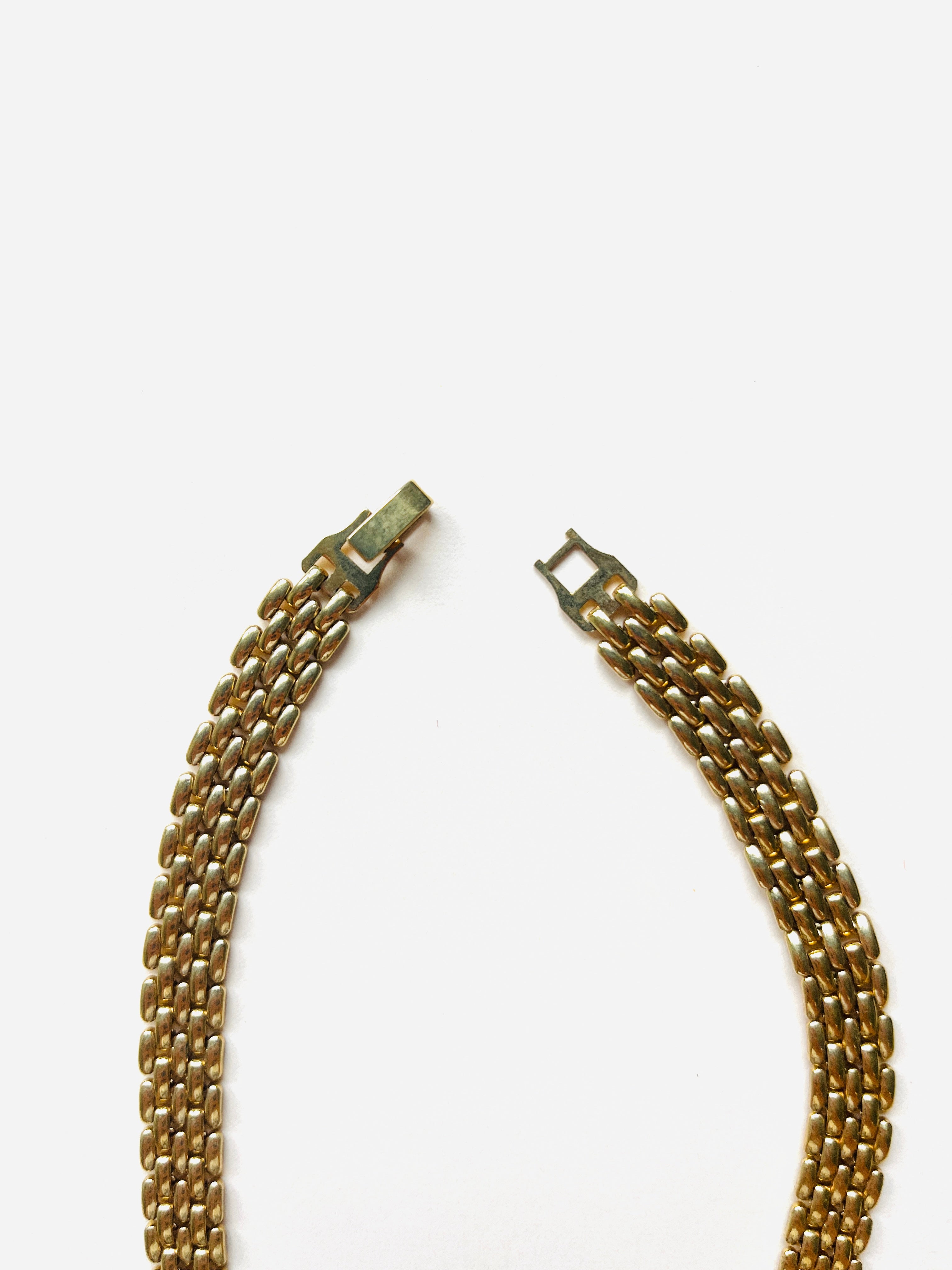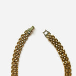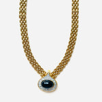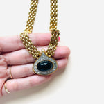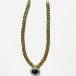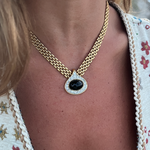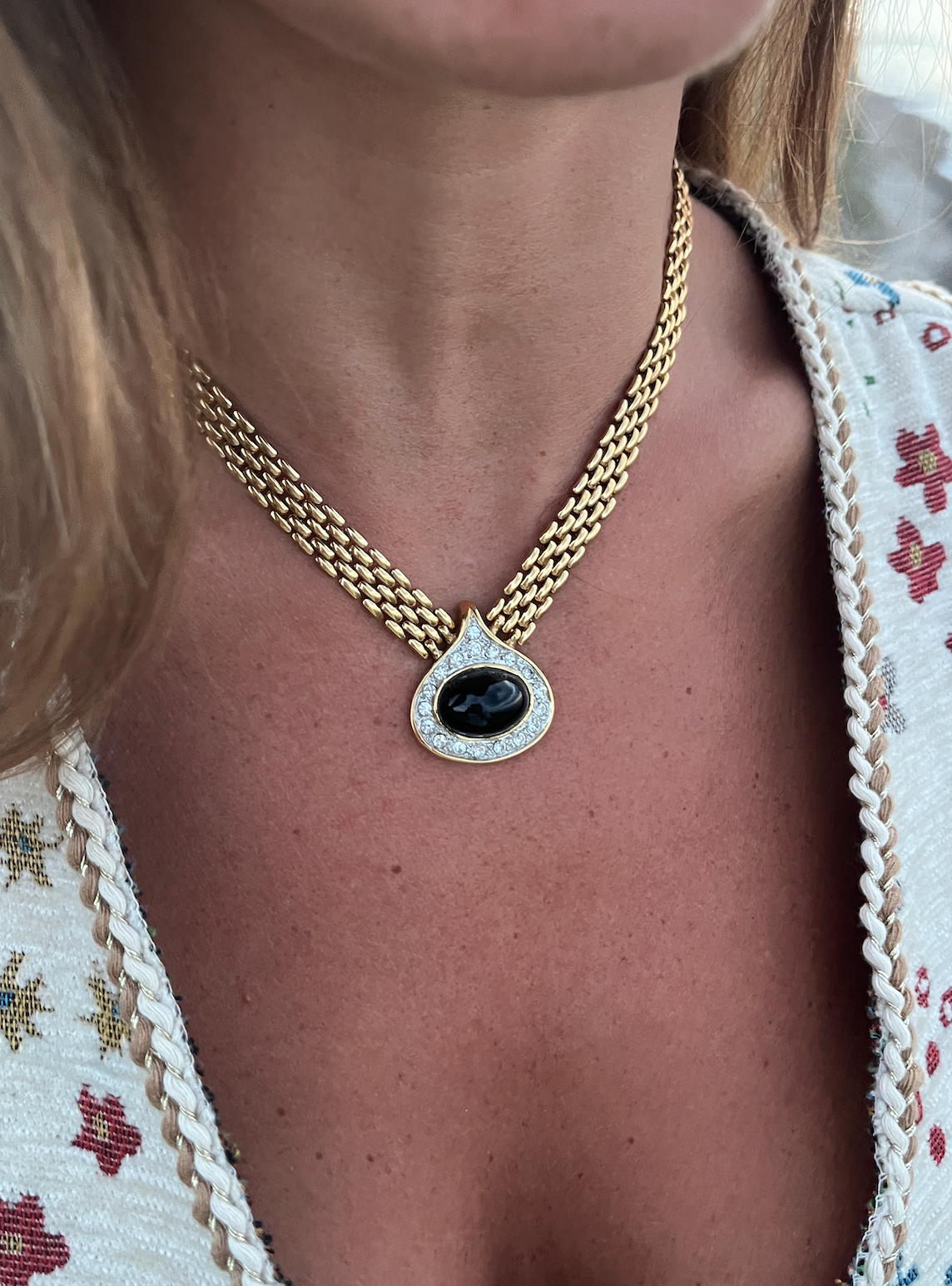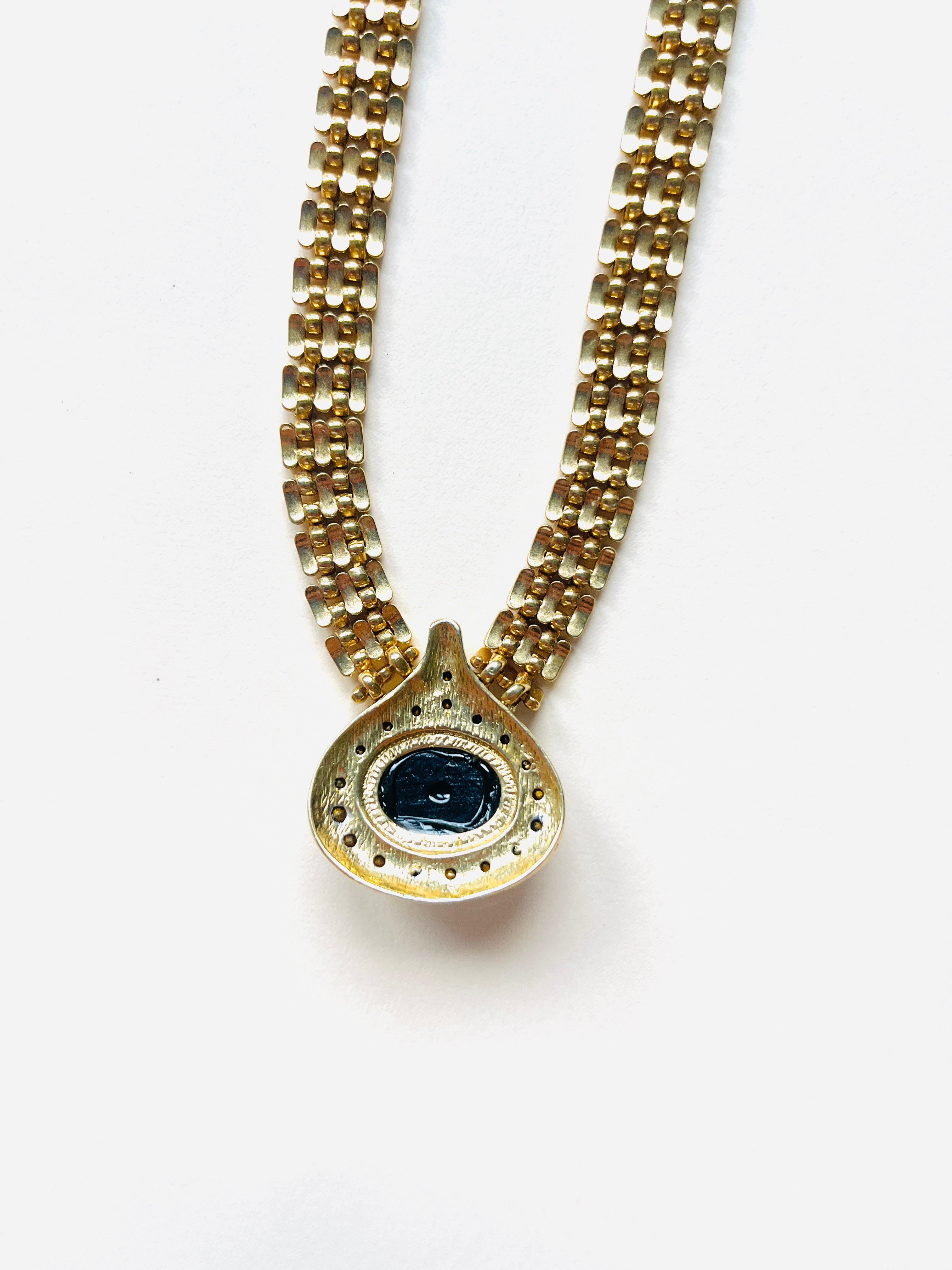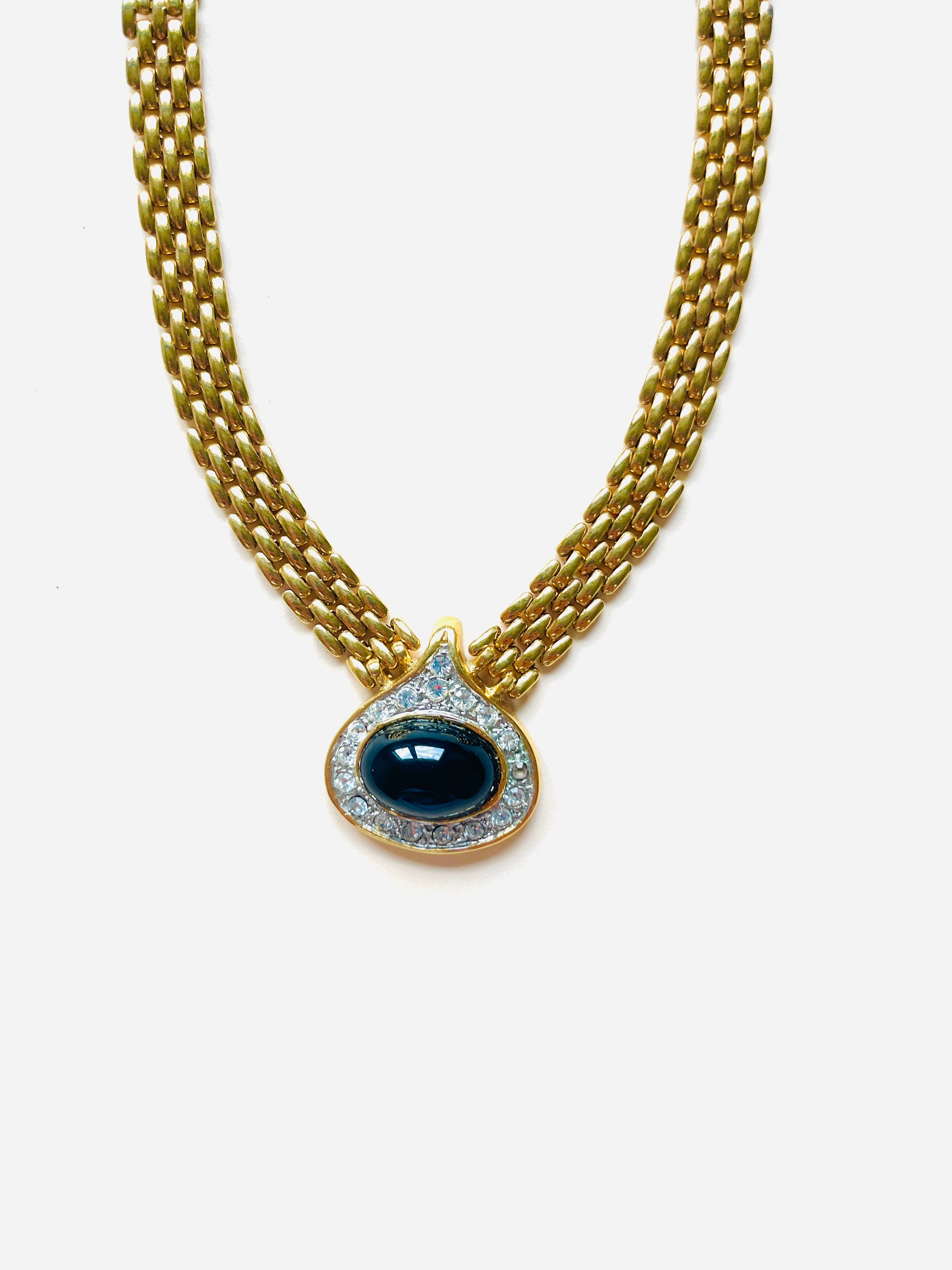 Collar vintage original de los años 90. Base dorada con cadena de eslabones bismark en dorado, piedra central negra y apliques de cristal blanco.