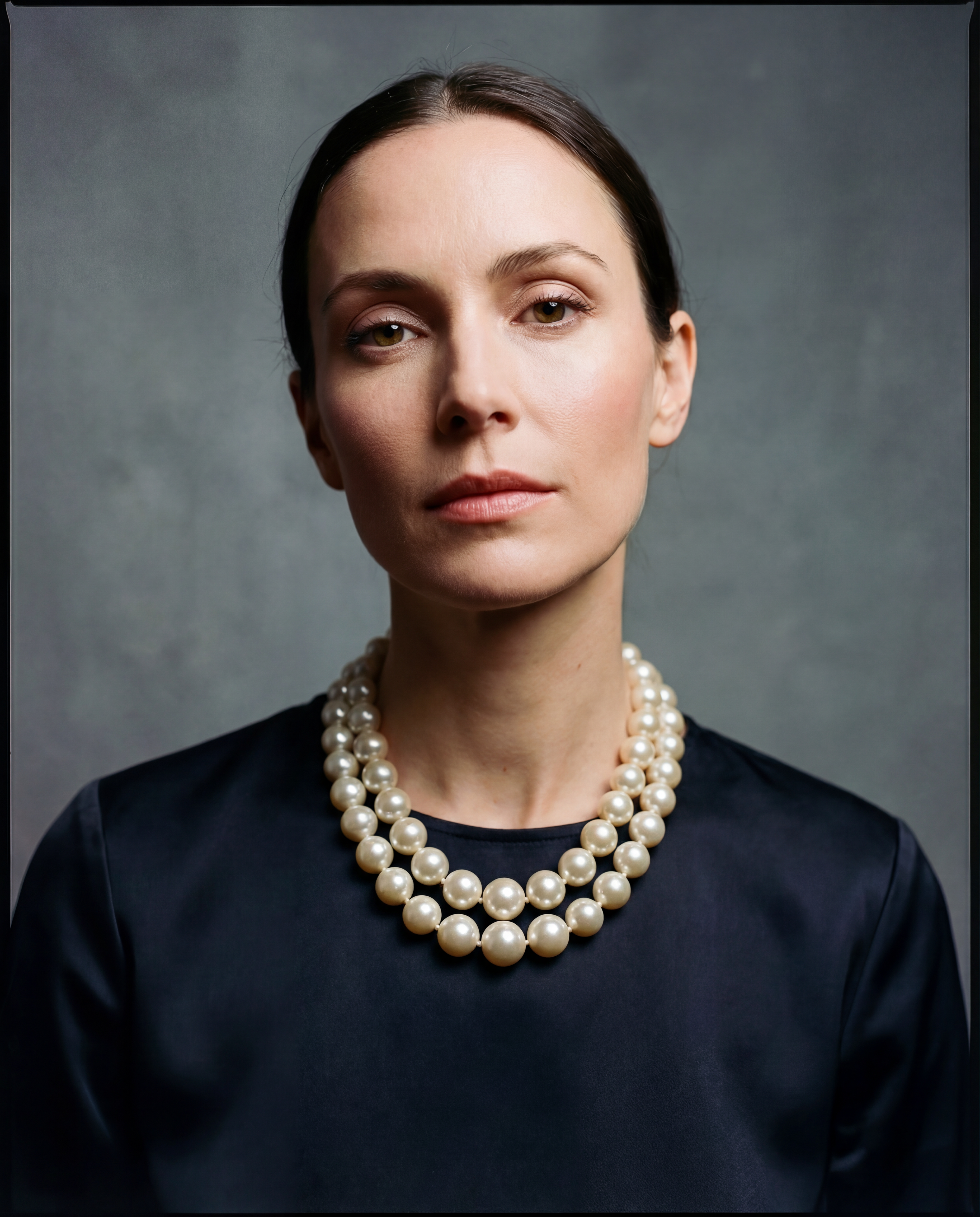 Maxi collar vintage original de los años 90. Perla beige con doble vuelta y cierre doble en plata.