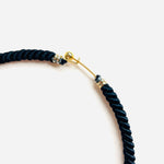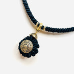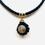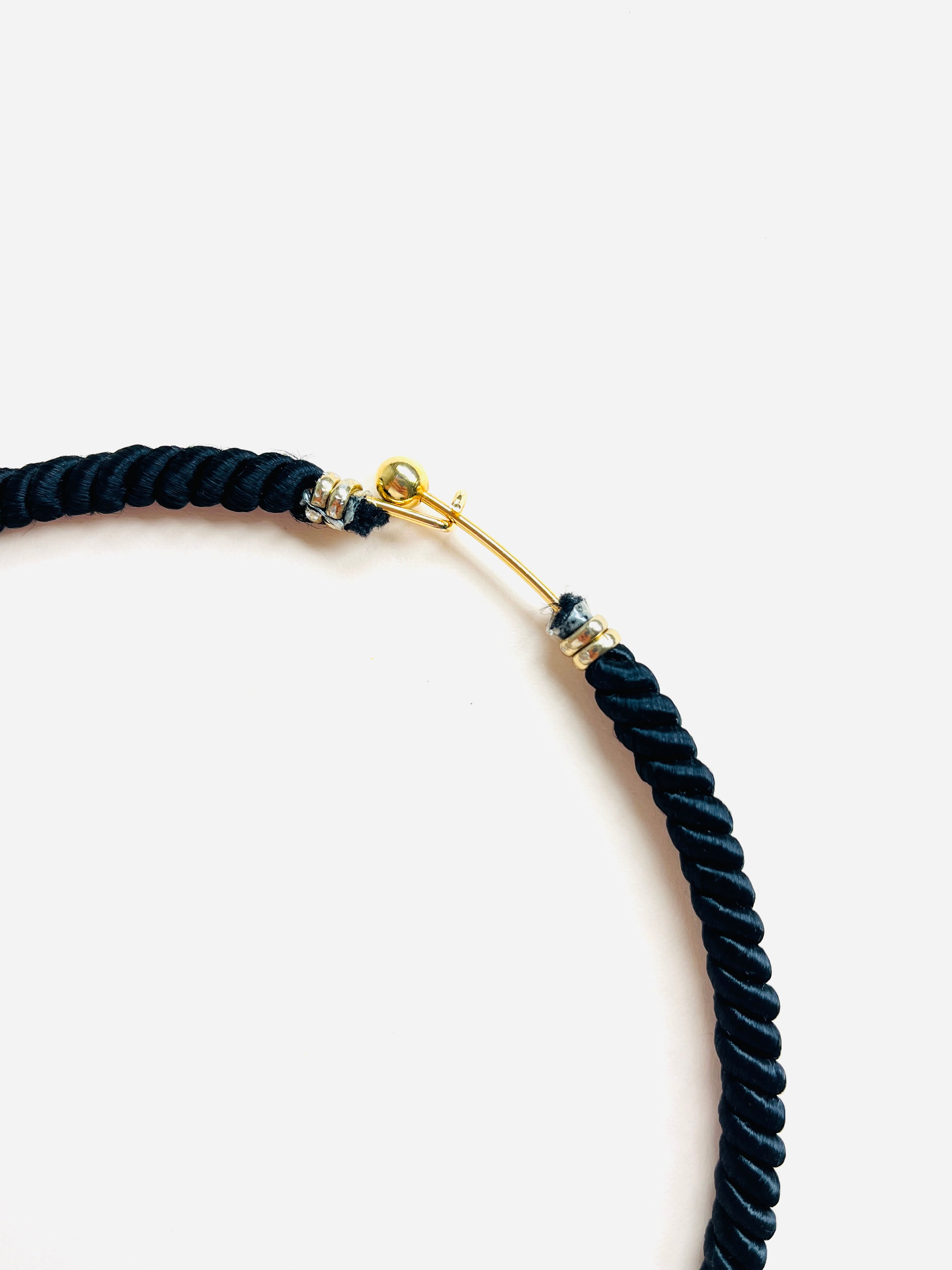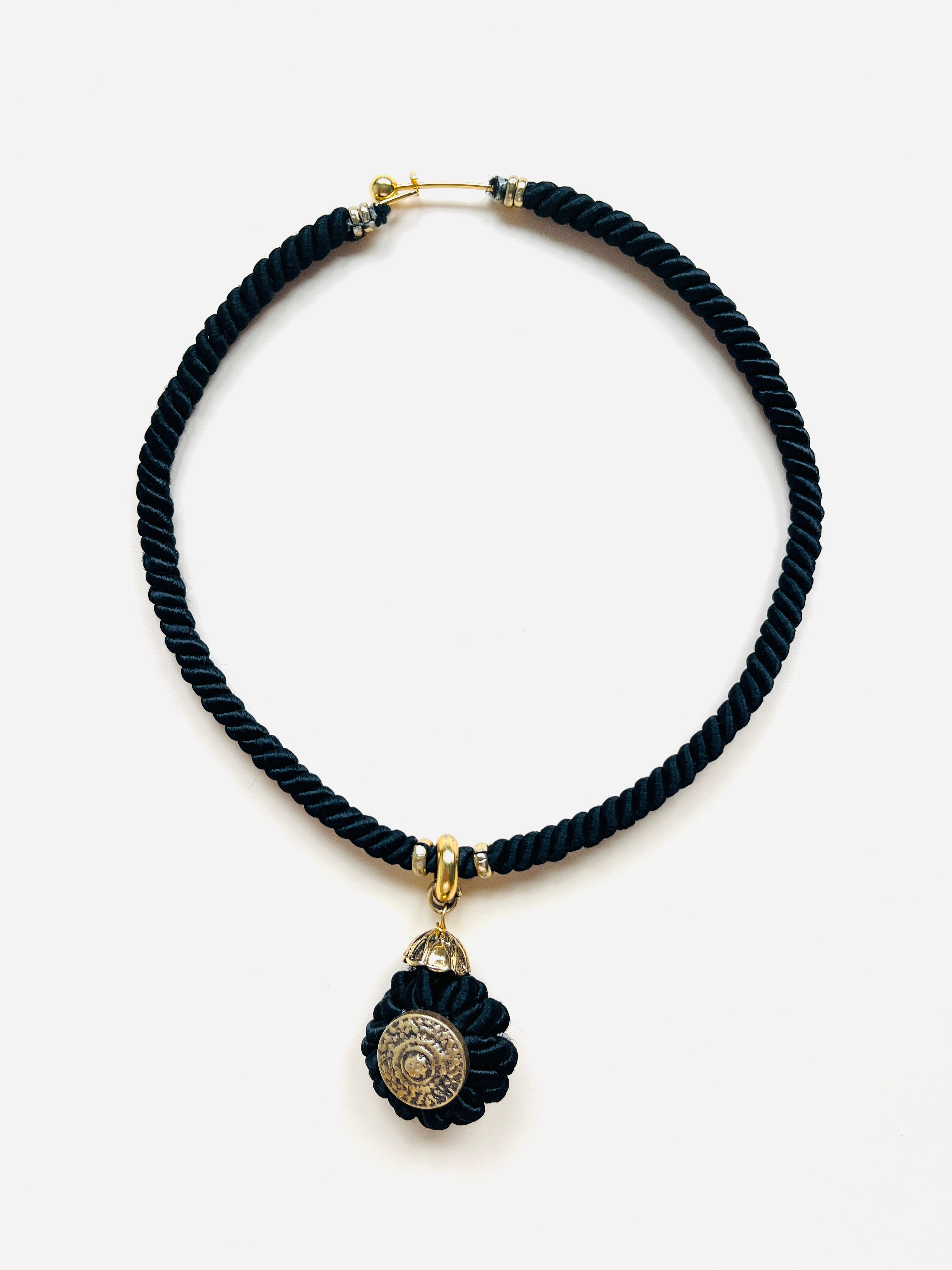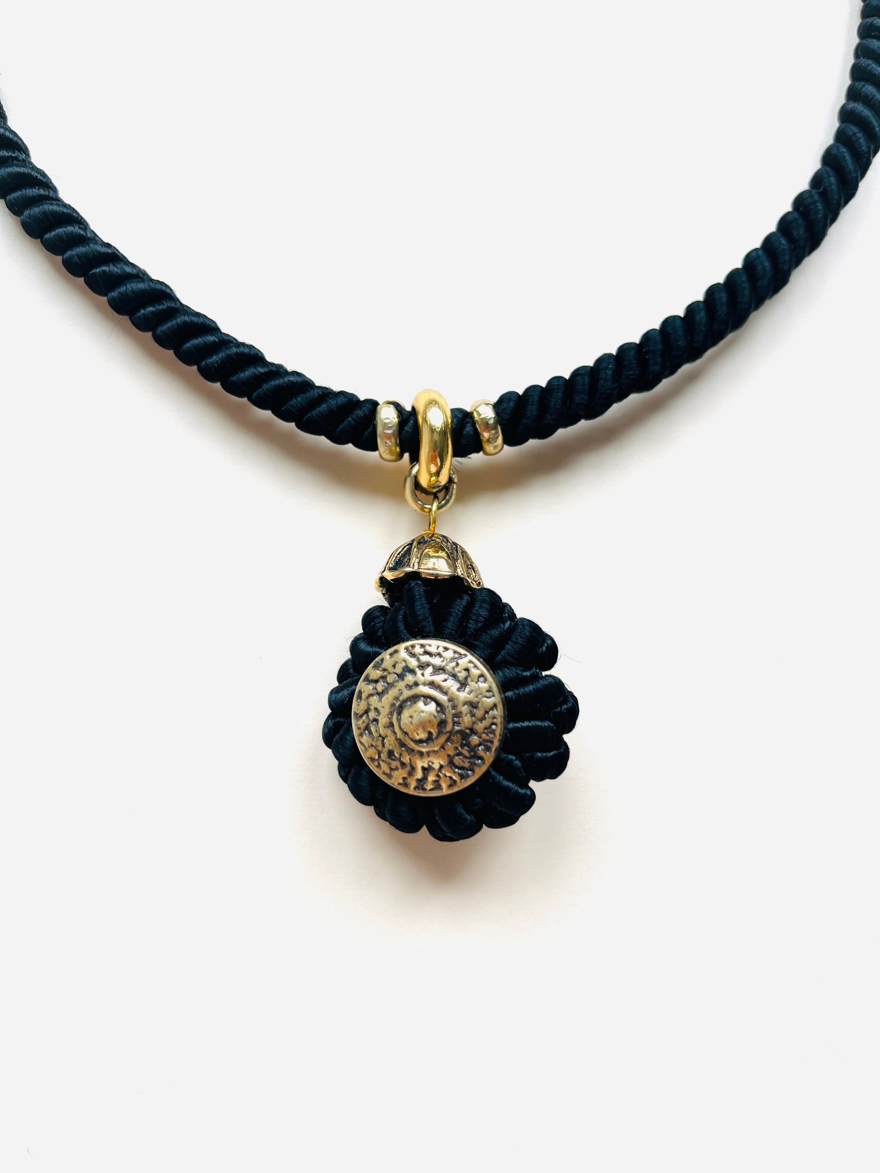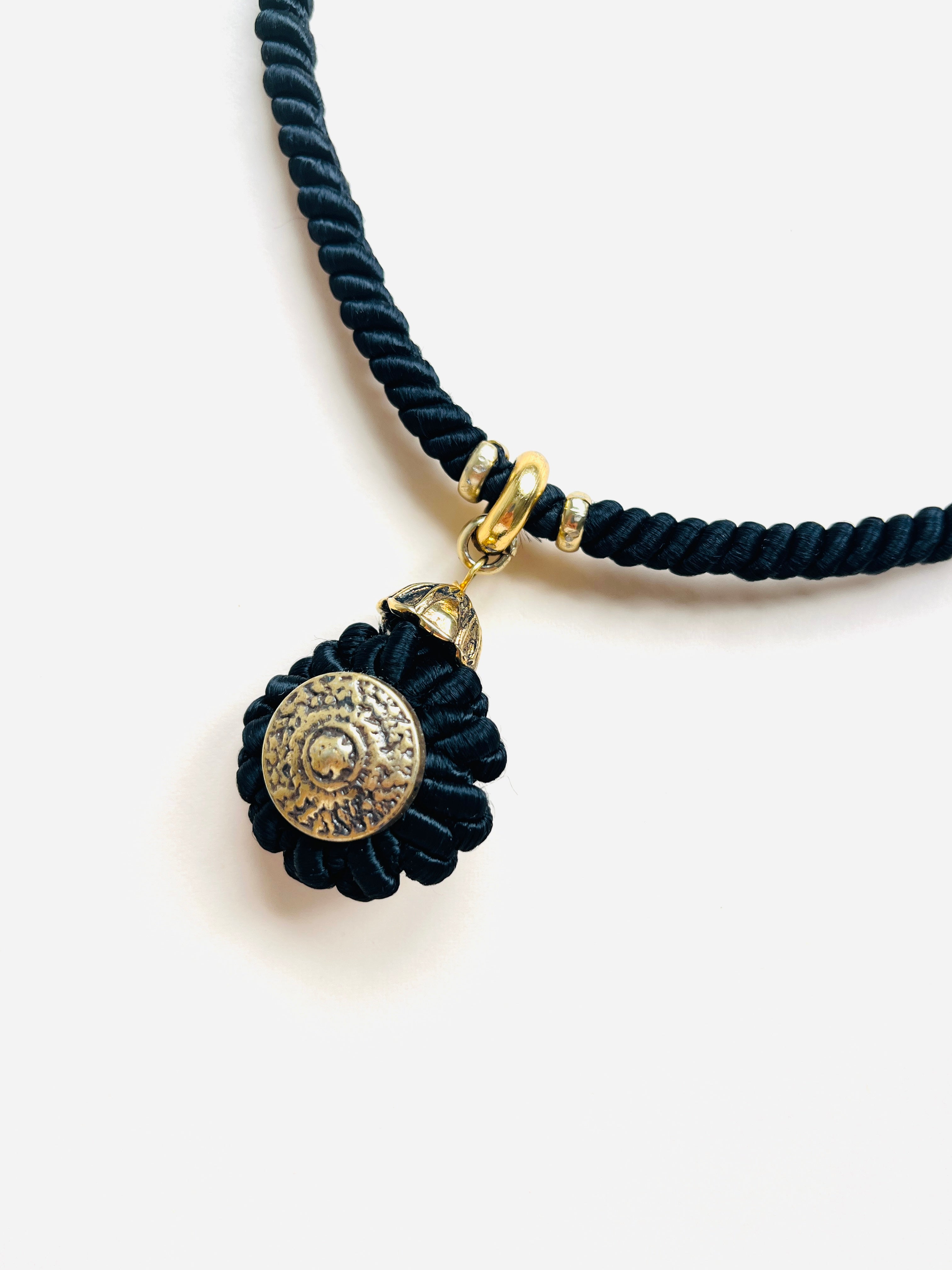 Gargantilla vintage original de los años 90. Estructura rígida decorada con hilo negro y colgante redondo con detalle en dorado.