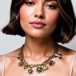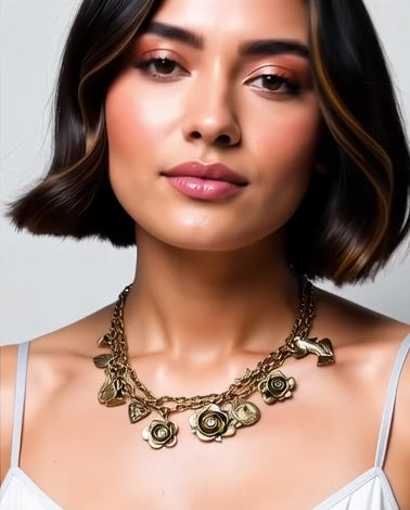 Collar vintage original de los años 80. Base dorada con doble cadena con colgantes en forma de rosa, corazón y animal con apliques en cristal y perla blanca.