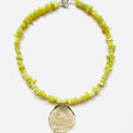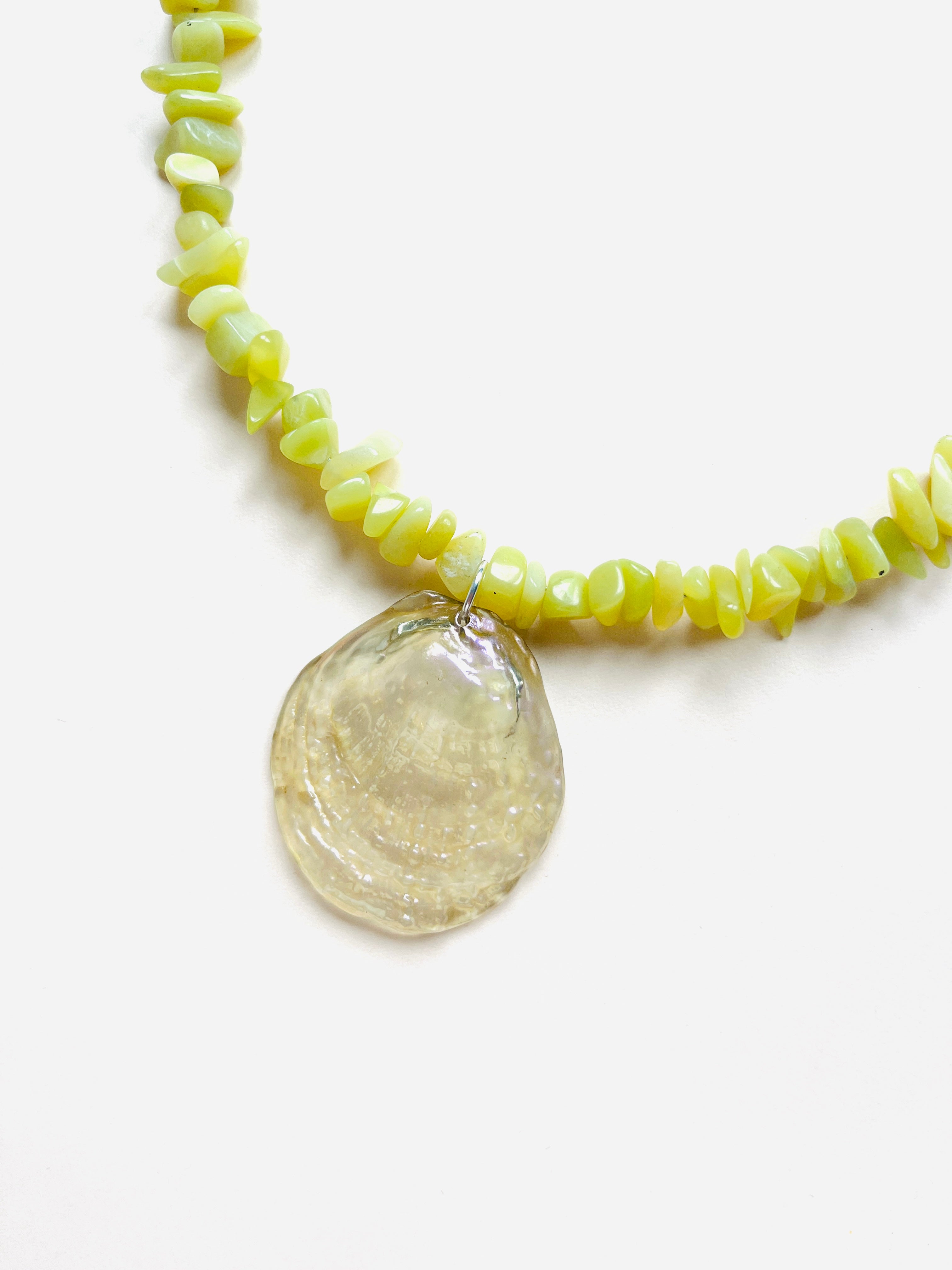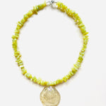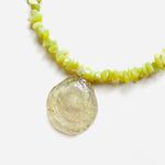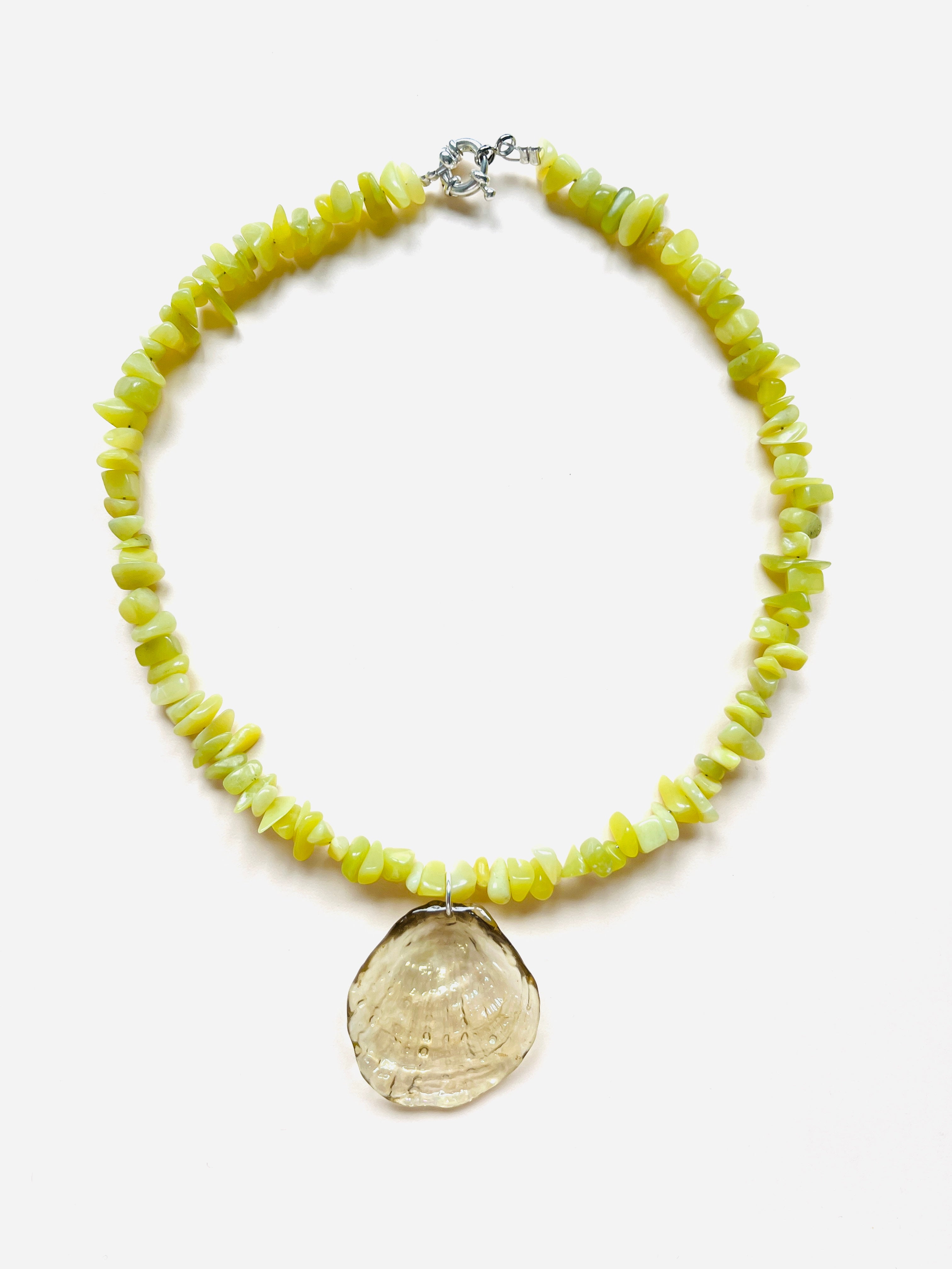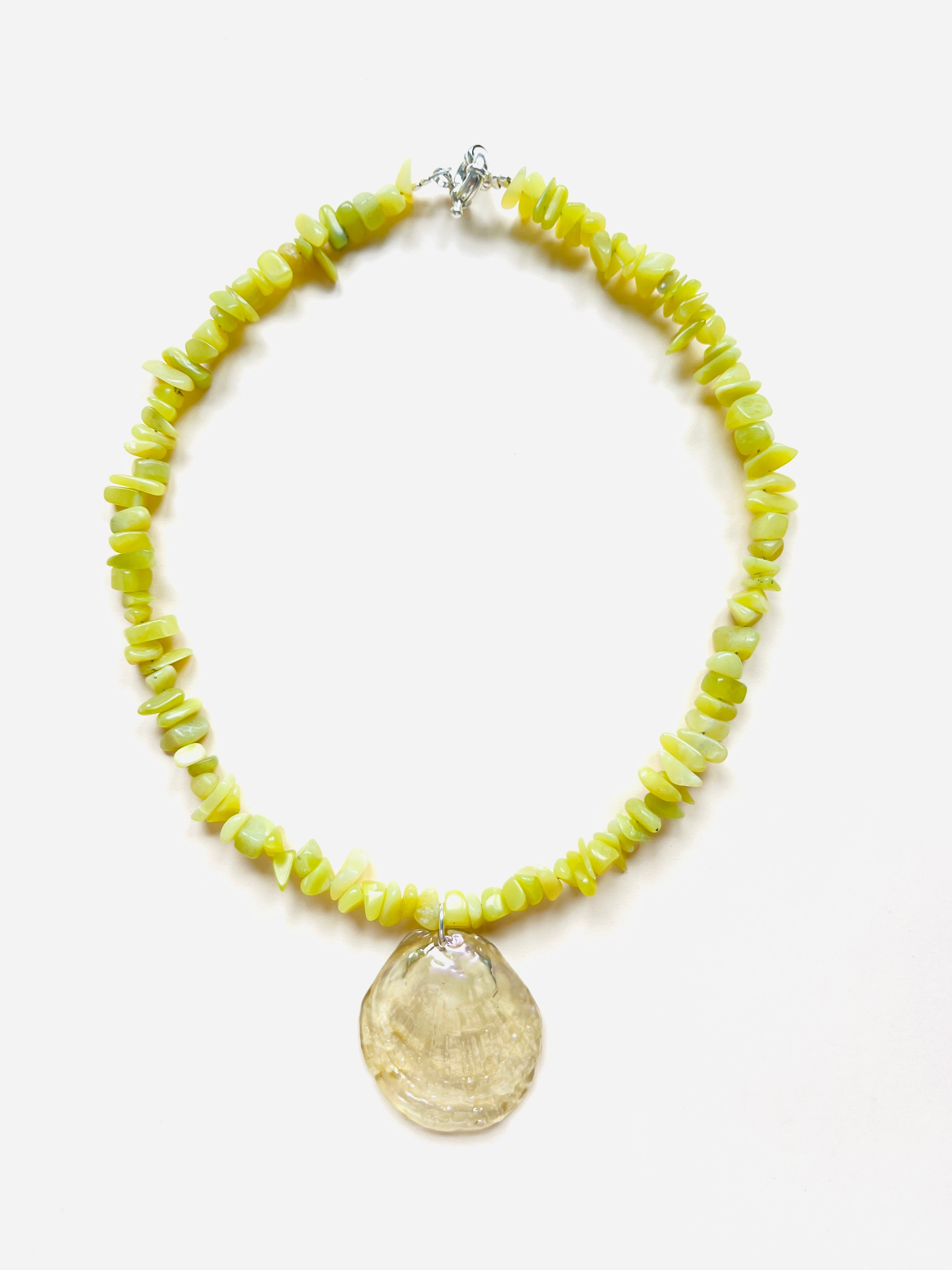 Collar vintage original de los años 90. Cierre plata con cadena de piedras naturales y colgante semi transparente en color amarillo y cierre de reasa.