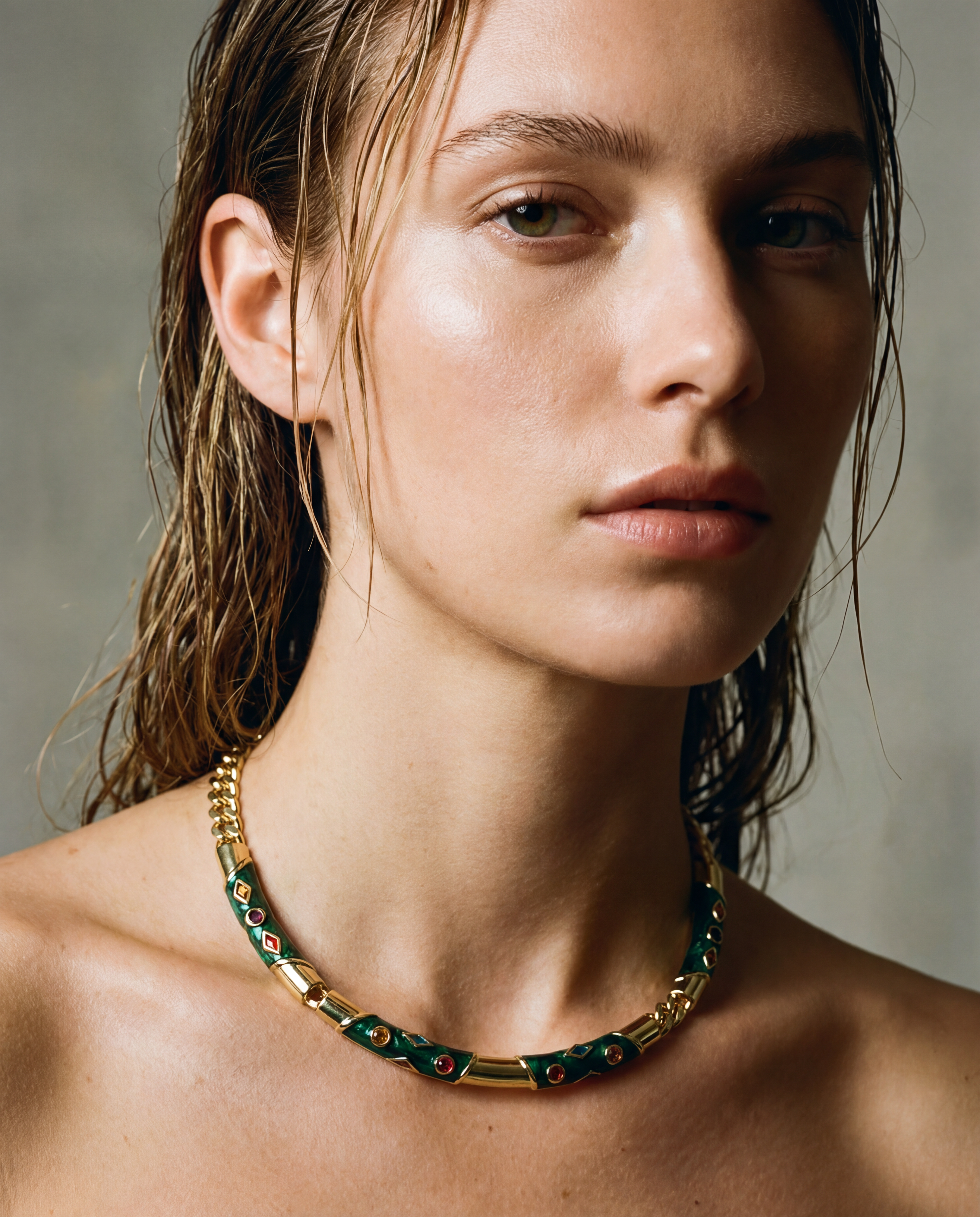 Gargantilla vintage original de los años 90. Cadena de eslabón y cierre de barra, chapado en oro y esmaltado verde con detalles multicolor tornasolados.