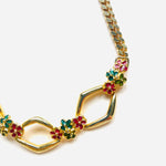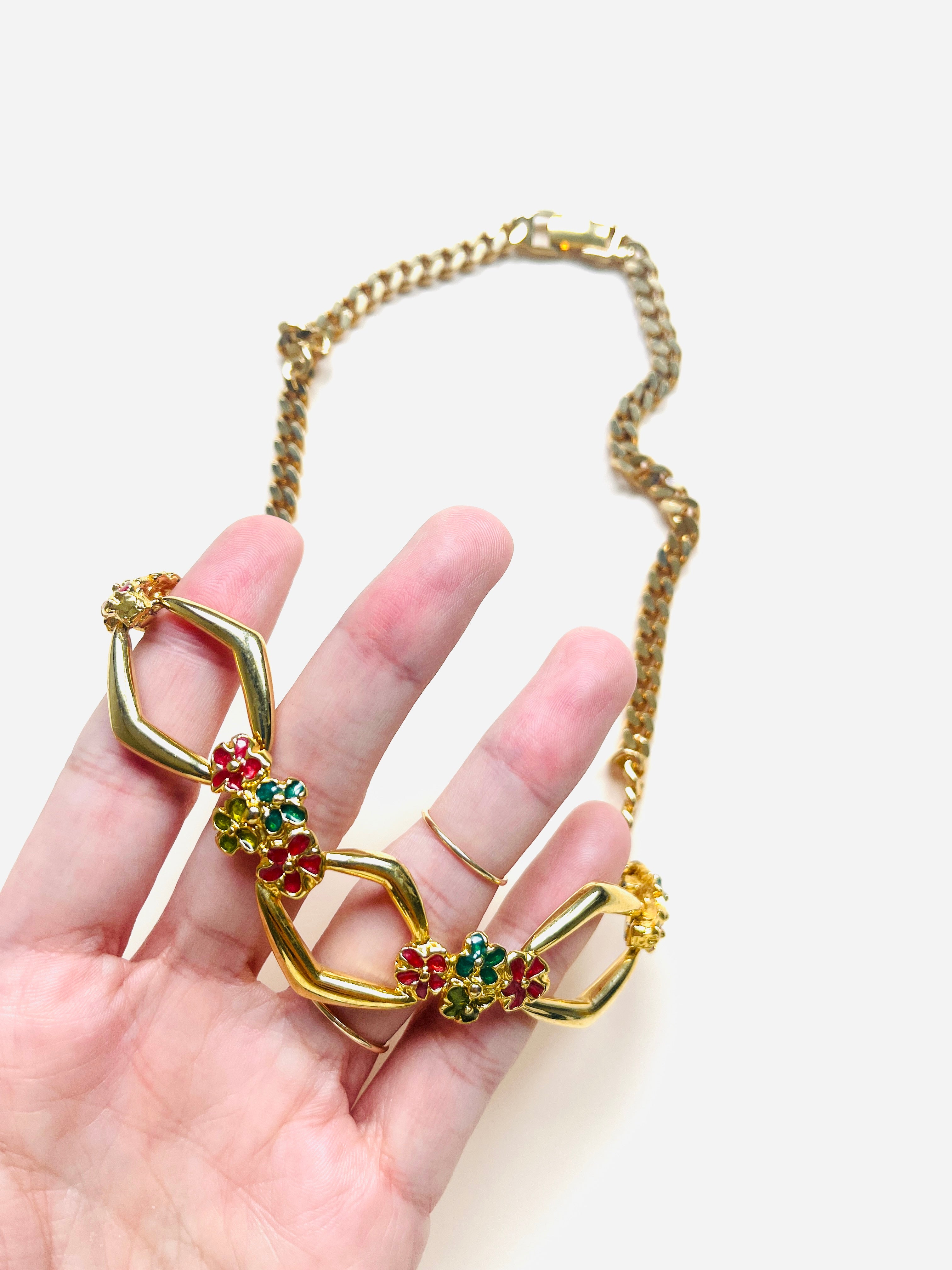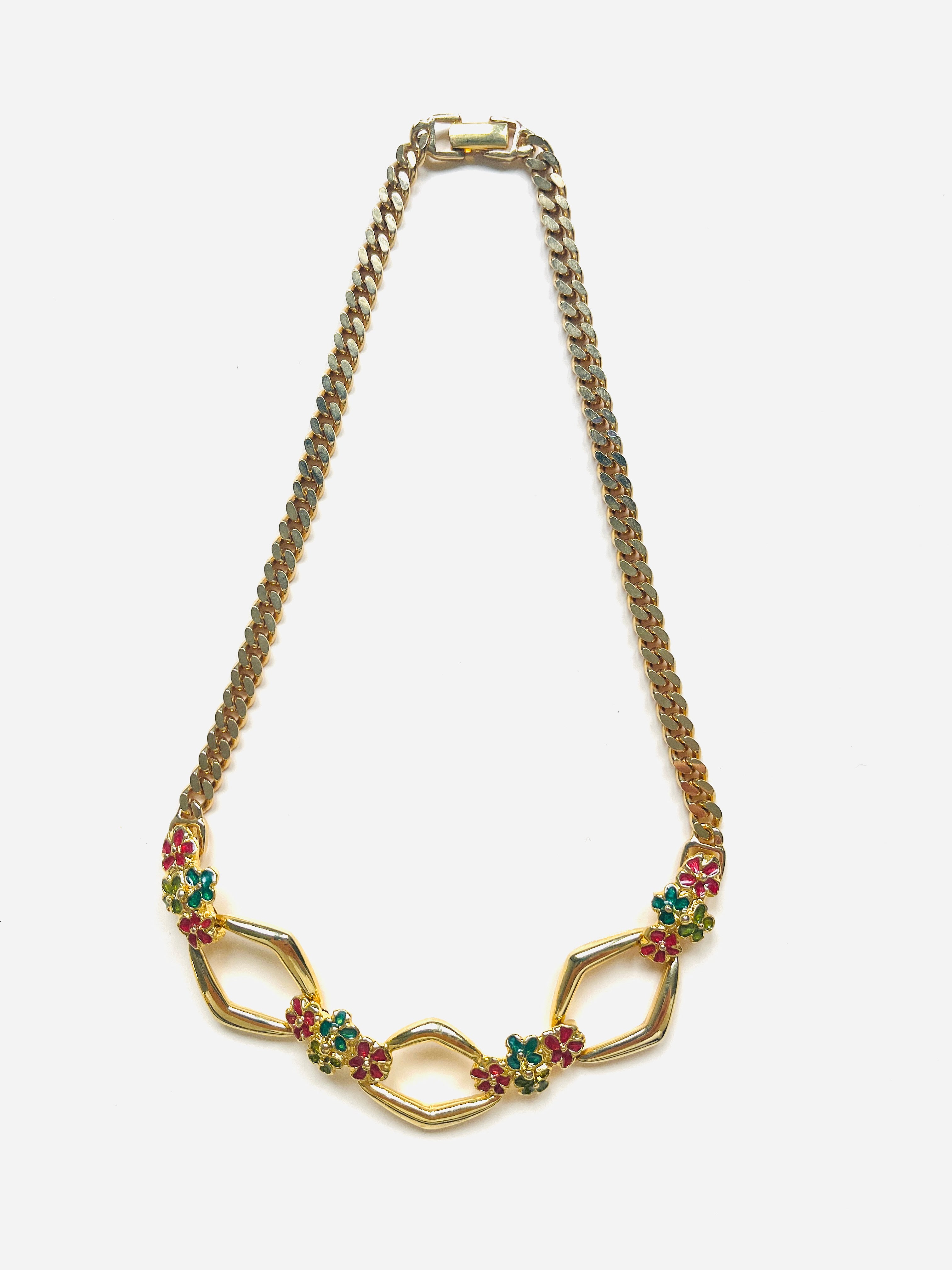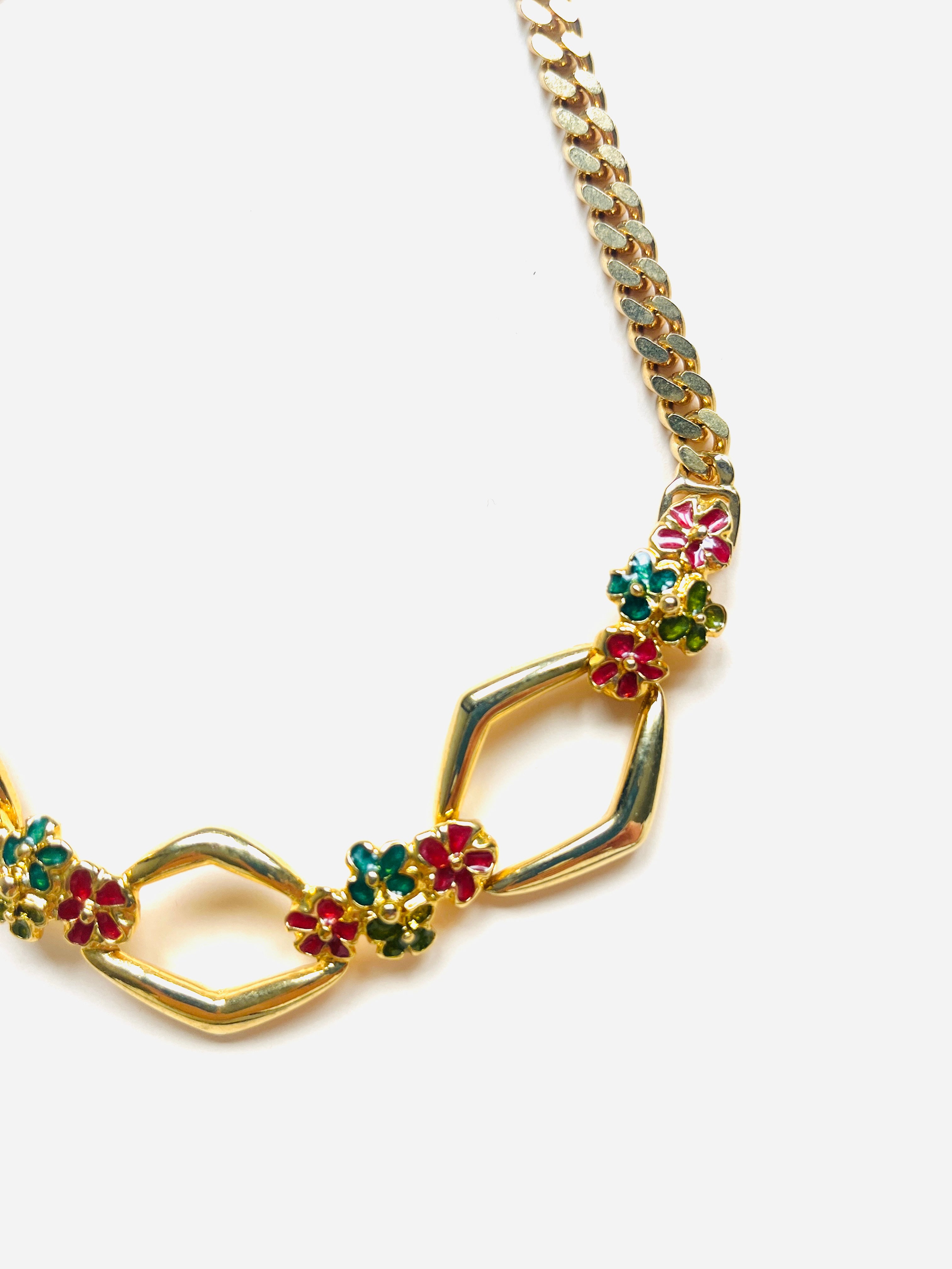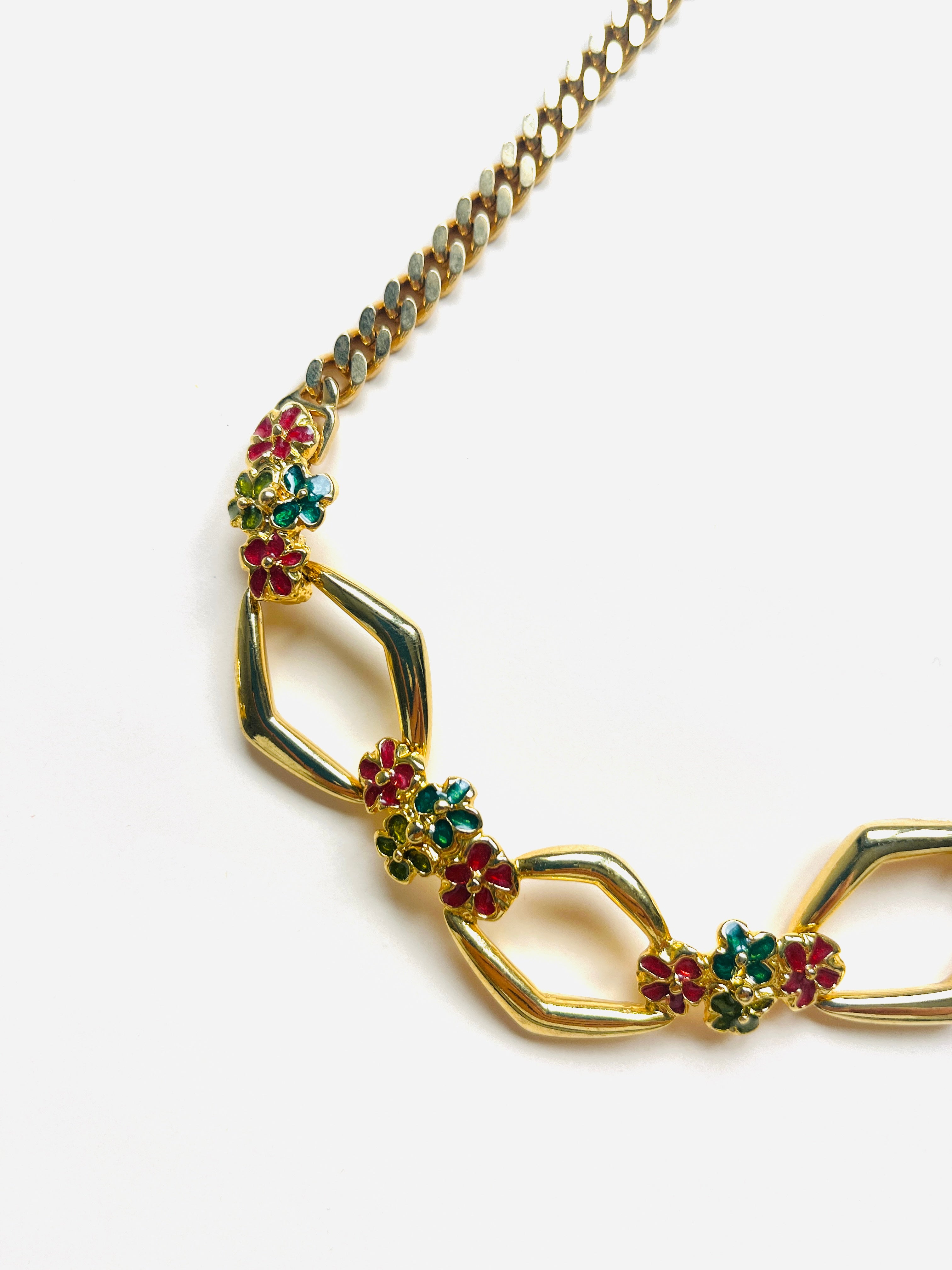 Gargantilla vintage dorada original de los años 90. Base dorada con detalles en forma de flor multicolor.