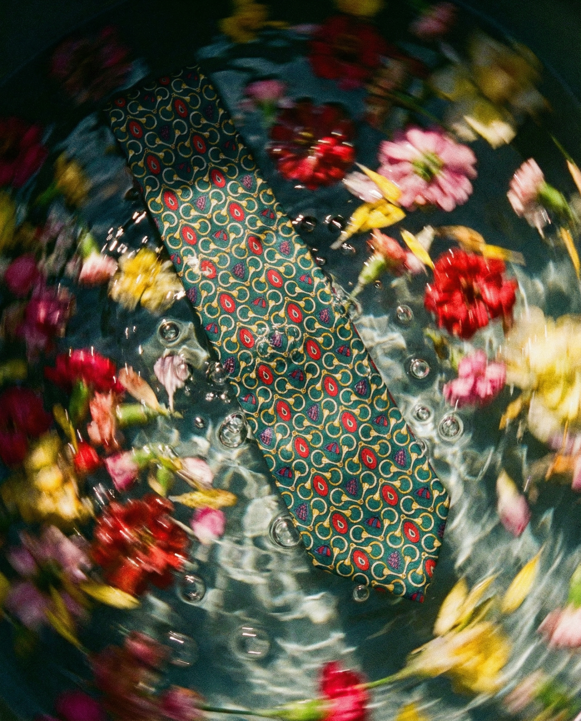 Corbata vintage original de los años 90. Base en color verde con dibujos de temática ecuestre en color amarillo y rojo.