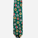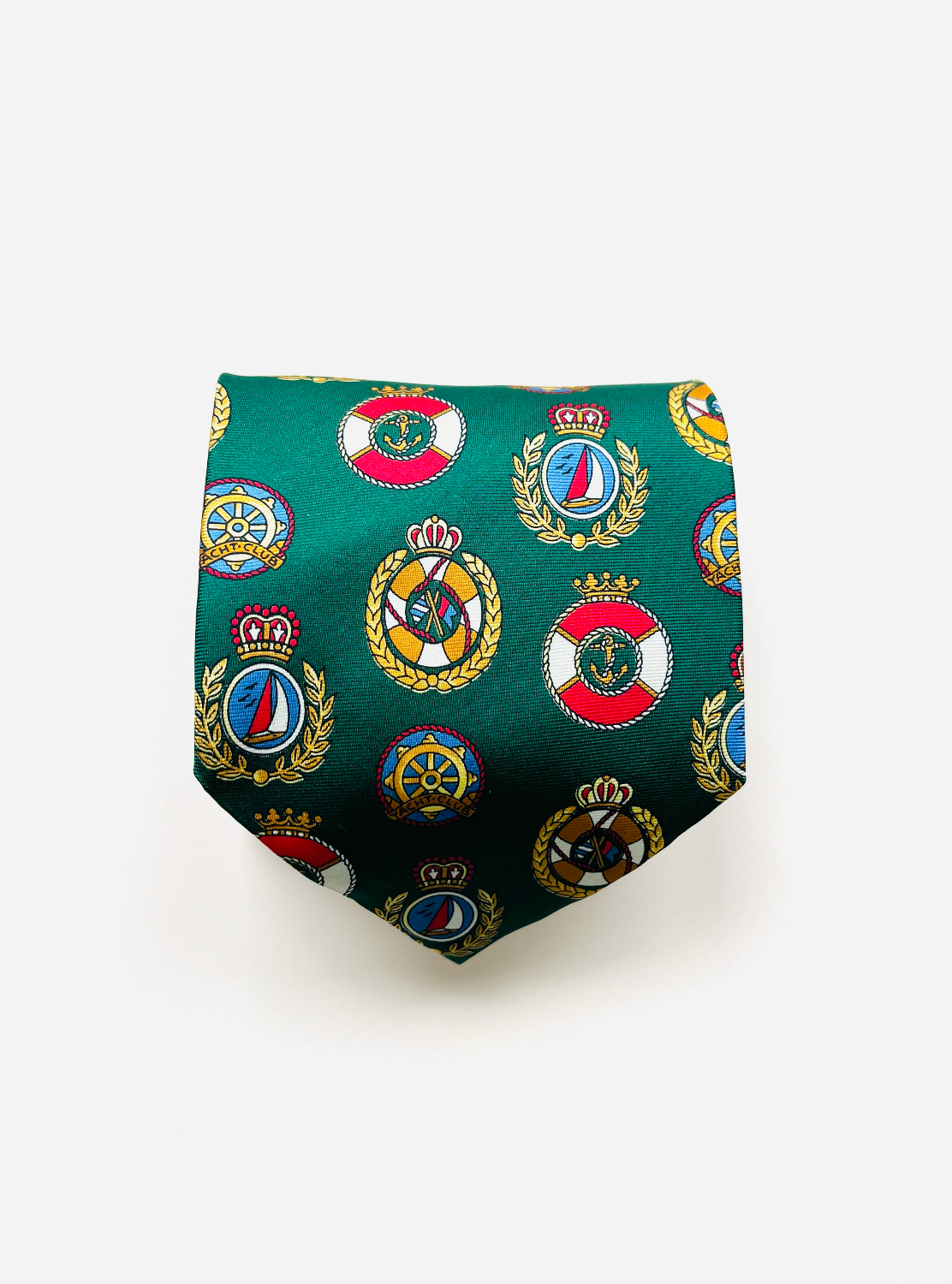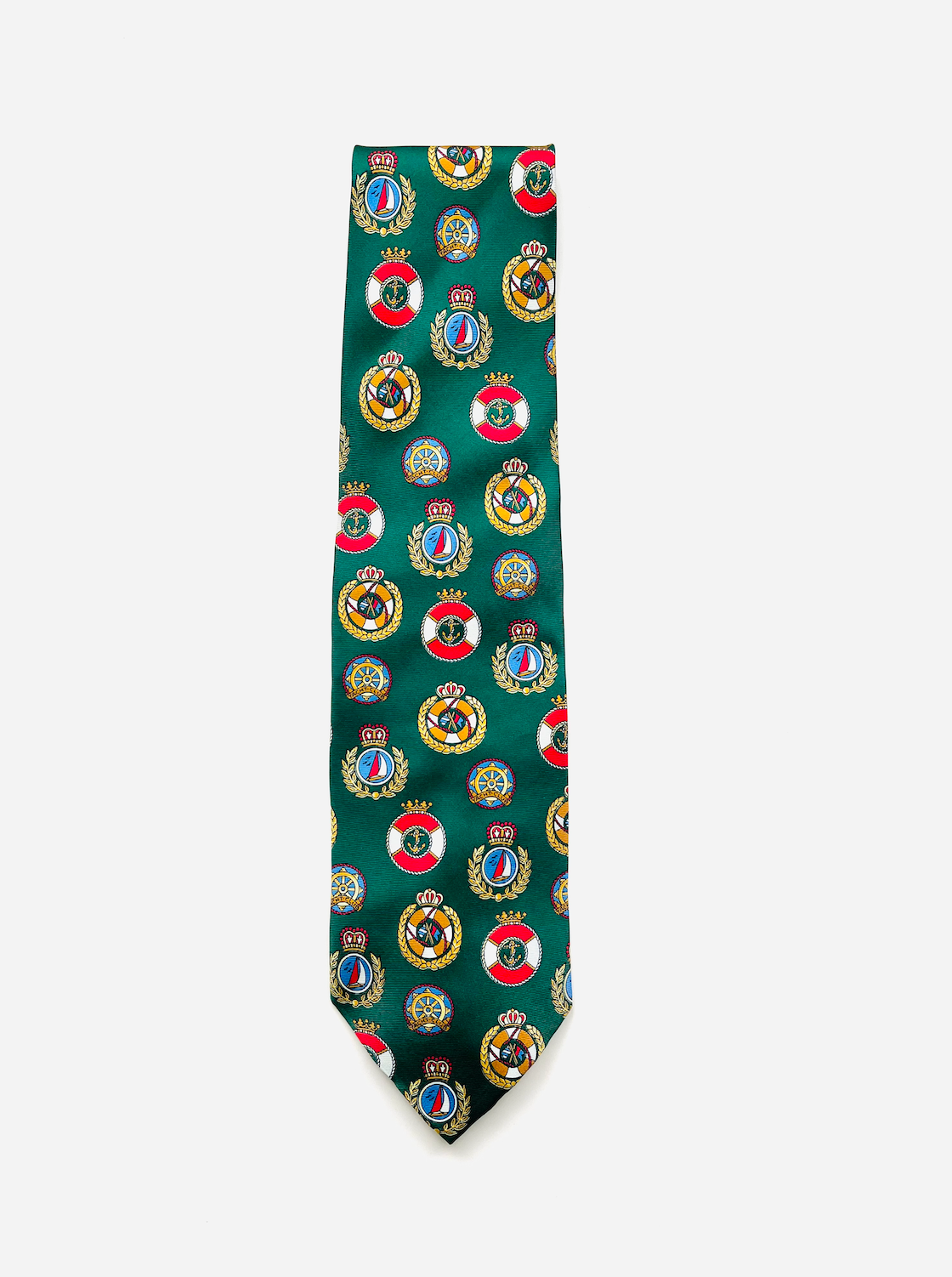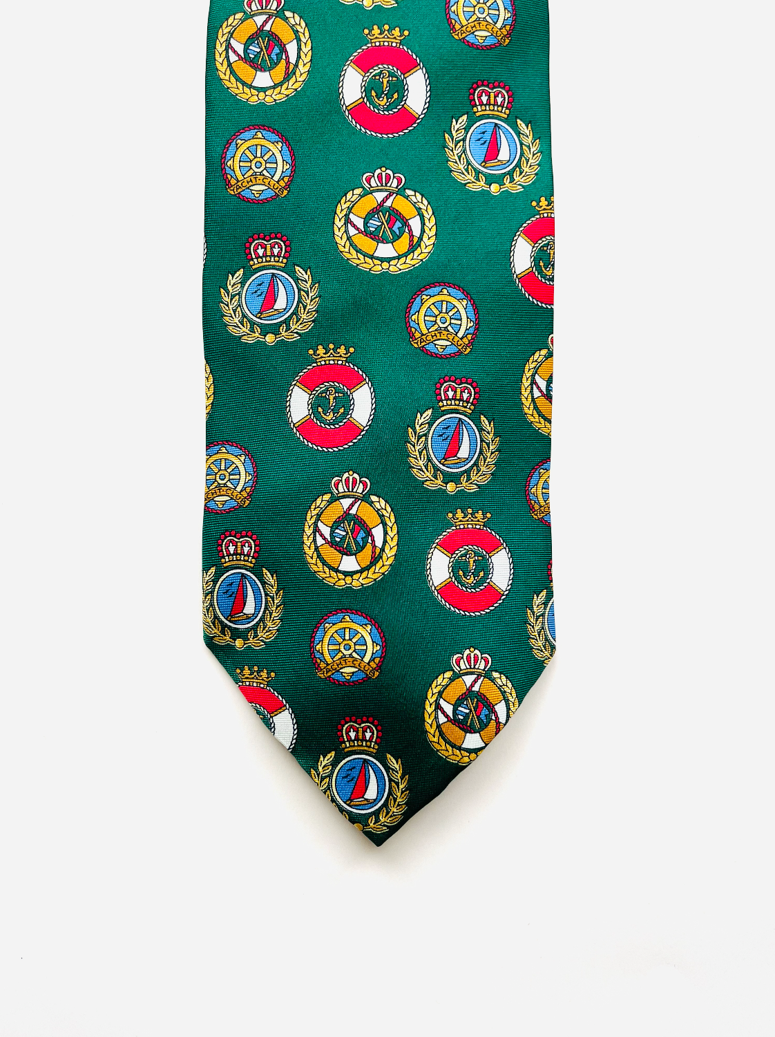 Corbata vintage original de los años 90. Base en color verde oscuro con dibujos de temática marina en colores azul, rojo y amarillo.