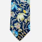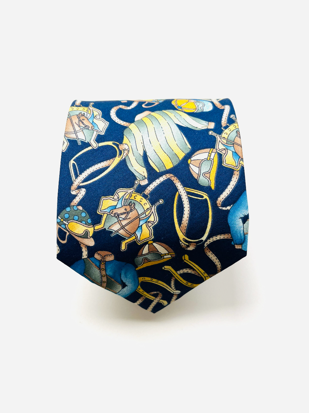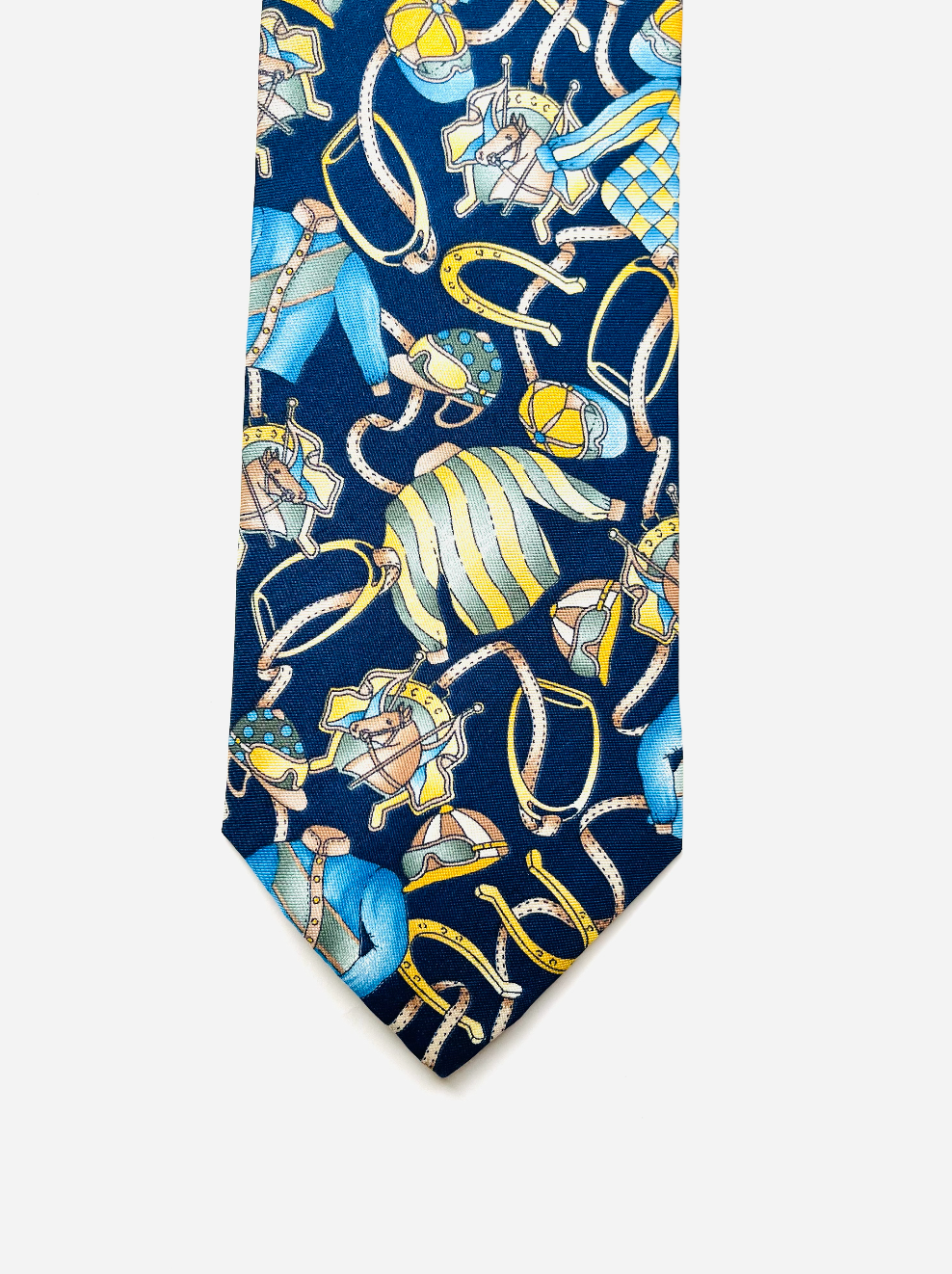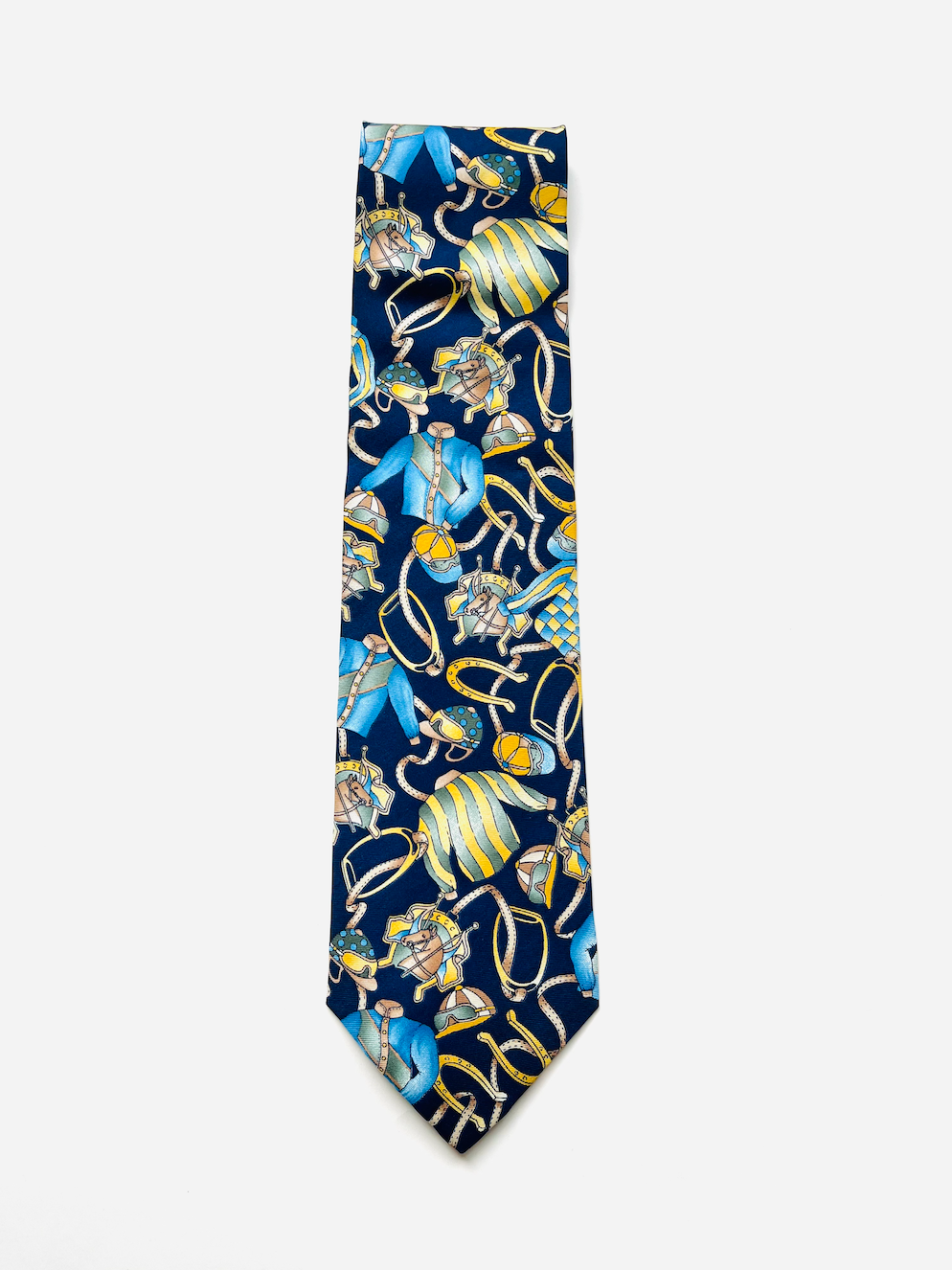 Corbata vintage original de los años 90. Base en color azul marino con dibujos de temática ecuestre en color amarillo y azul.