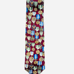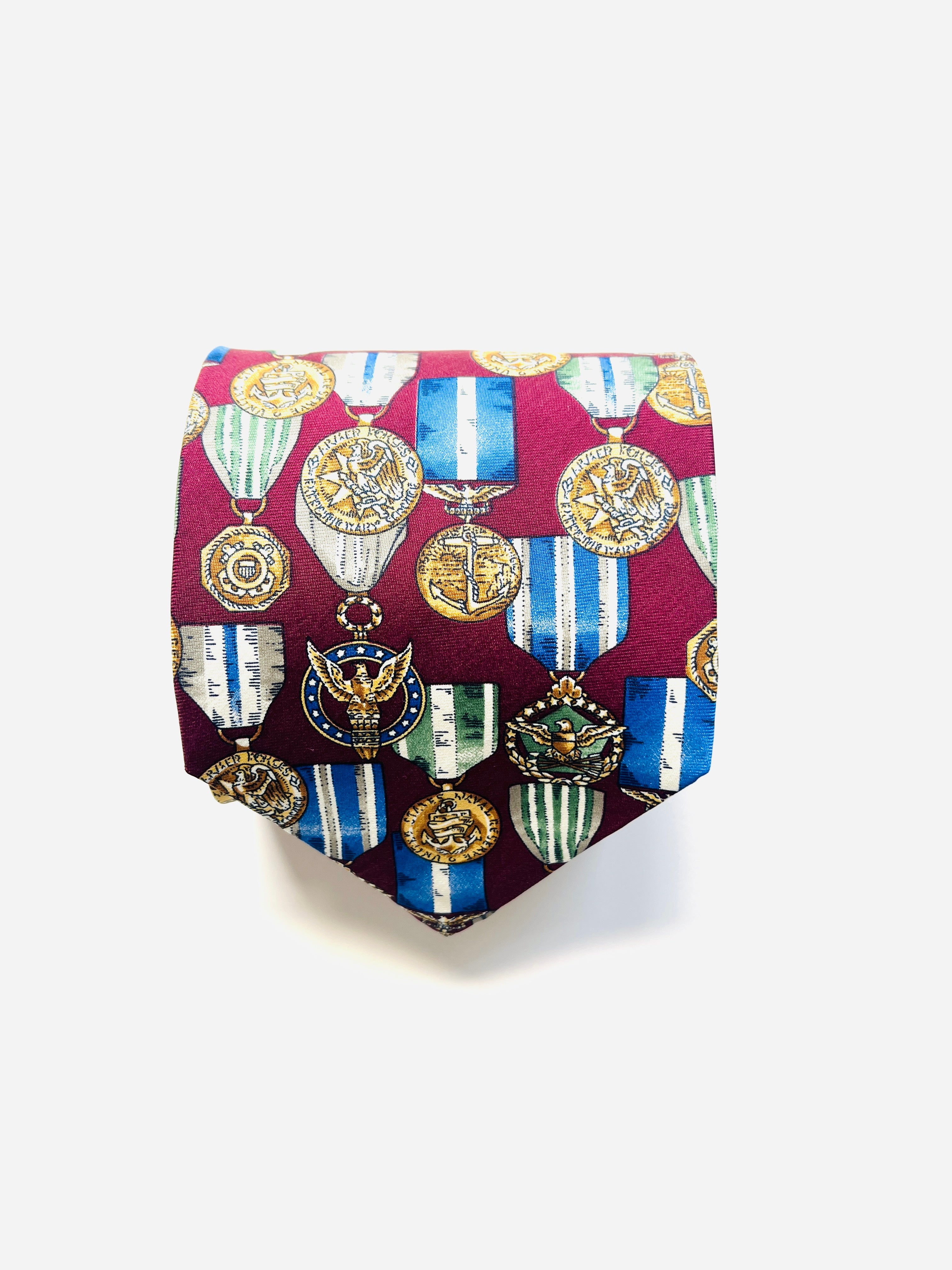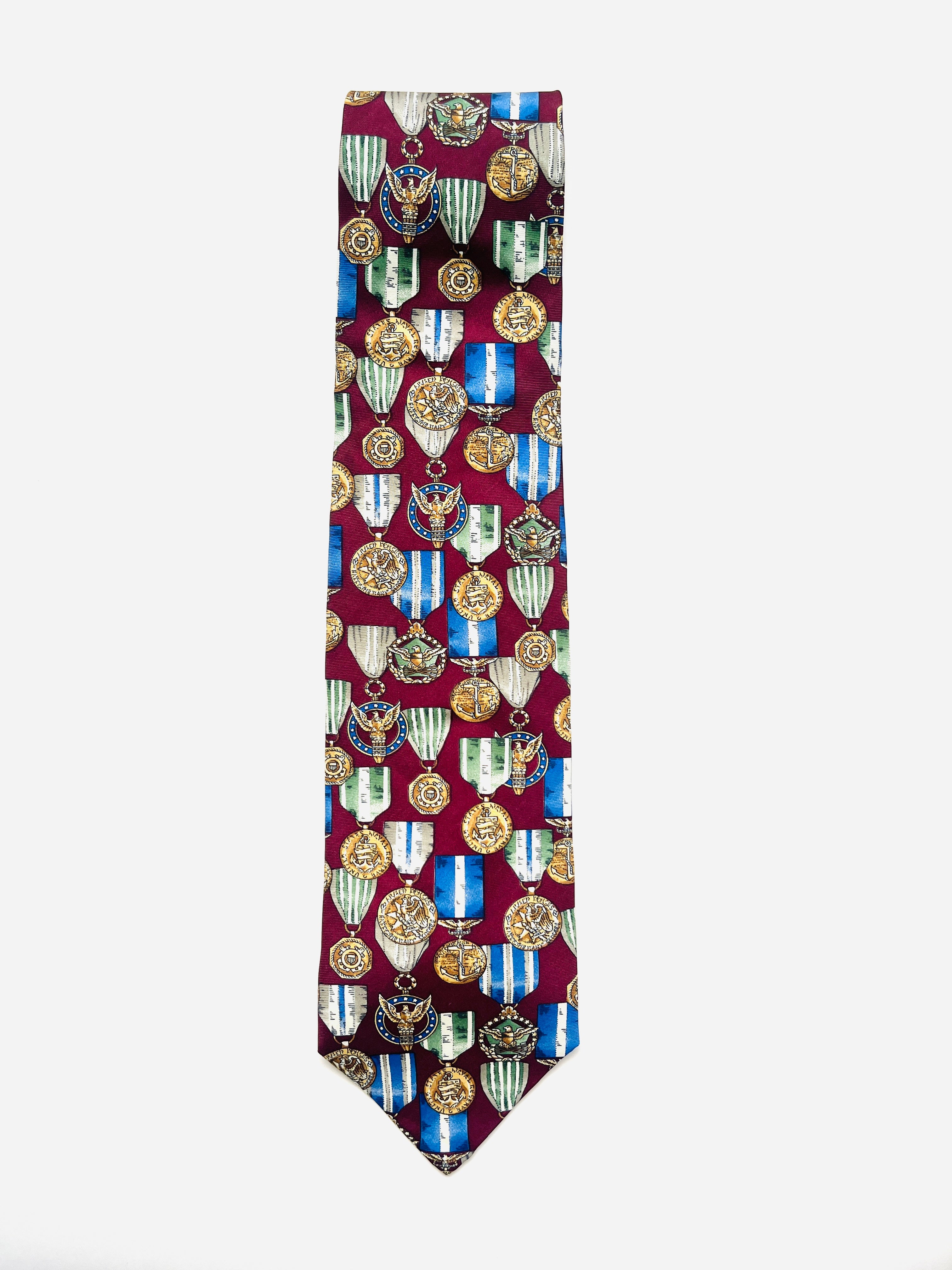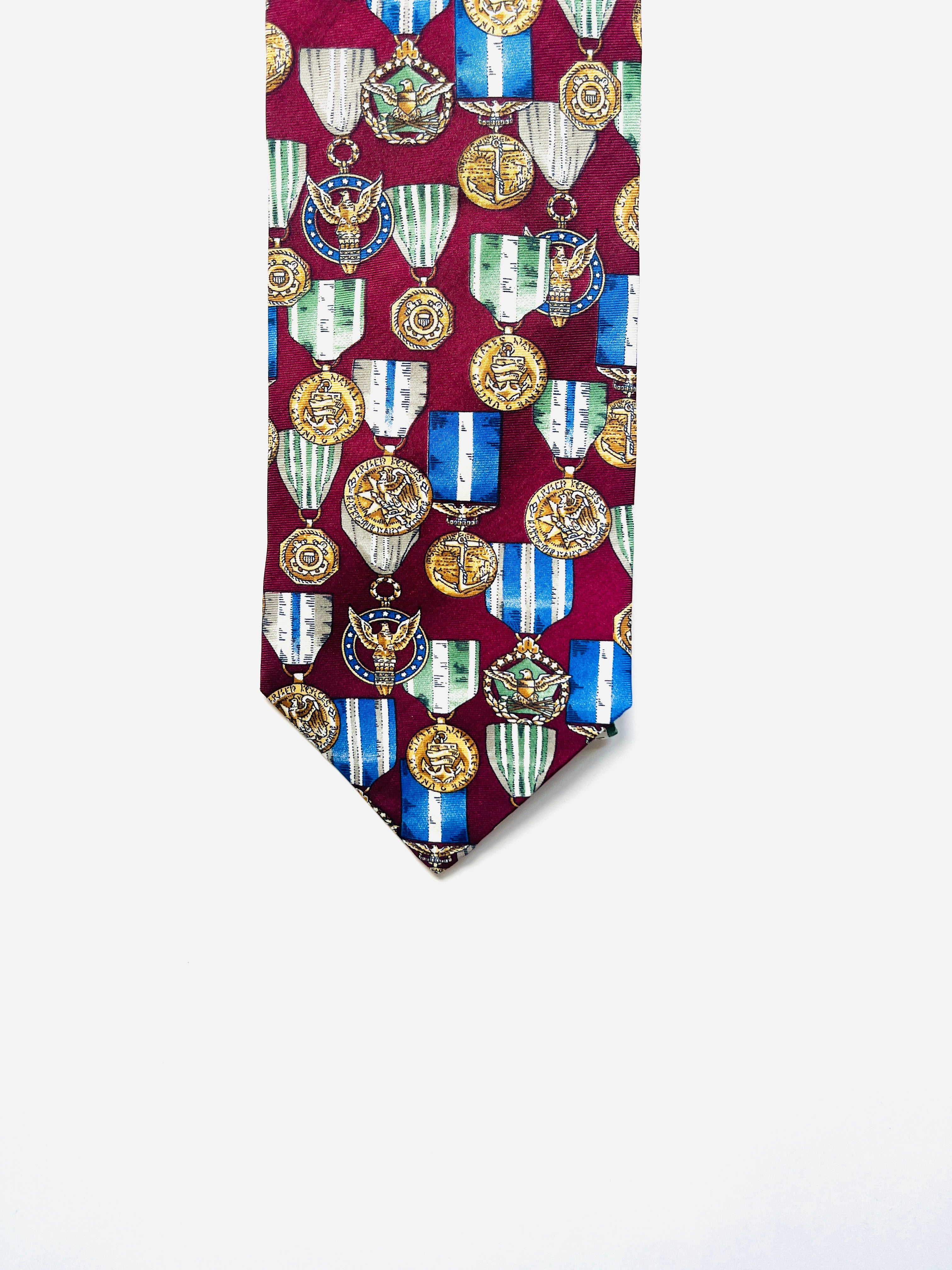 Corbata vintage original de los años 90. Base en color granate con dibujos de medallas multicolor en azul, verde y amarillo.