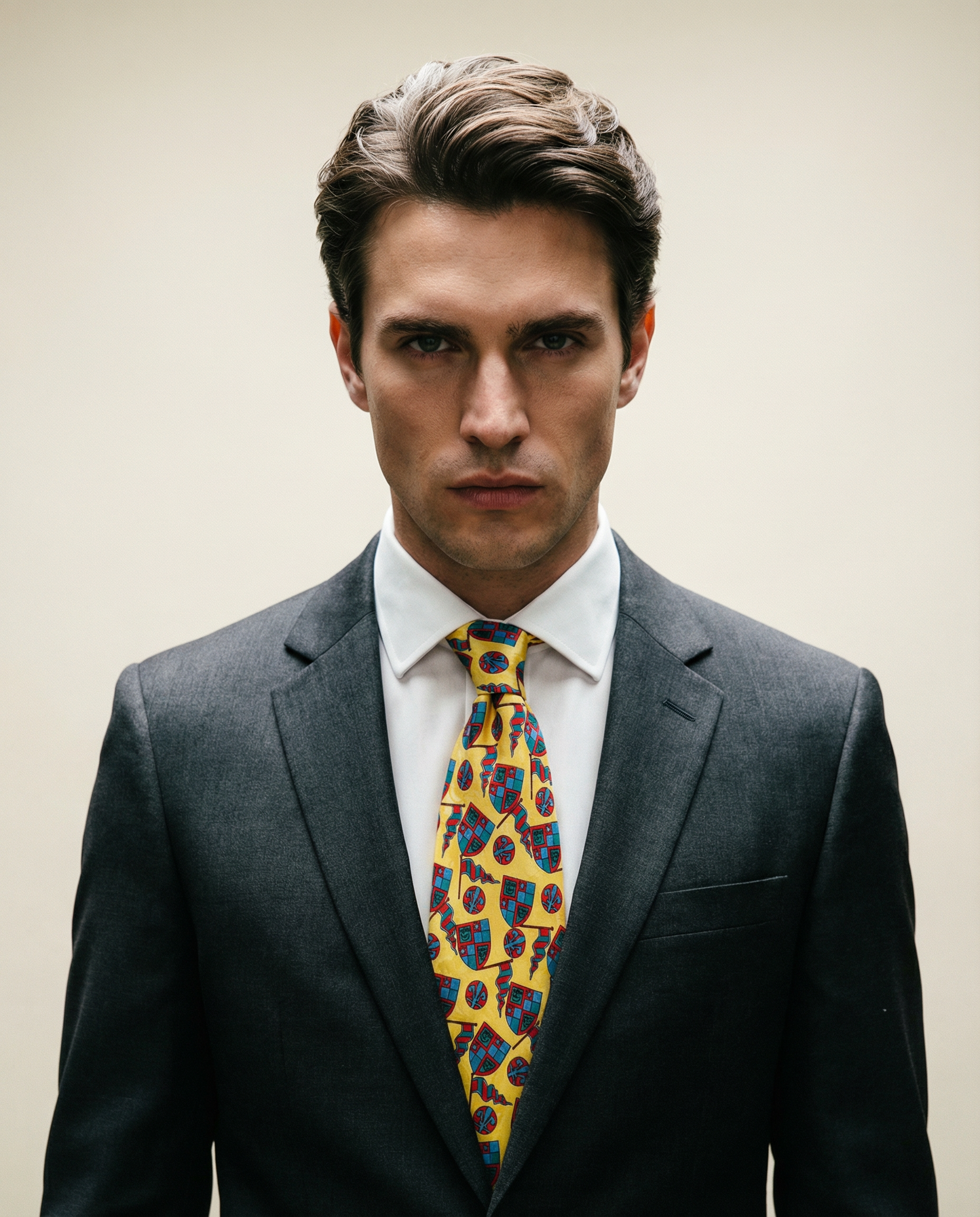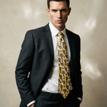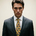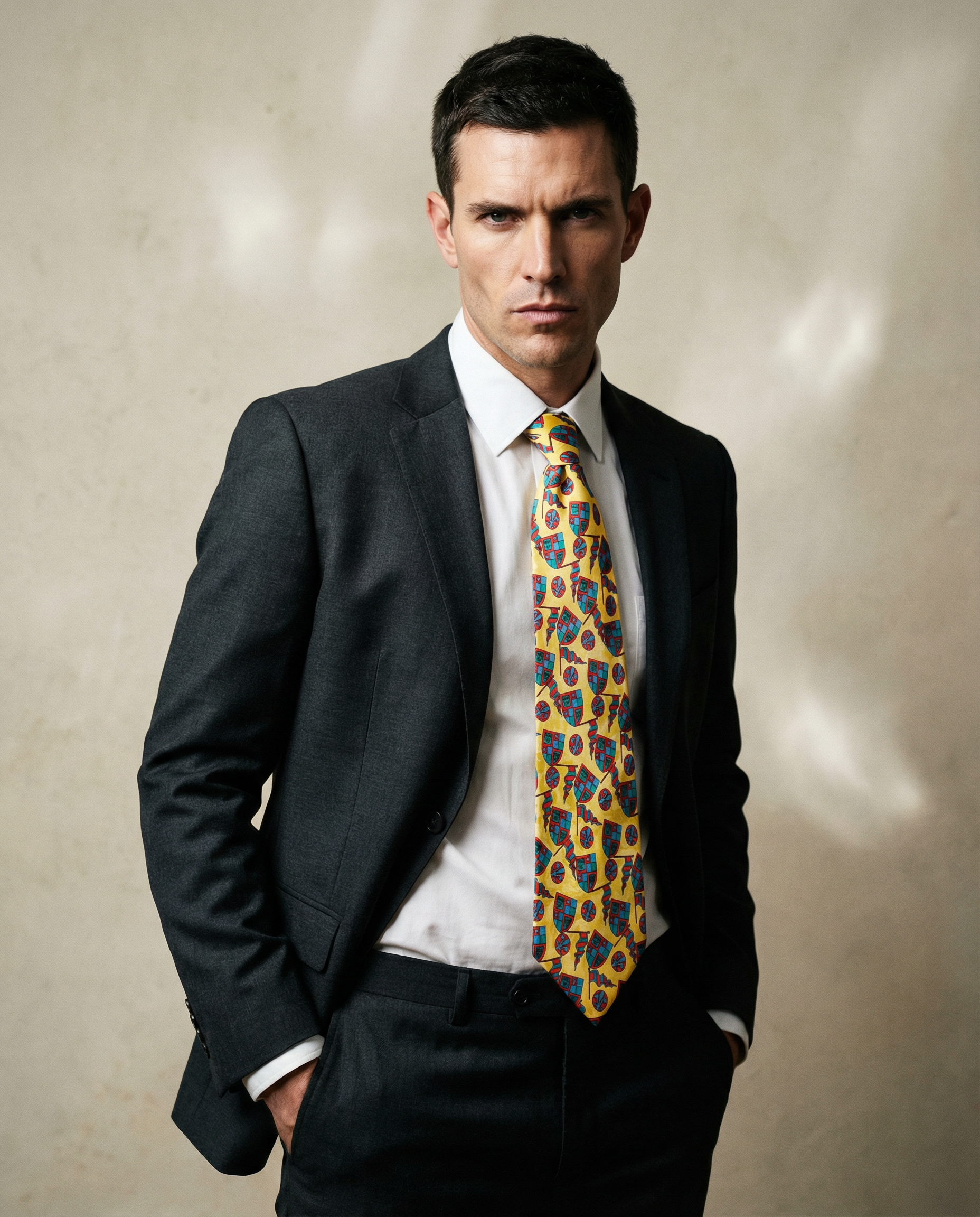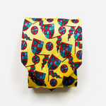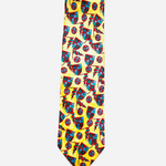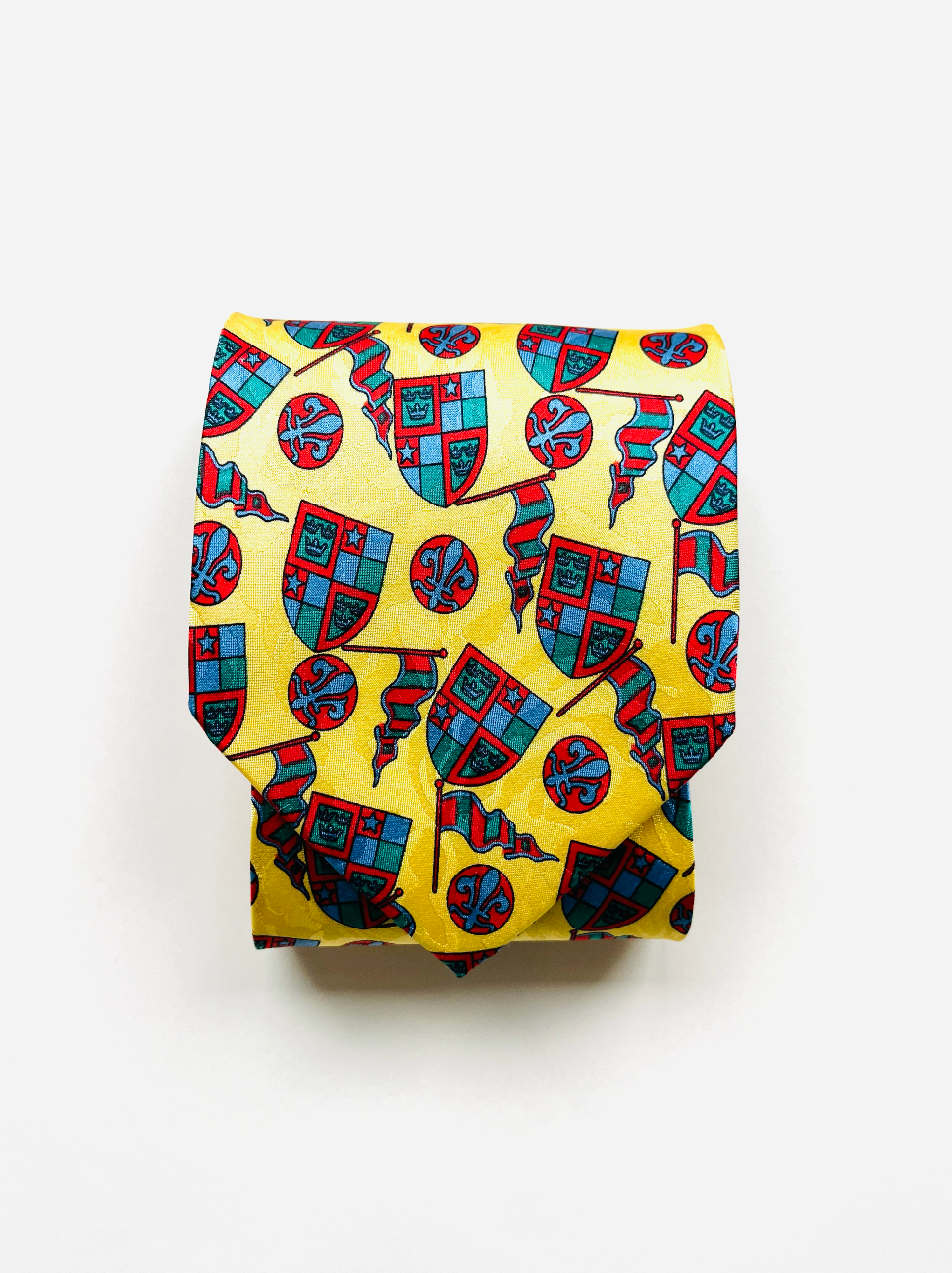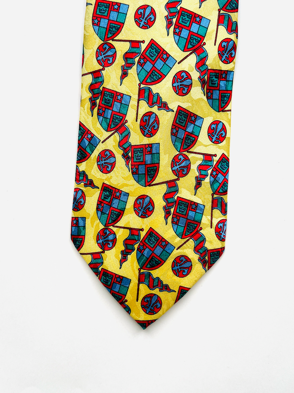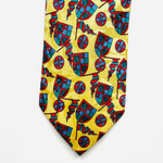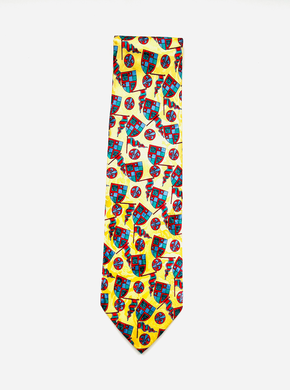 Corbata vintage original de los años 90. Base en color amarillo con dibujos de temática medieval en color rojo y azul.