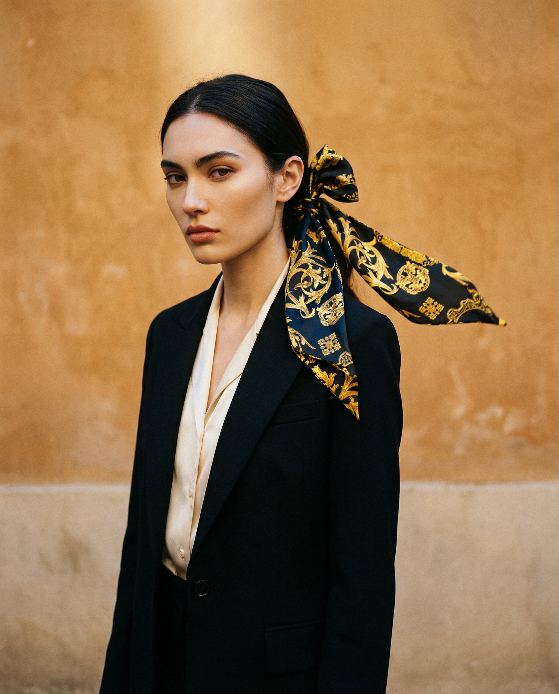 Pañuelo de seda italiana vintage original de finales de los años 80. Base en negro con estampado en color amarillo. Múltiples opciones como cinturón fajín, cinta de pelo o pañuelo al cuello.