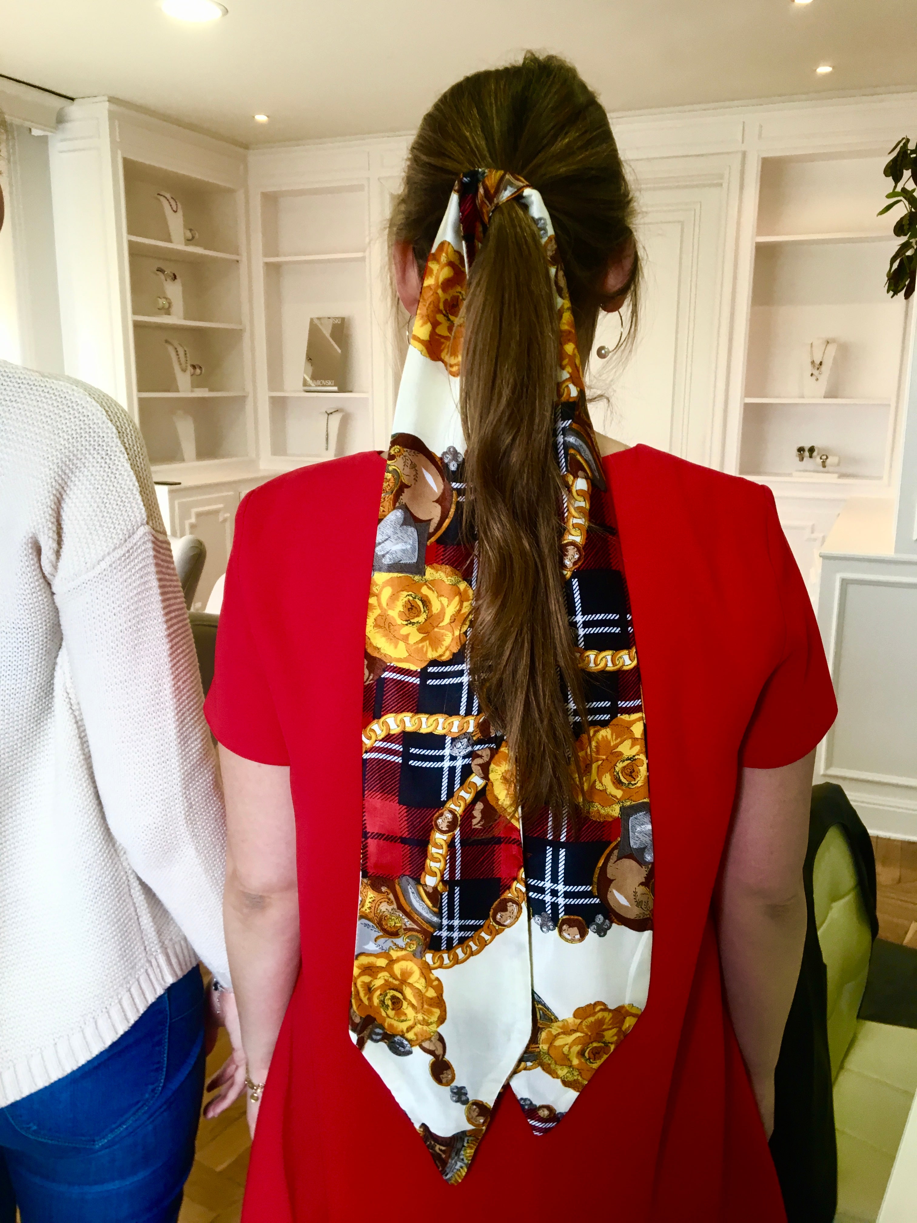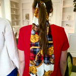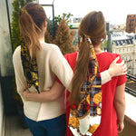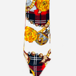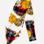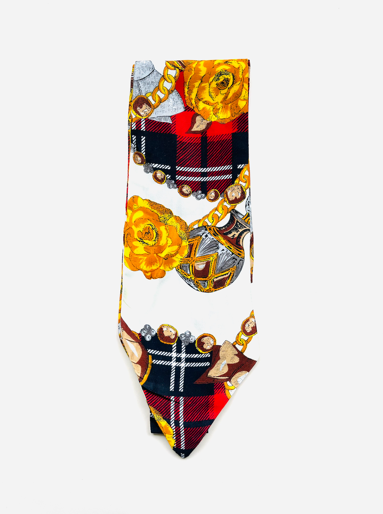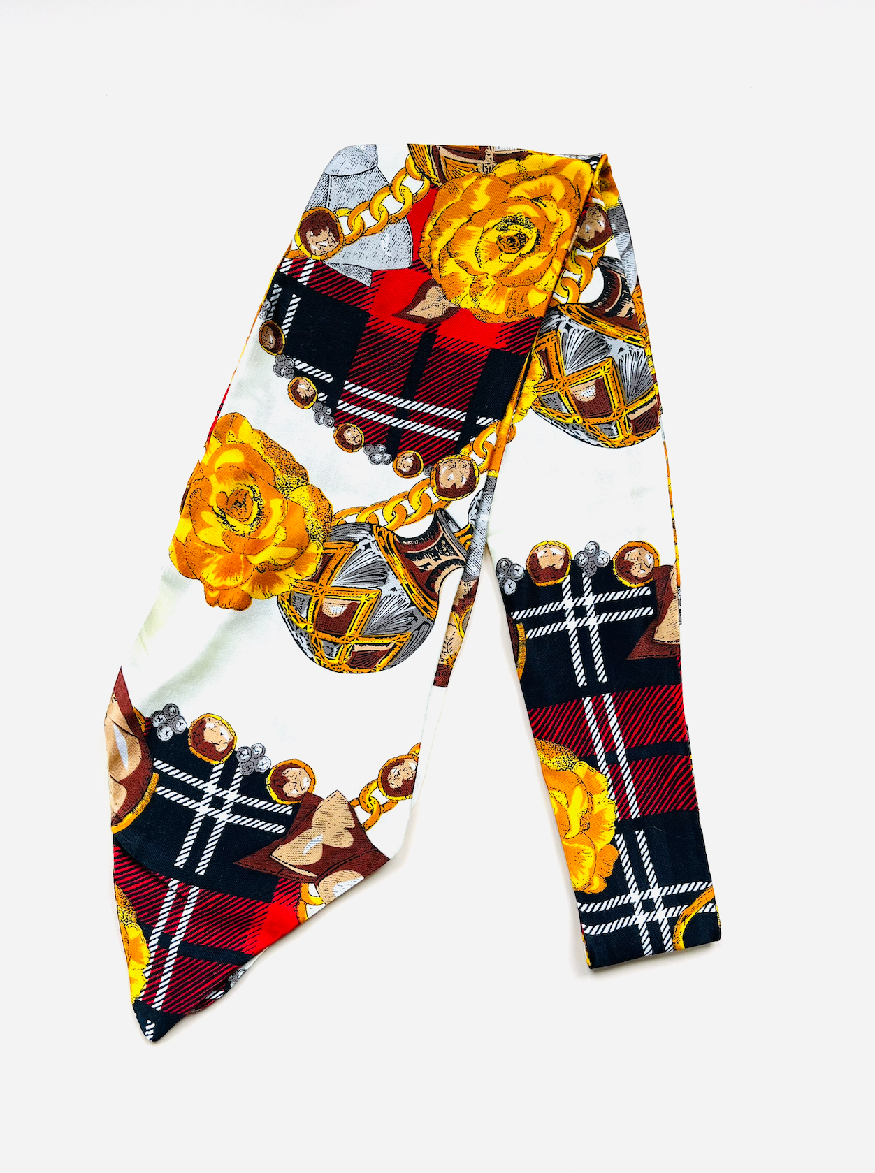 Pañuelo de seda italiana vintage original de finales de los años 80. Base en blanco con estampado en color rojo, amarillo y negro. Múltiples opciones como cinturón fajín, cinta de pelo o pañuelo al cuello.
