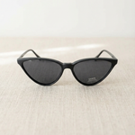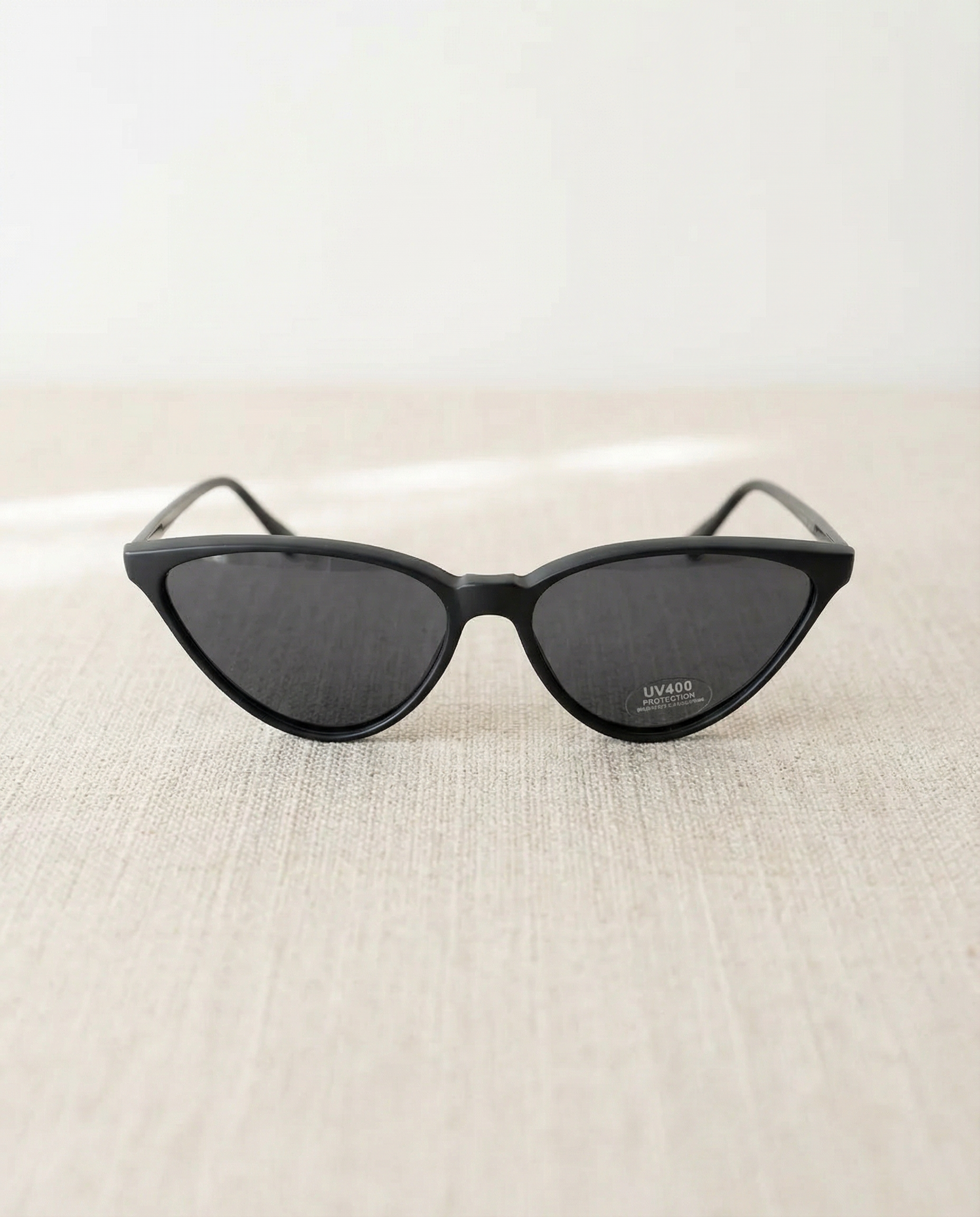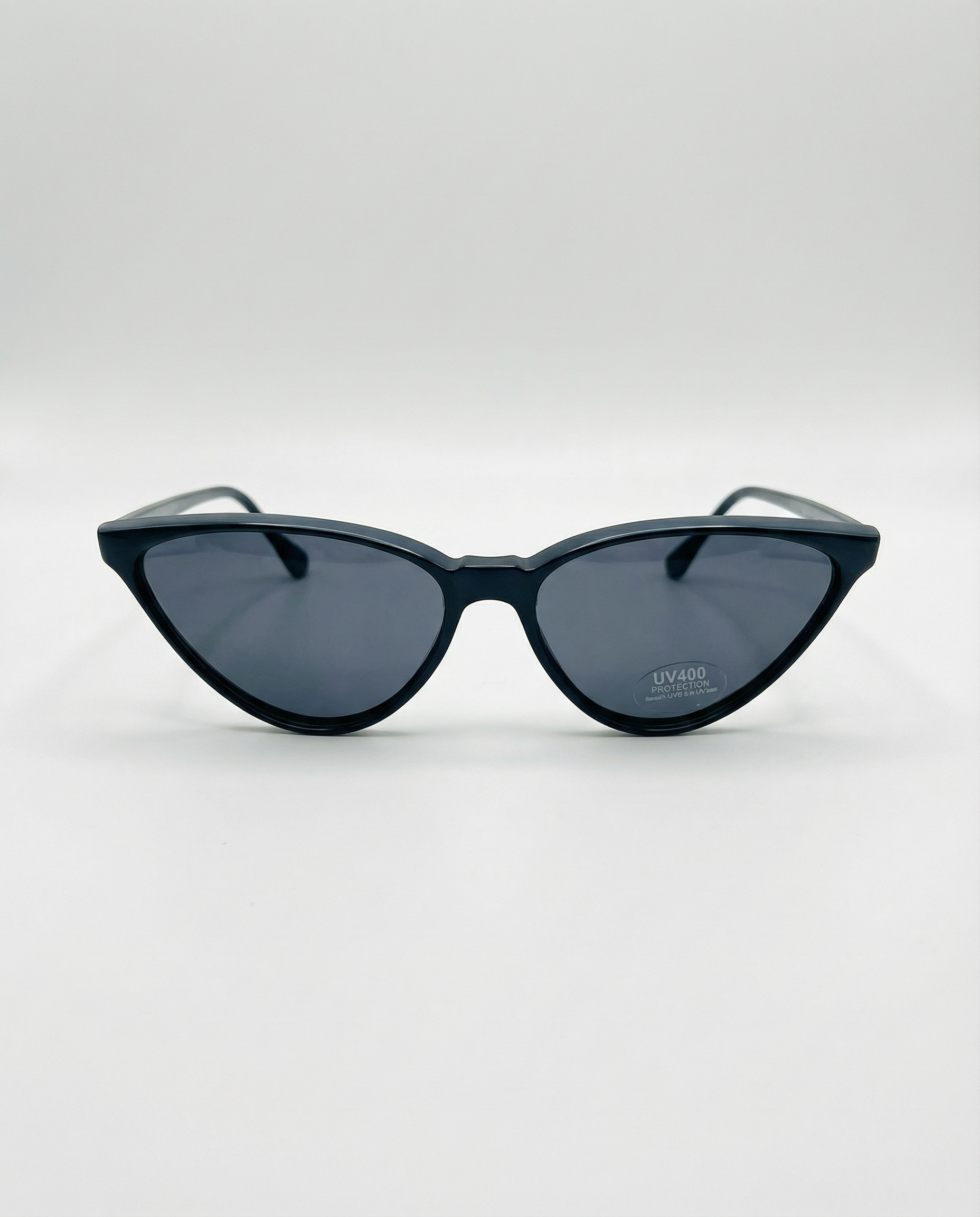 Gafa vintage unisex de primera mano con montura negra en forma de cat eye, patillas finas metalizadas en plata y cristales oscuros.