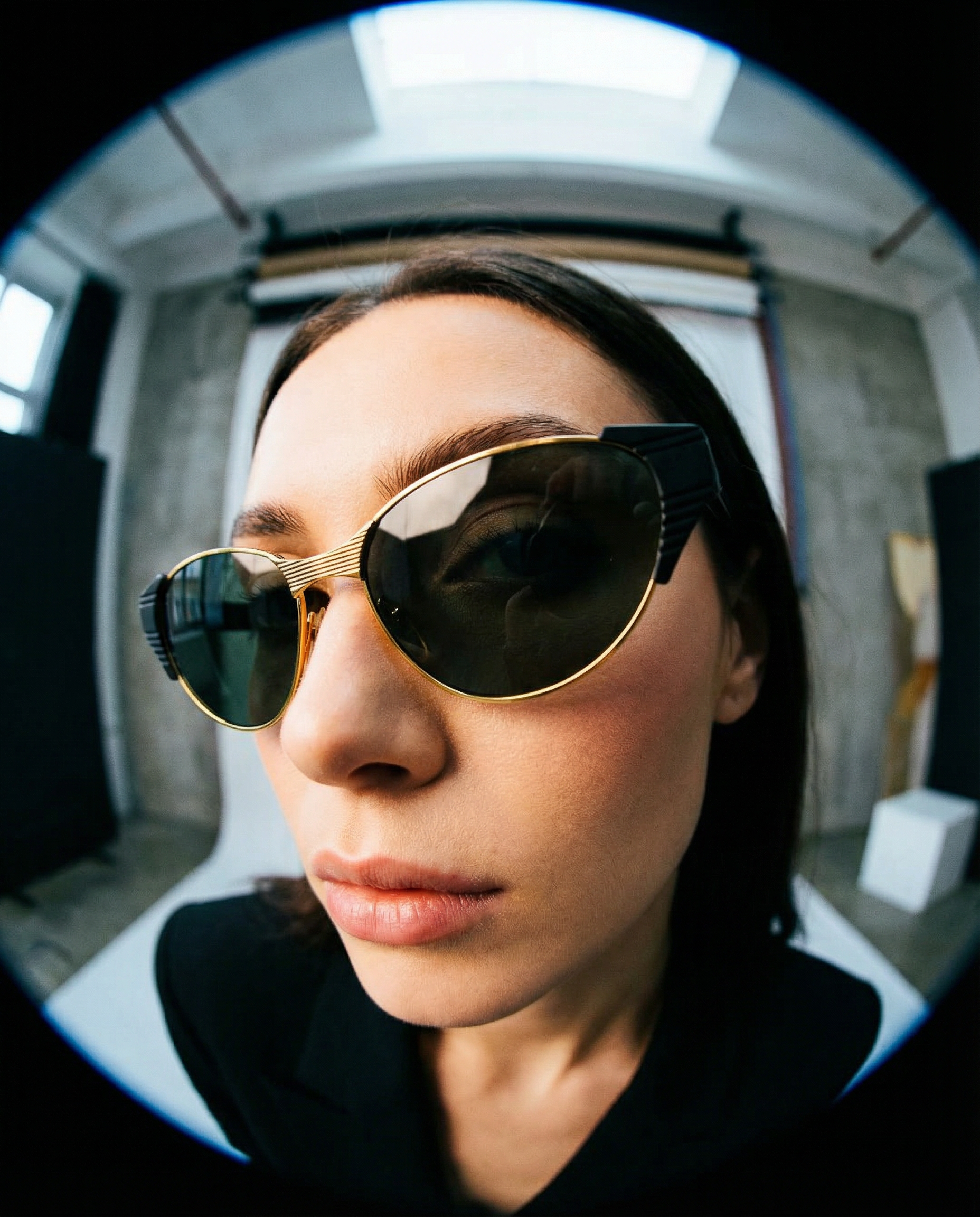 Gafa vintage unisex de primera mano con montura dorada y negra, cristal gris oscuro.