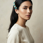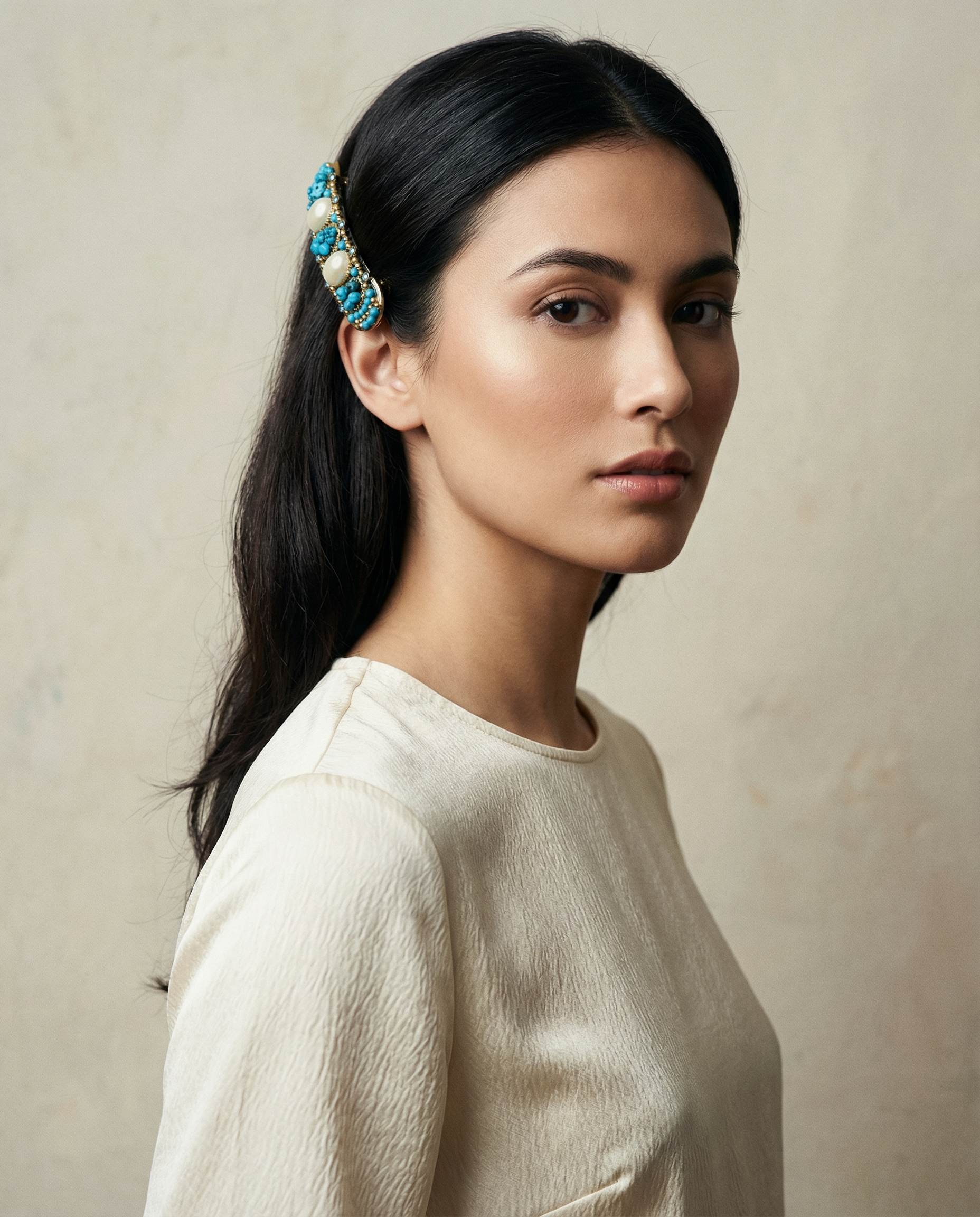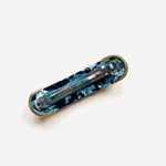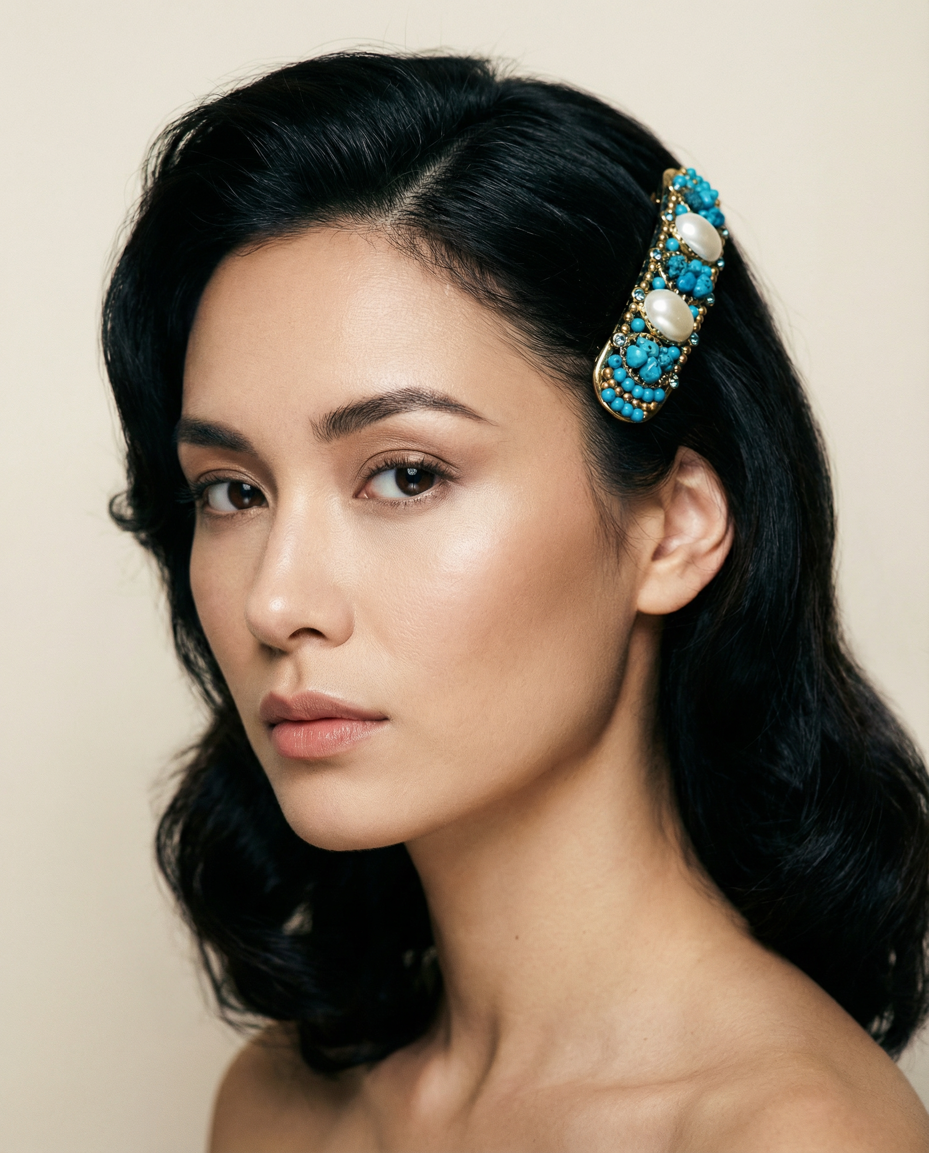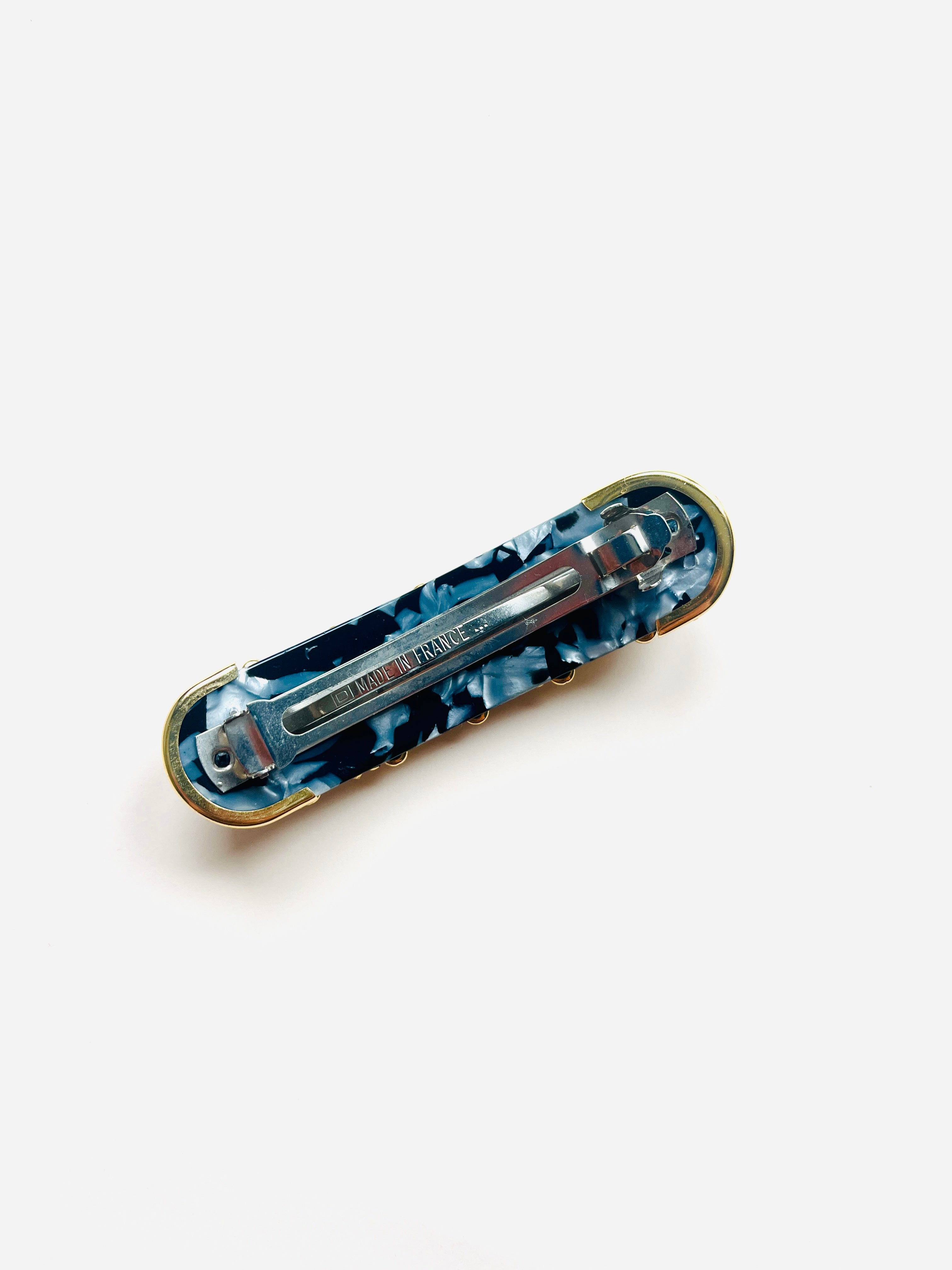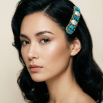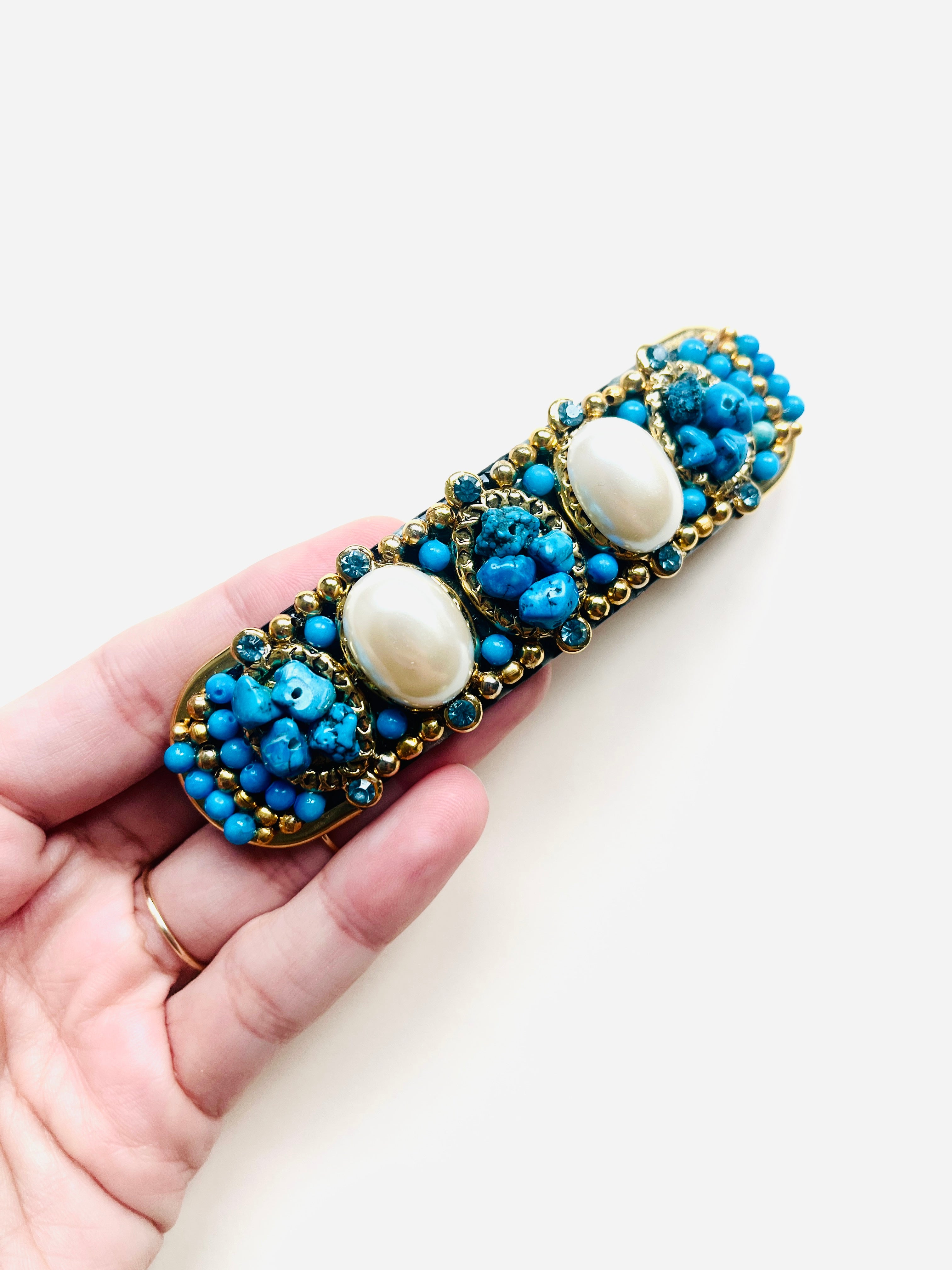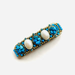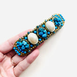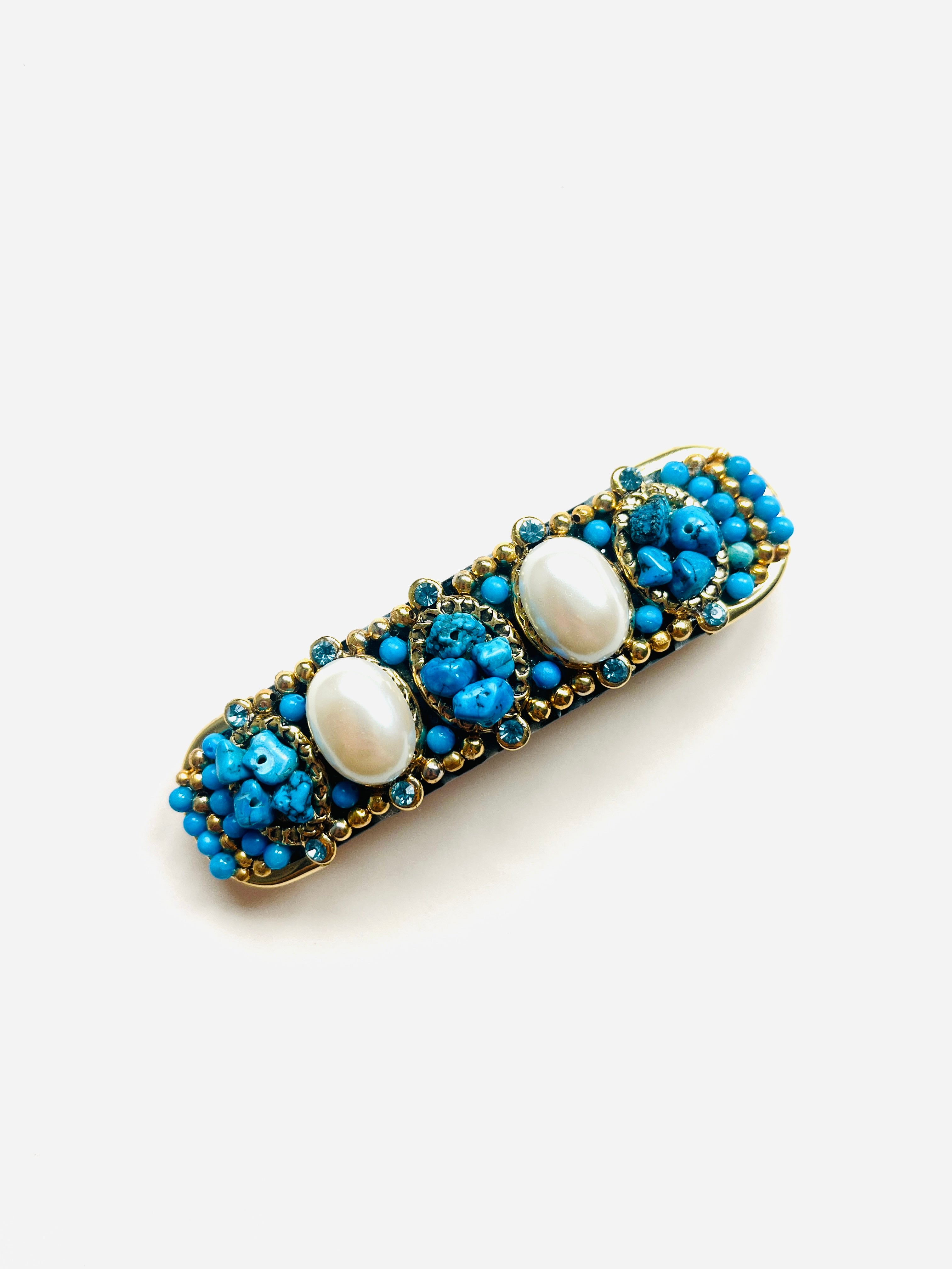 Pasador de pelo vintage original de los años 90 con base dorada y detalles en perla blanca, piedra turquesa y cristal azul.