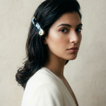 Vintage hair clip with black base and dark gray mother-of-pearl with gold details on the sides.