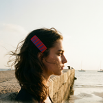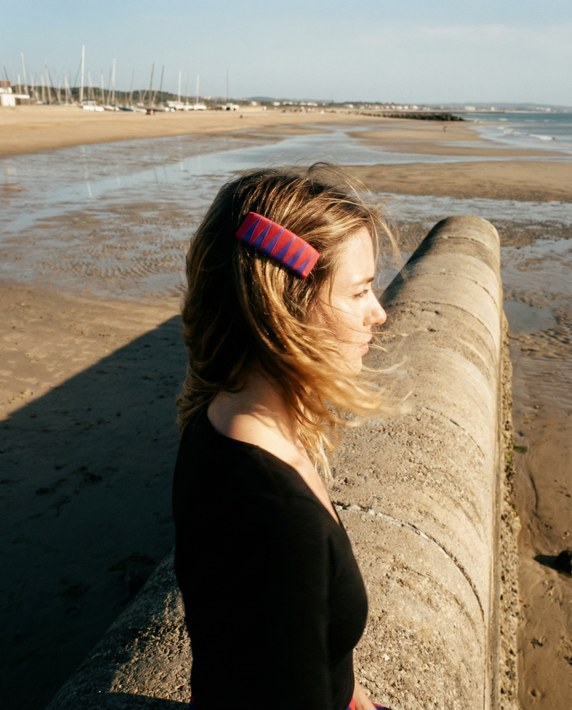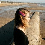Original vintage hair clip from the 90s with a silver base and two-tone fabric in red and purple.