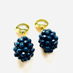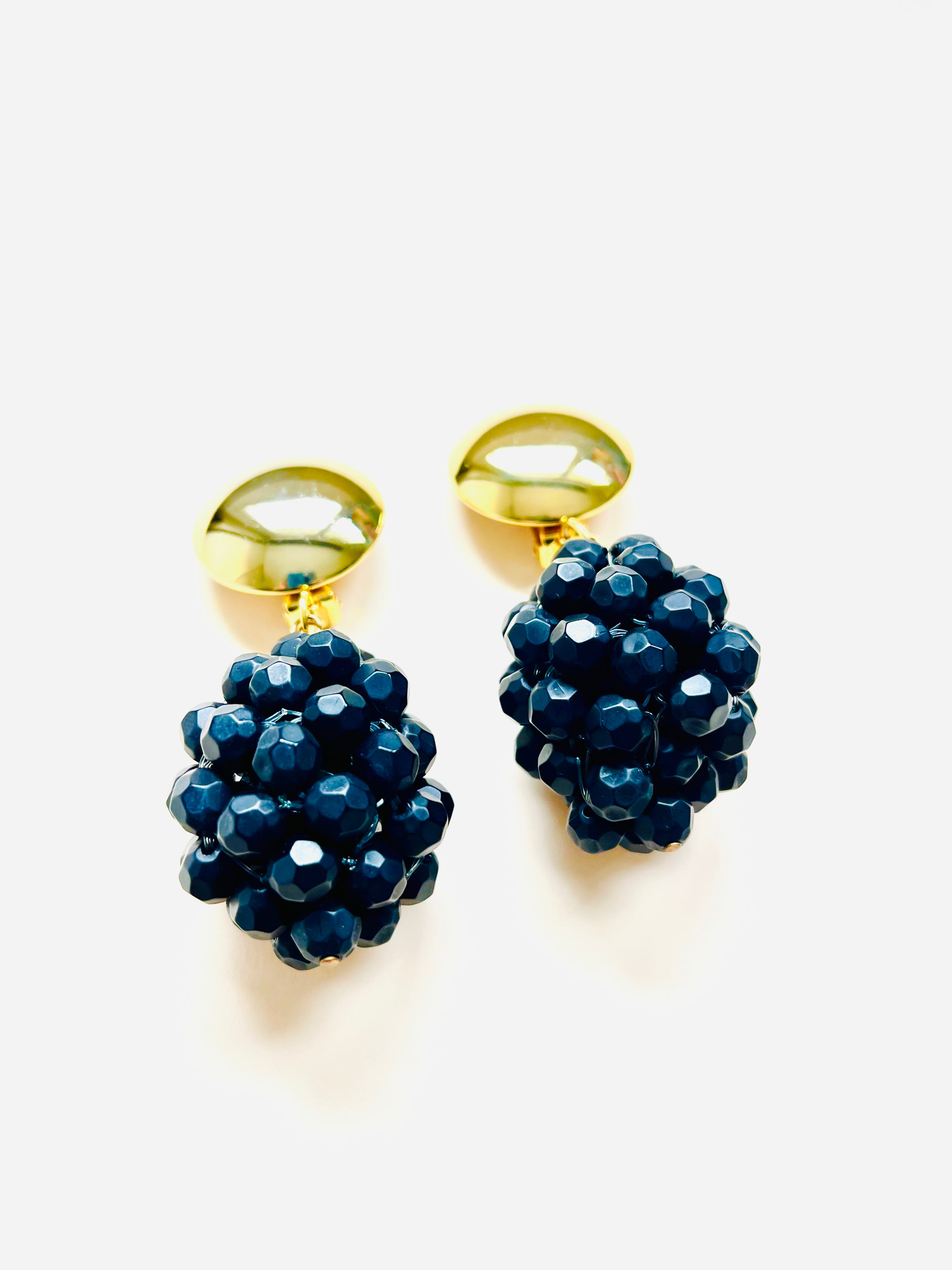 Pendientes vintage originales de los años 90 con cierre de clip. Base dorada redonda con colgante maxi borla en forma de racimo negro.
