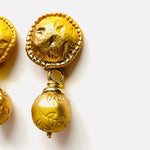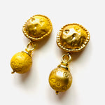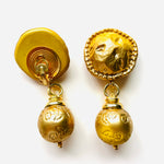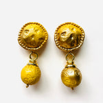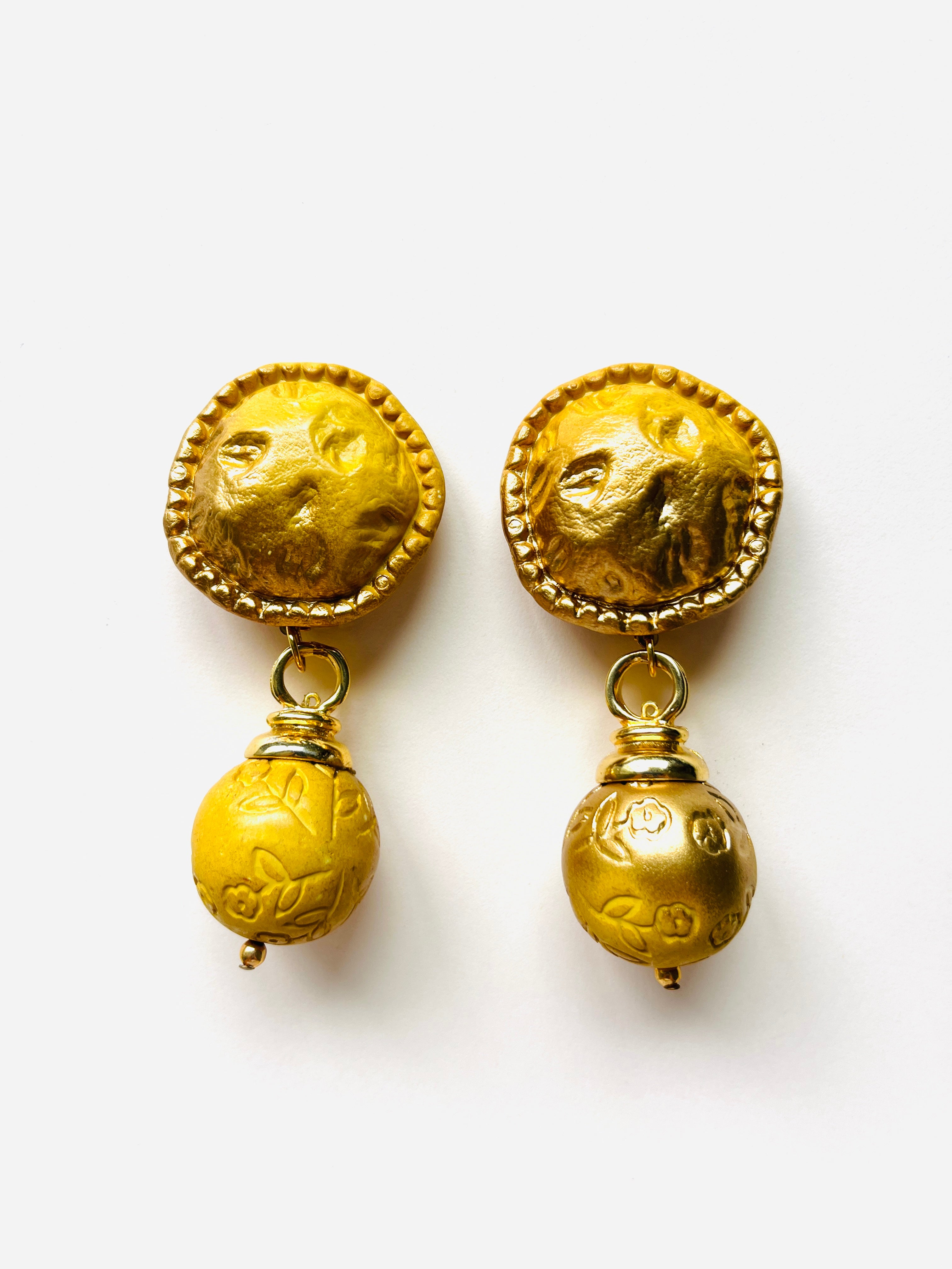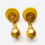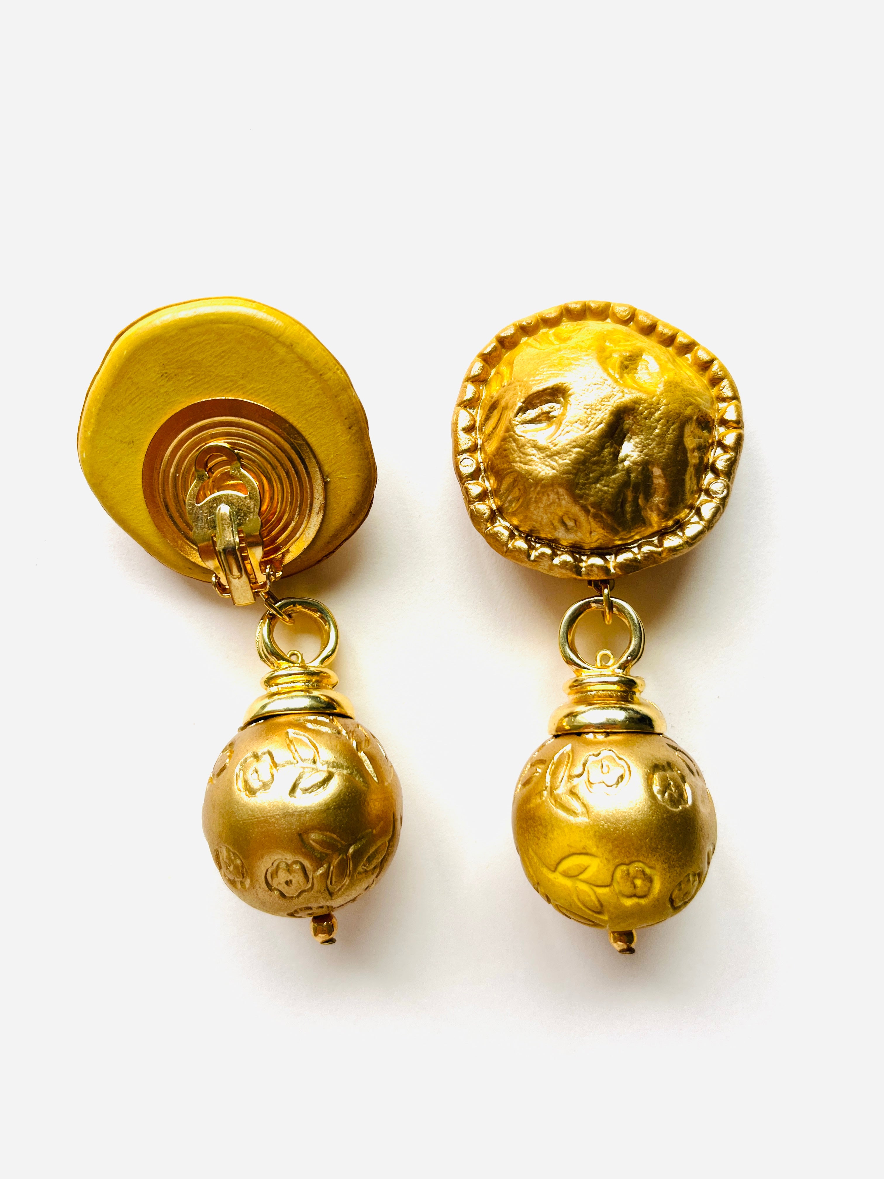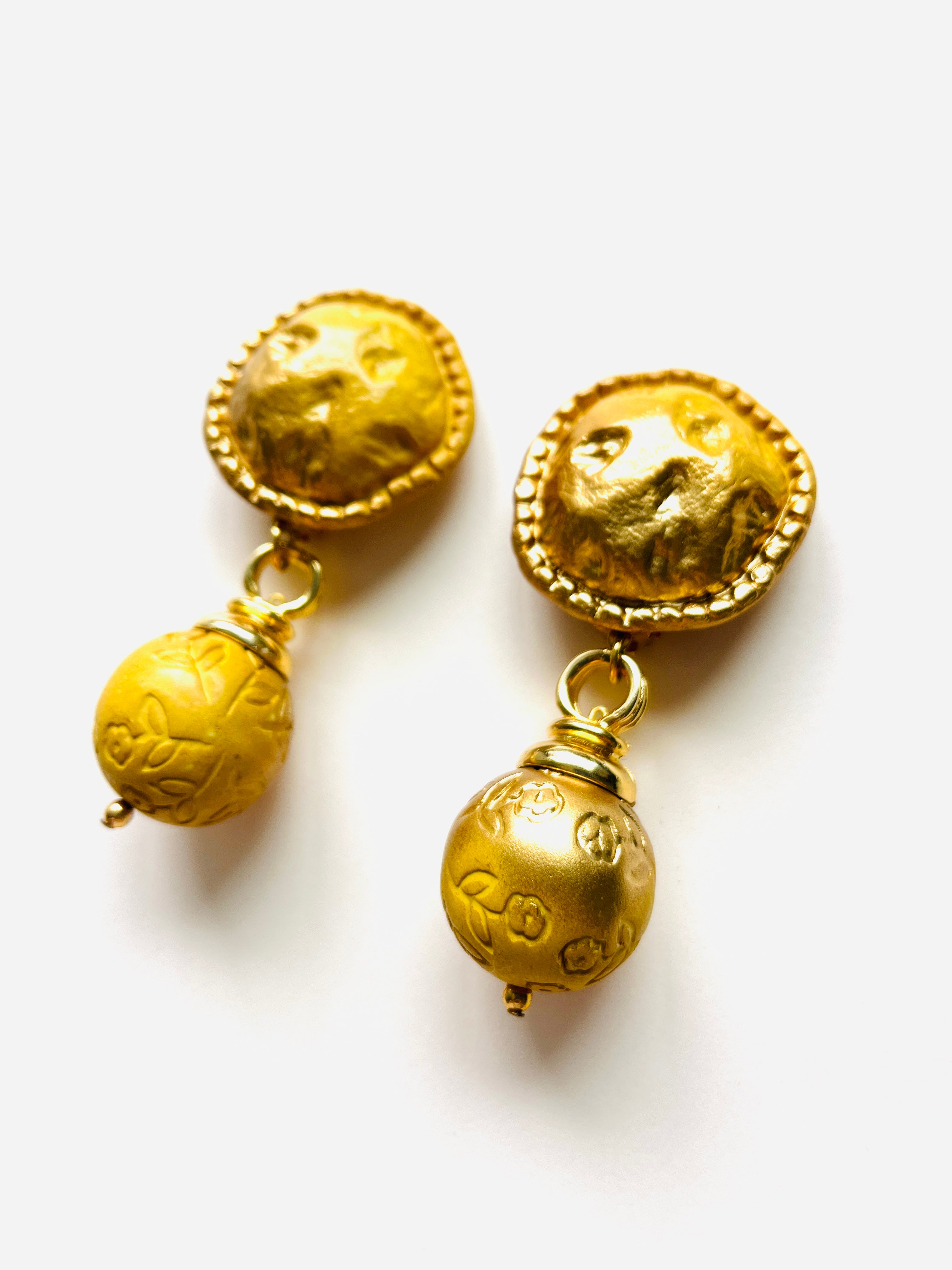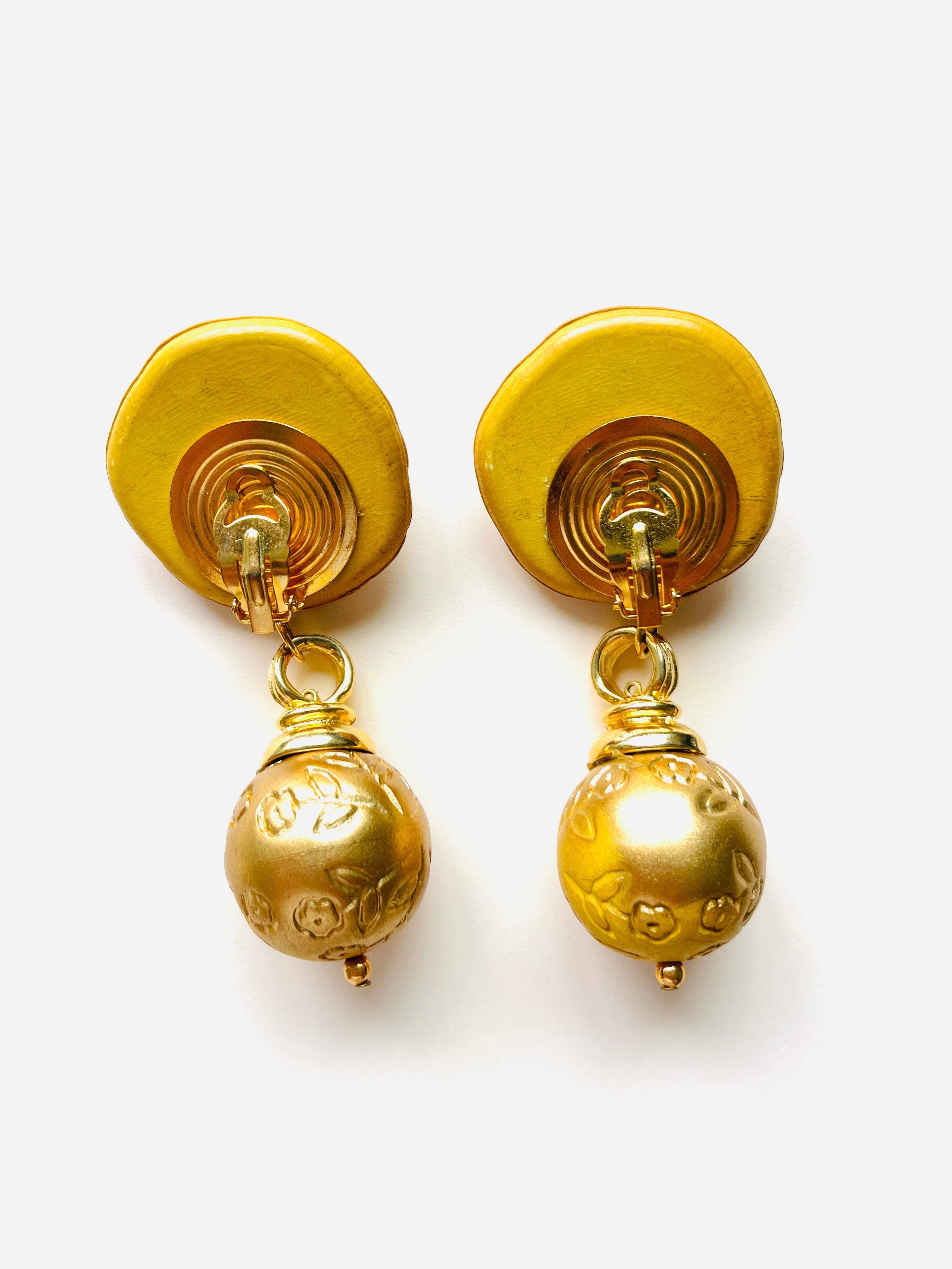 Maxi pendientes vintage originales de los años 90 con cierre de clip. Base redonda dorada con pieza central y colgante de bola tallada con forma de flores en amarillo y dorado con efecto tornasolado.