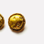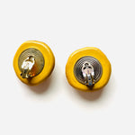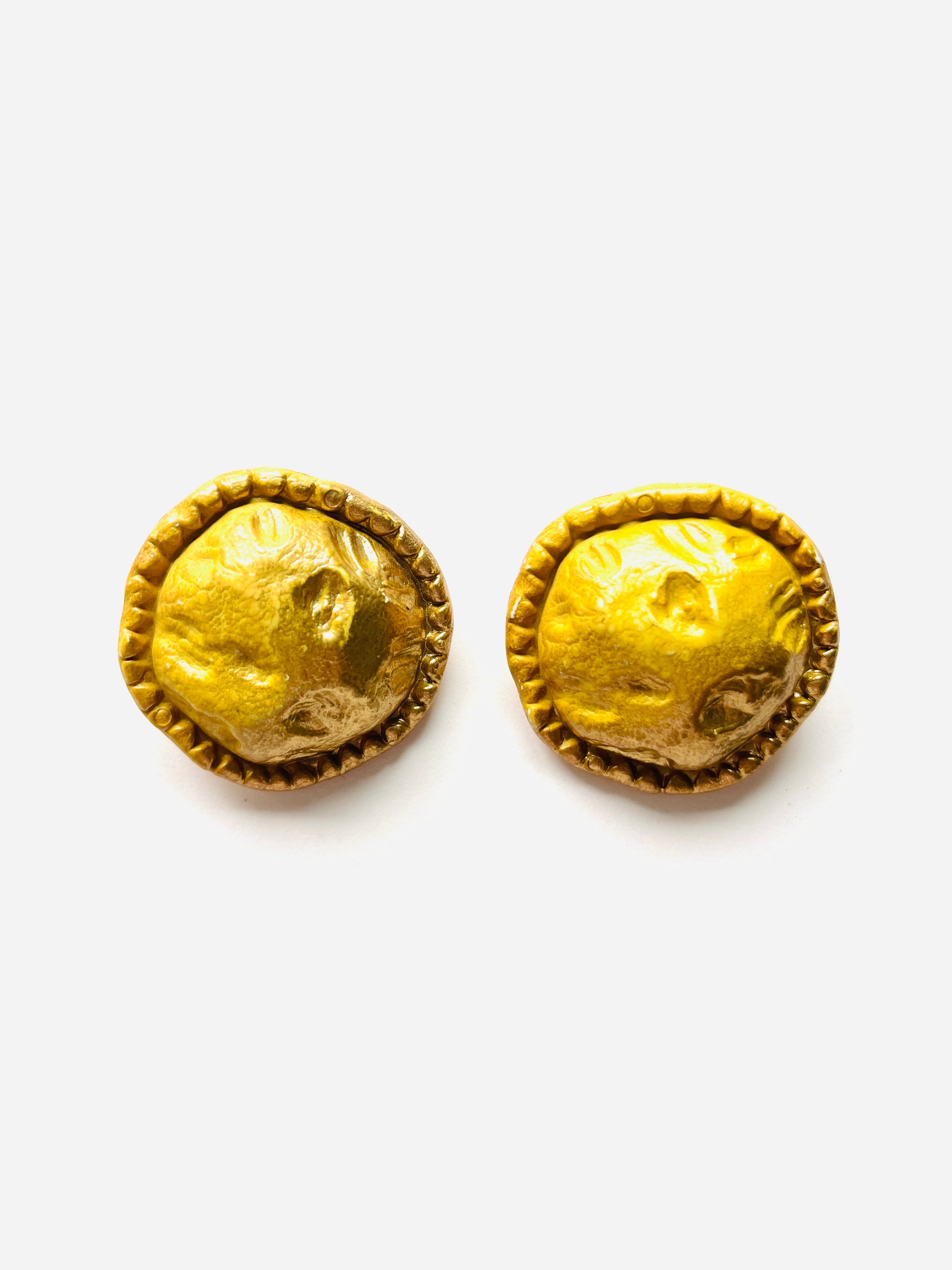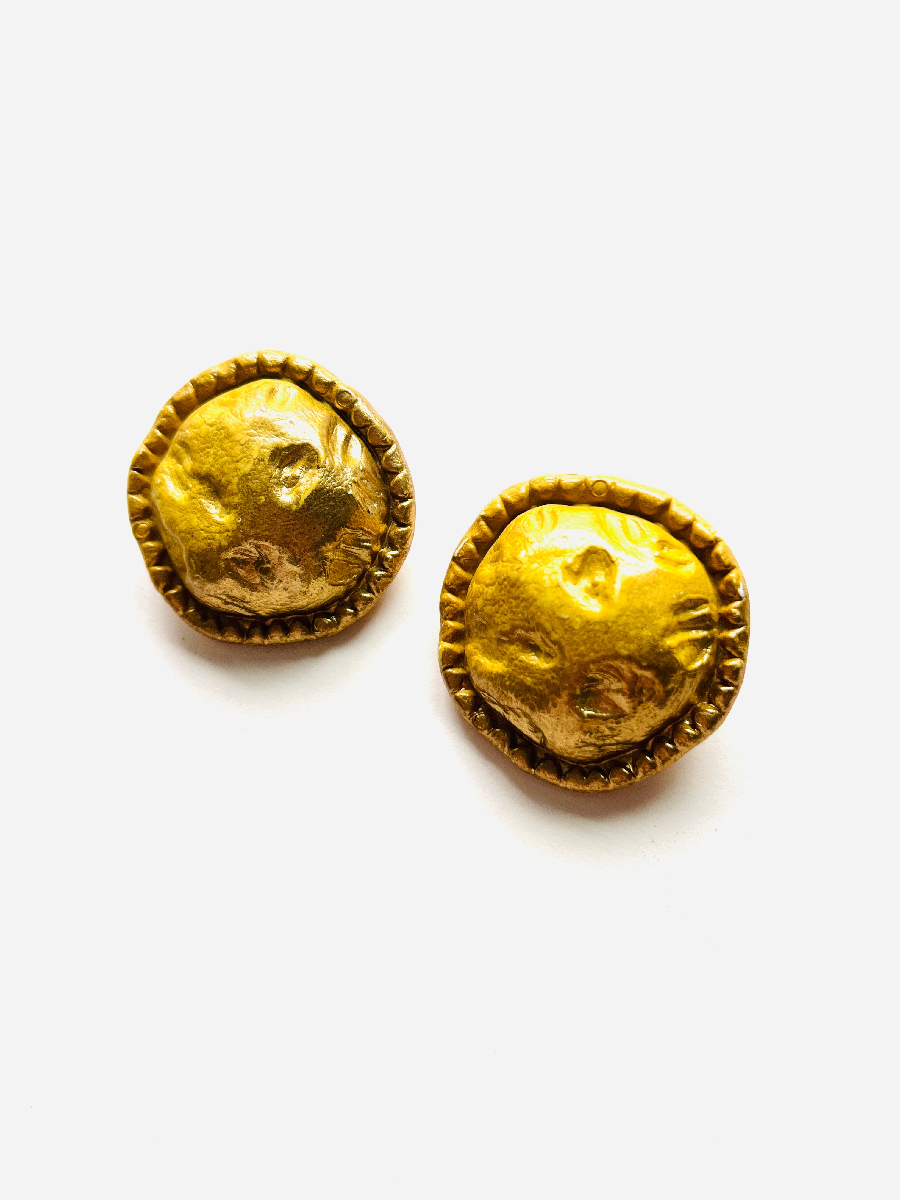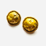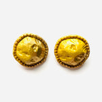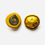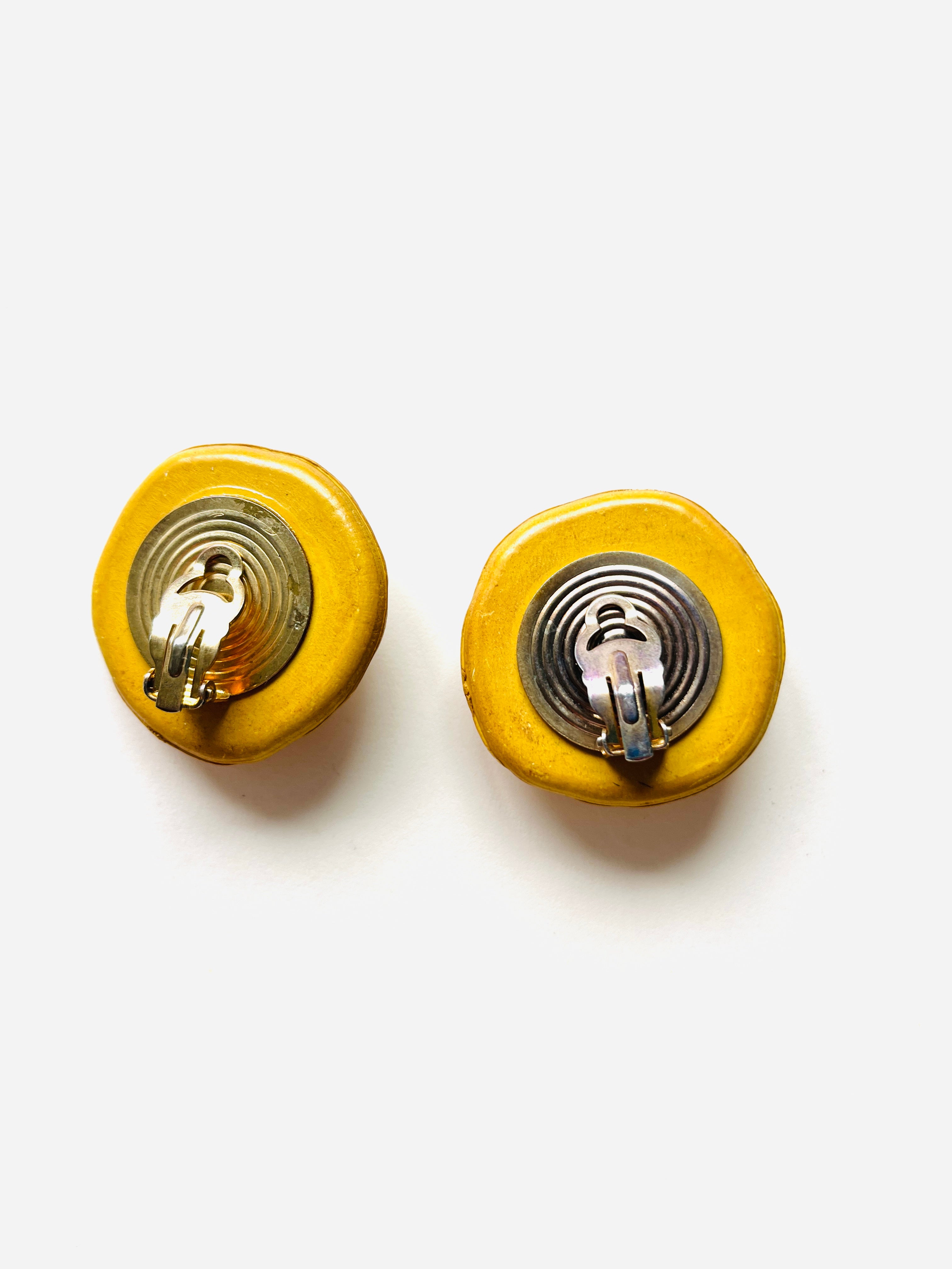 Maxi pendientes vintage originales de los años 90 con cierre de clip. Base redonda dorada con pieza central en amarillo y dorado con efecto tornasolado.