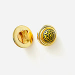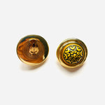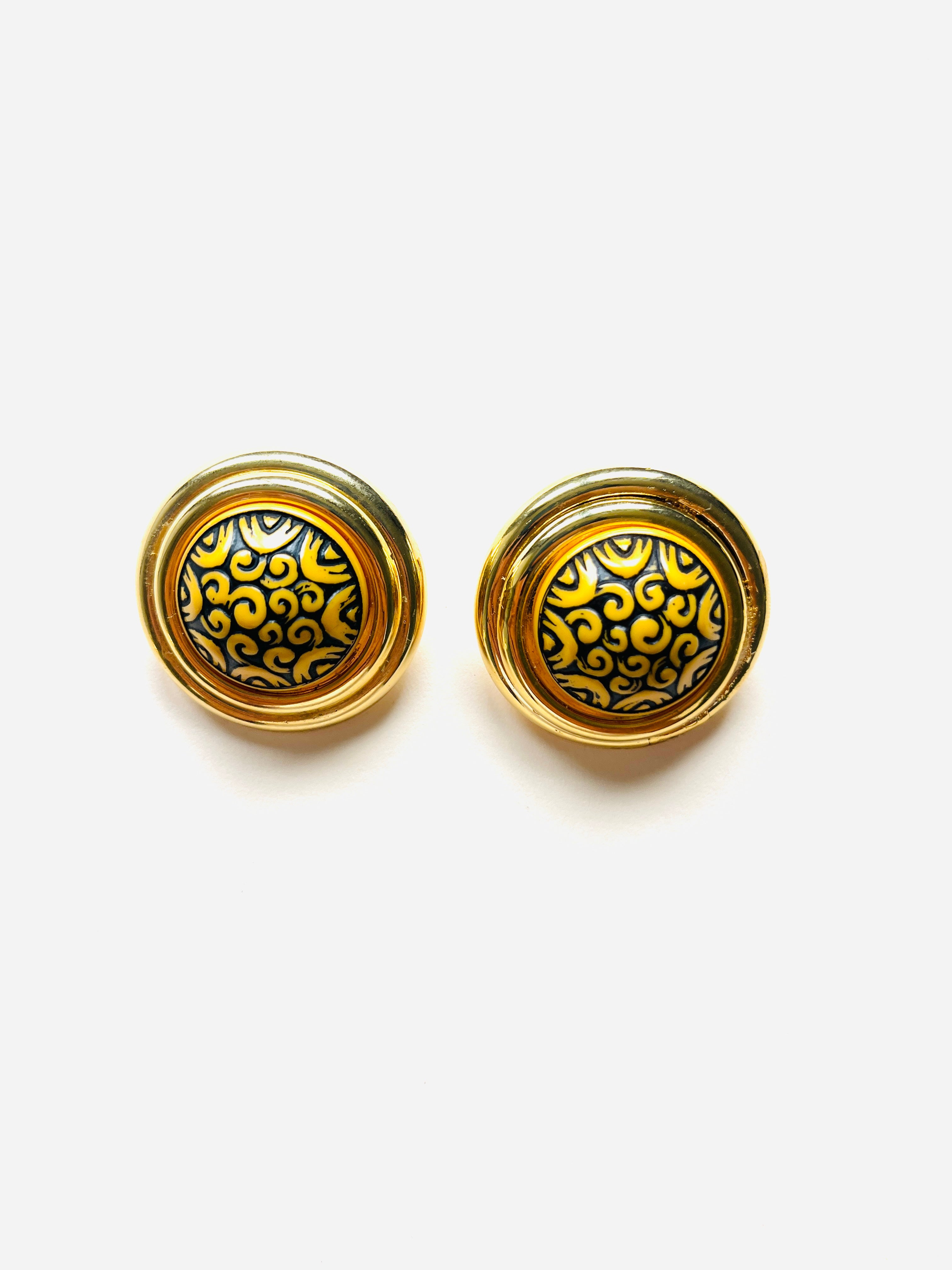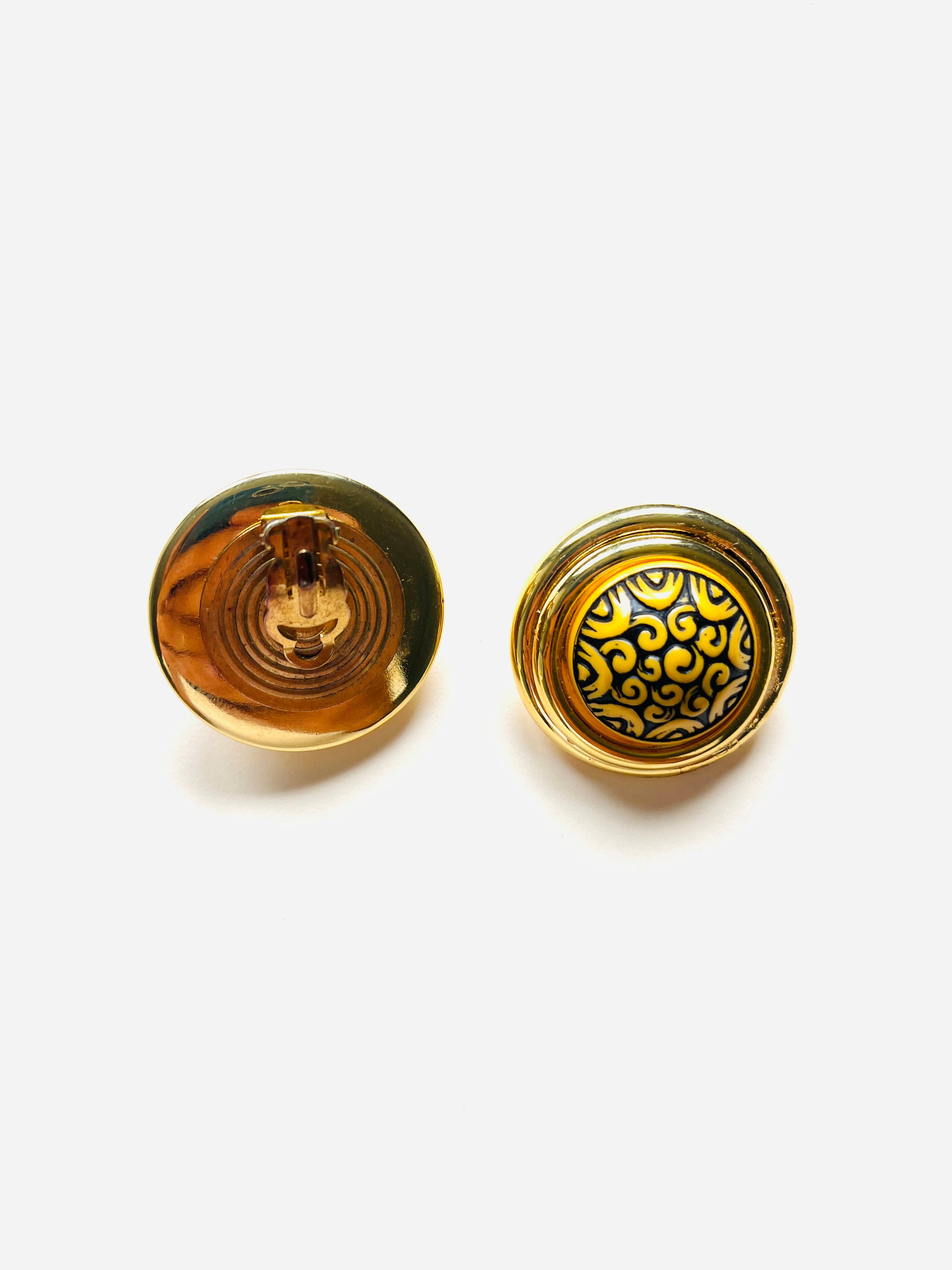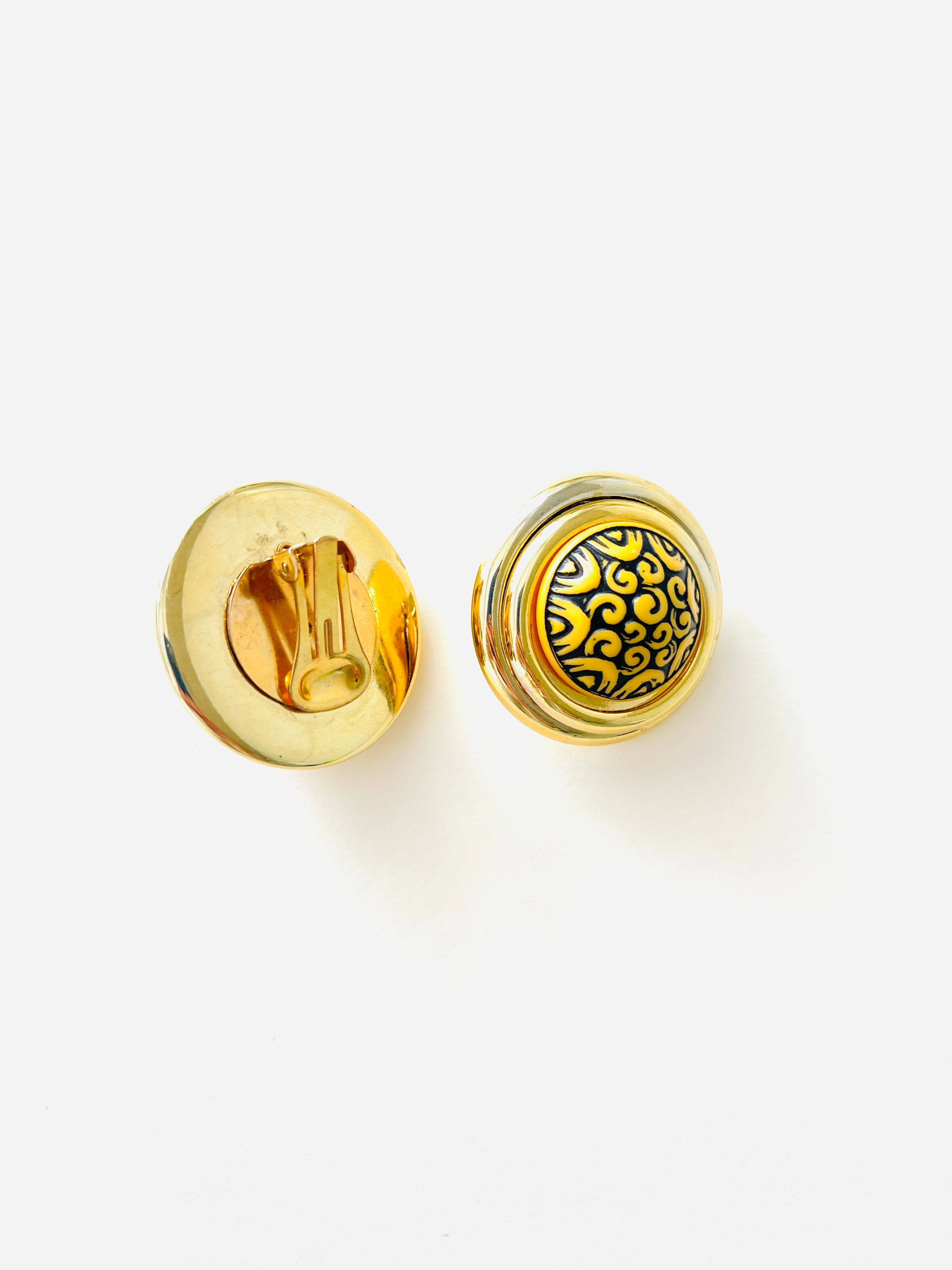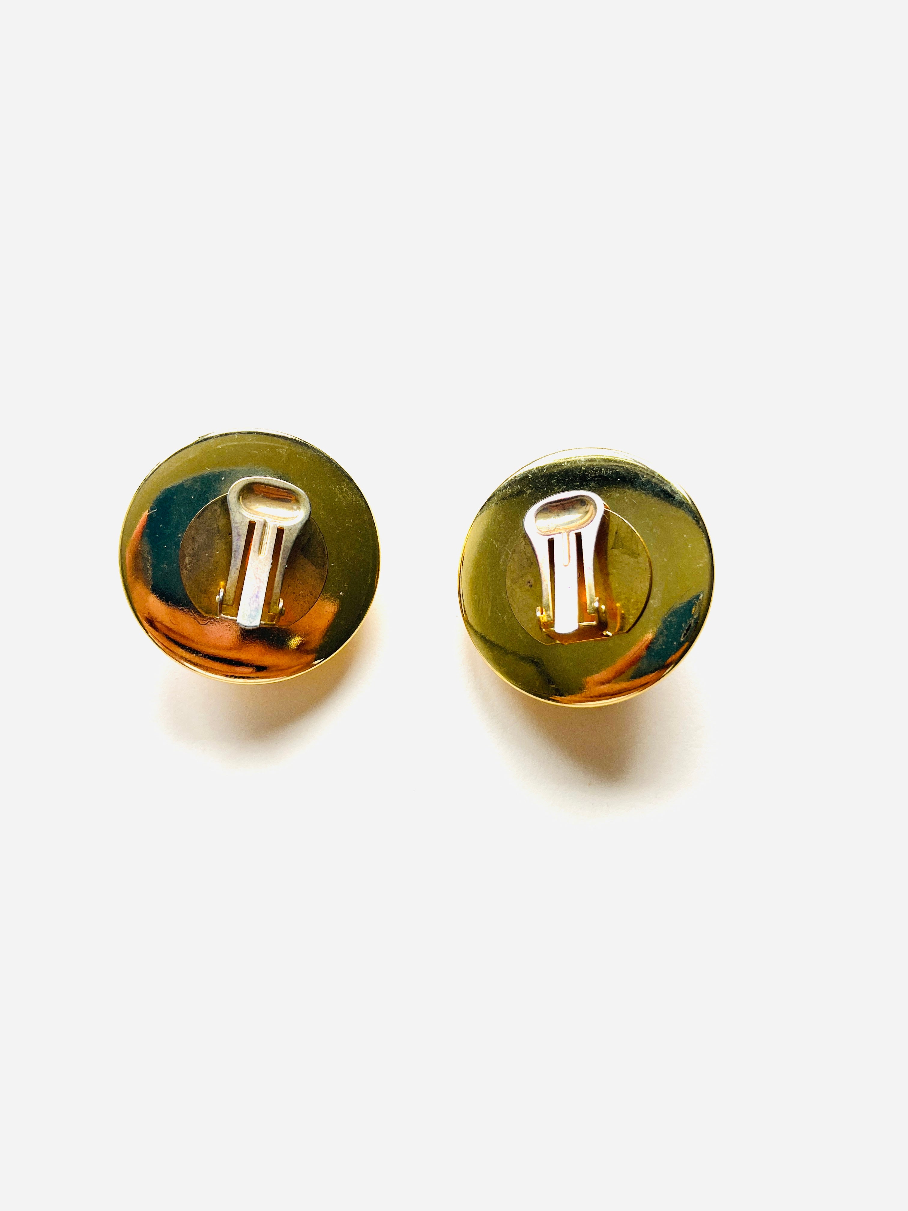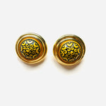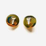 Pendientes vintage originales de los años 90 con cierre de clip. Base dorada redonda doble con detalle central tallado en color verde y negro.