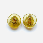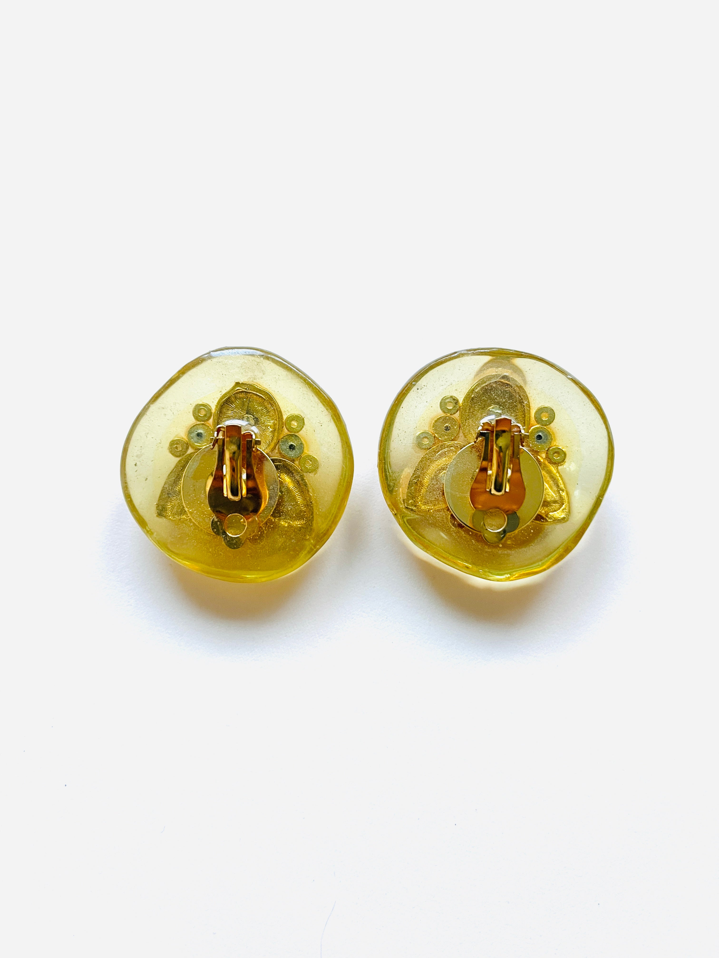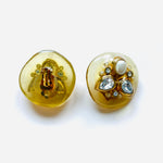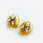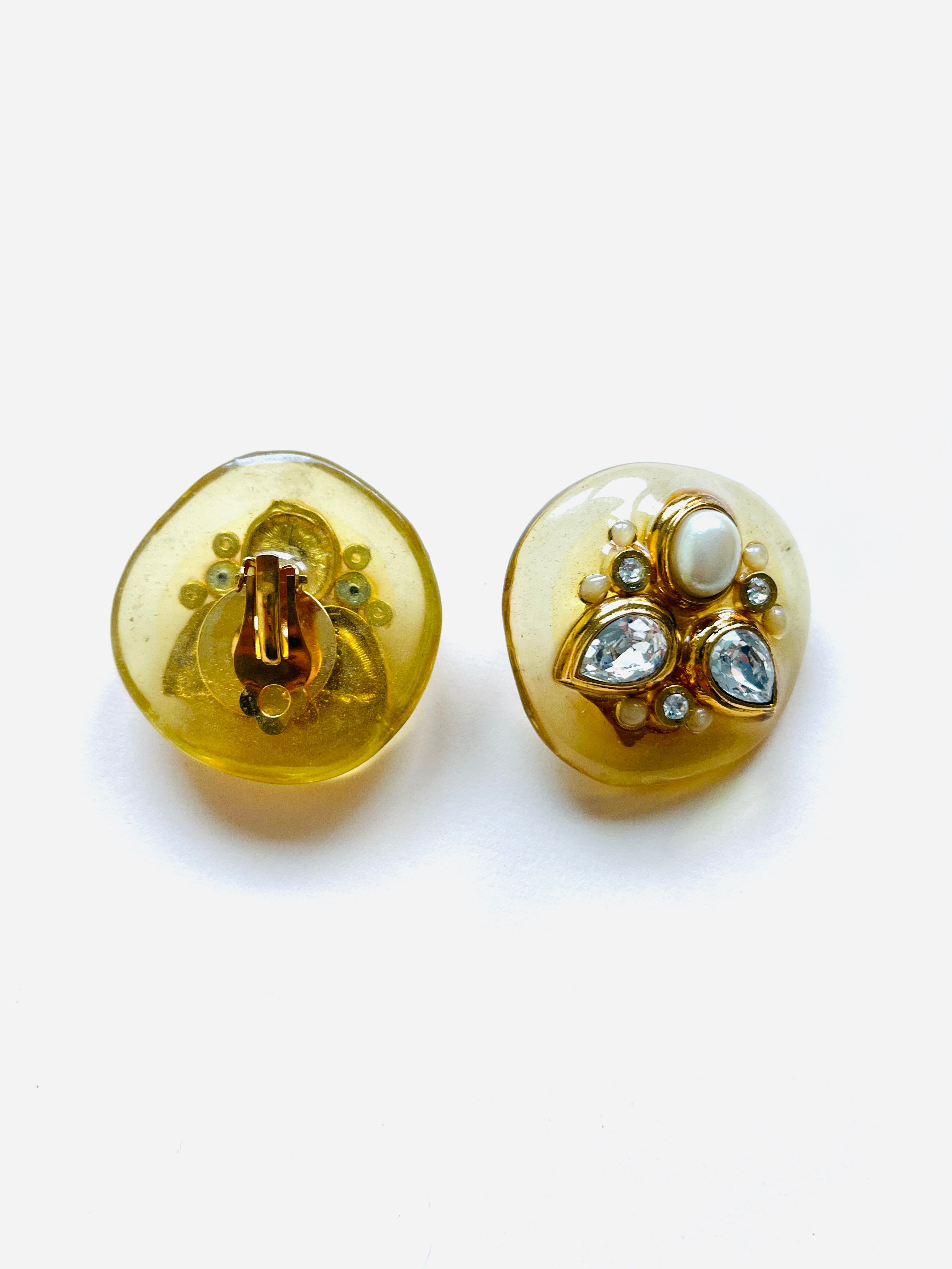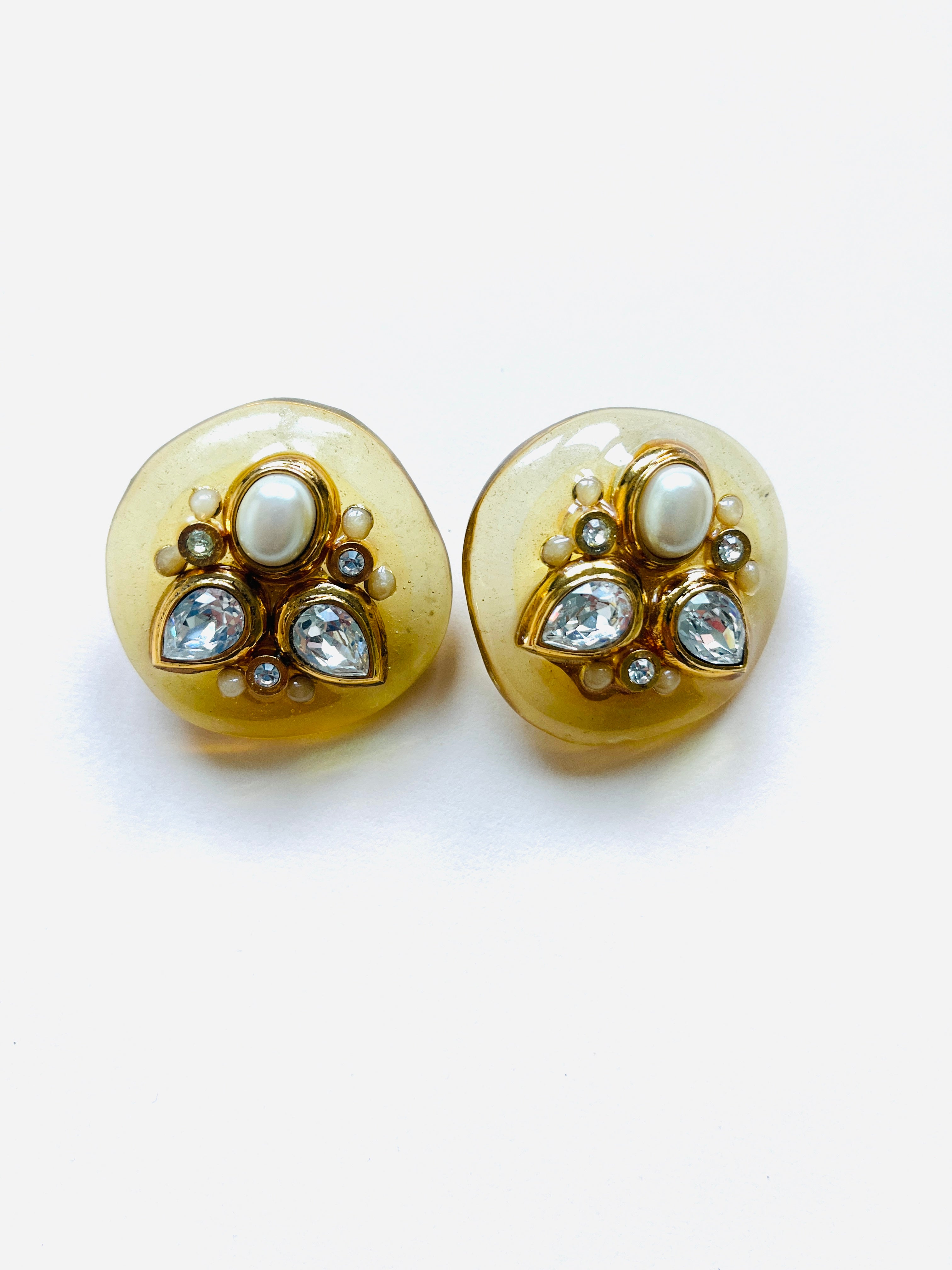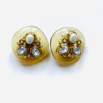 Pendientes vintage originales de los años 90 con cierre de clip. Base dorada de forma redonda y estructura de resina beige semi transparente con detalles centrales de cristal blanco y perla blanca en dorado.