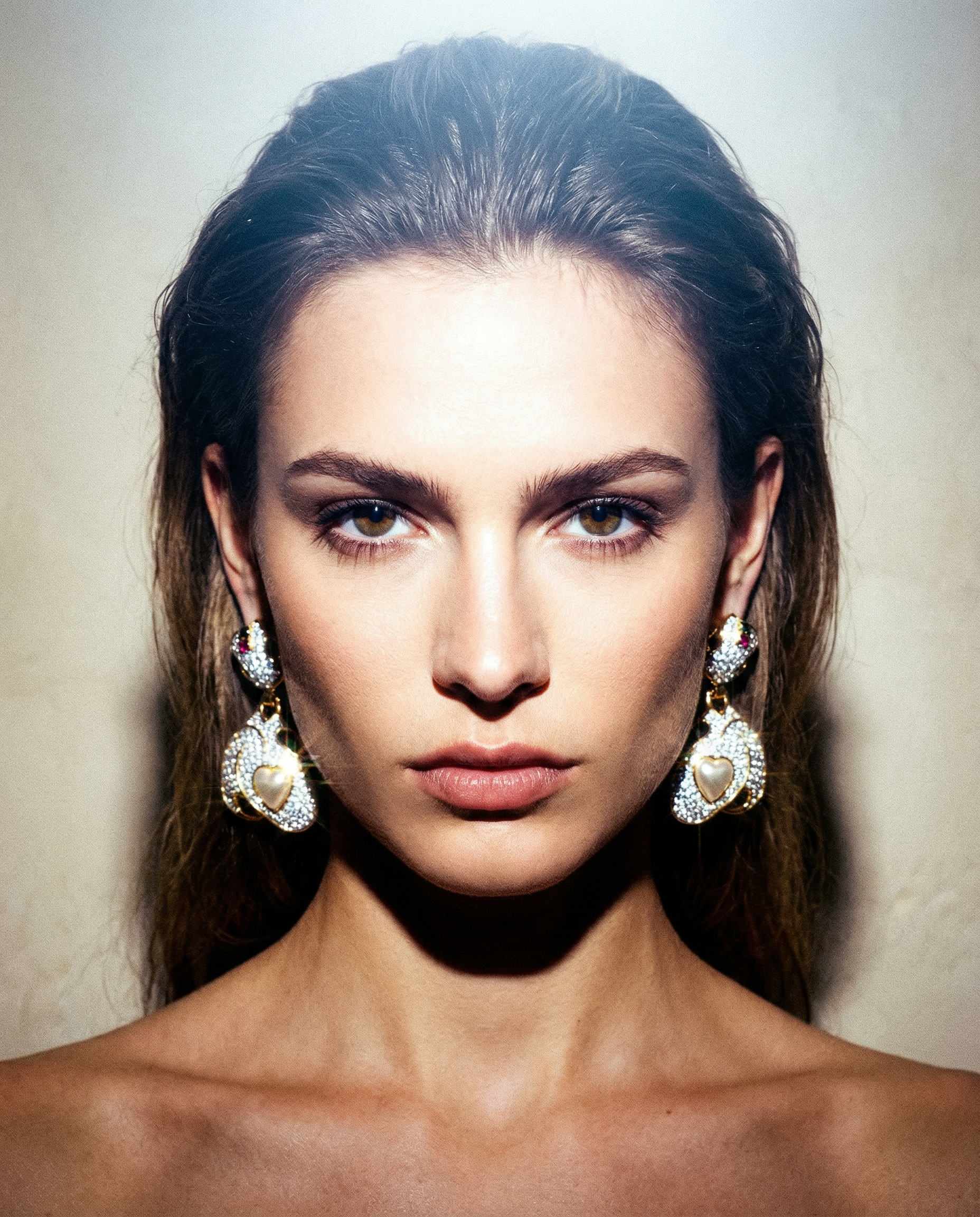 Pendientes vintage con base de cristal blanco y aplicaciones de cristal verde y violeta con colgante en perla blanca con forma de corazón.