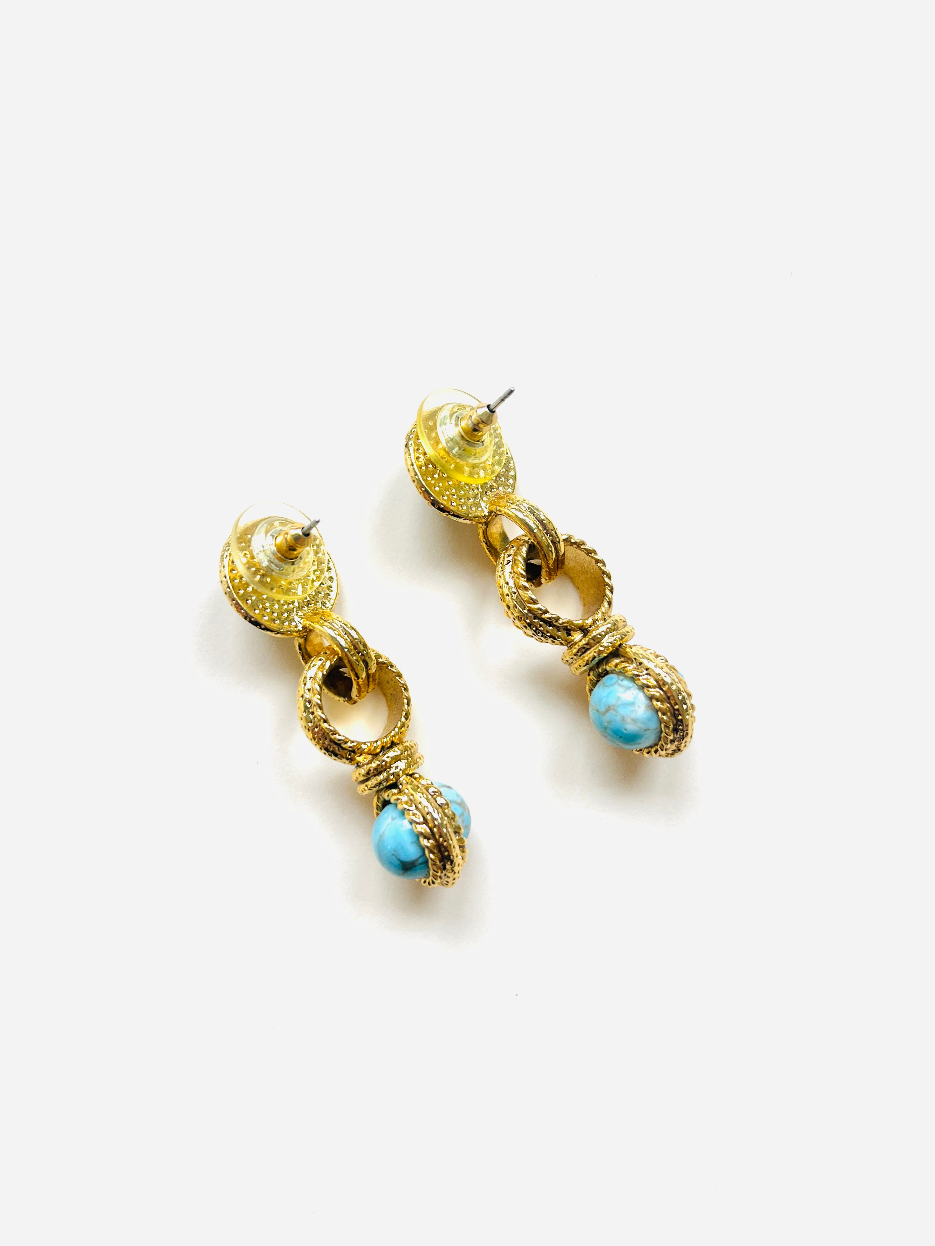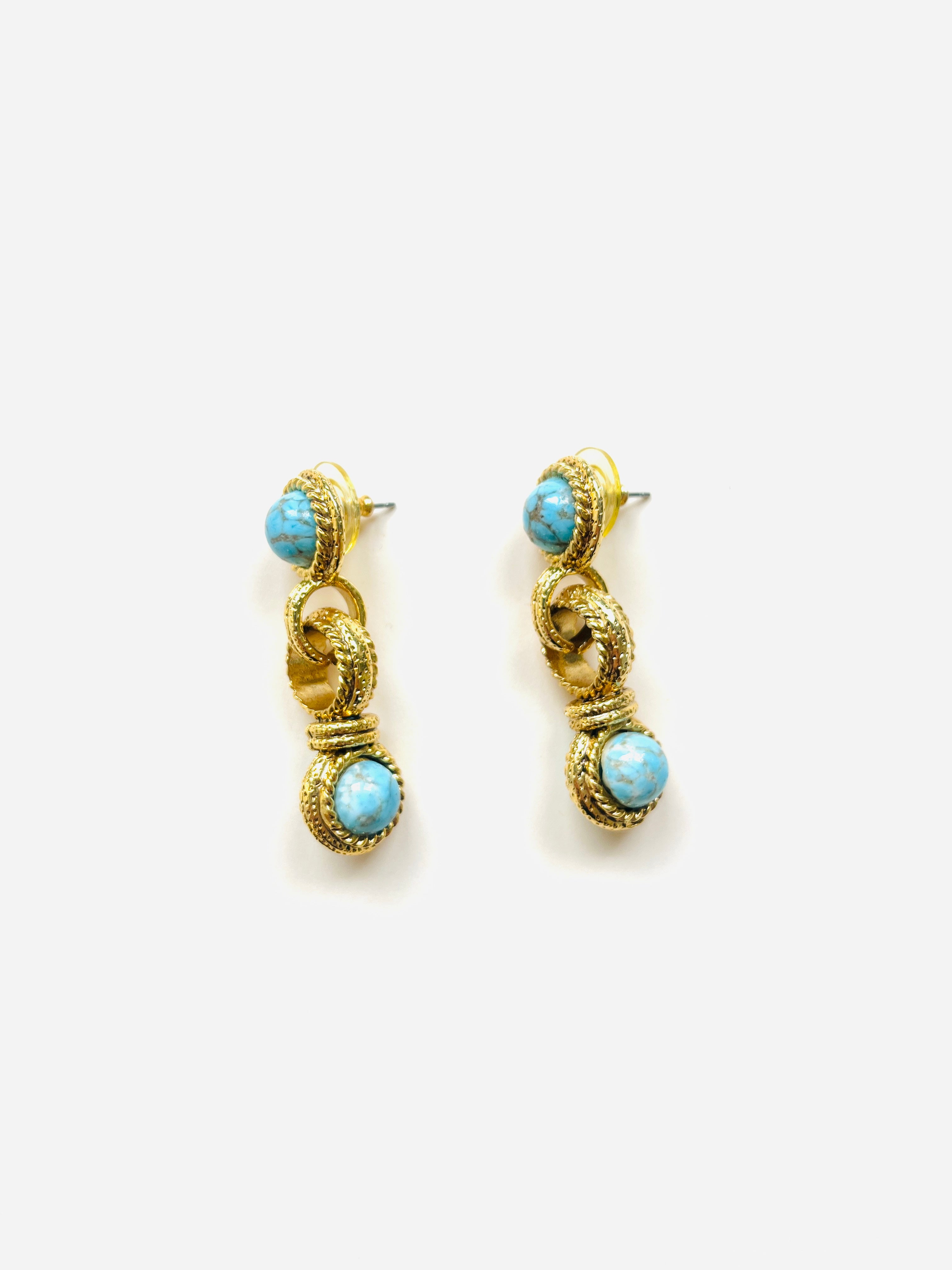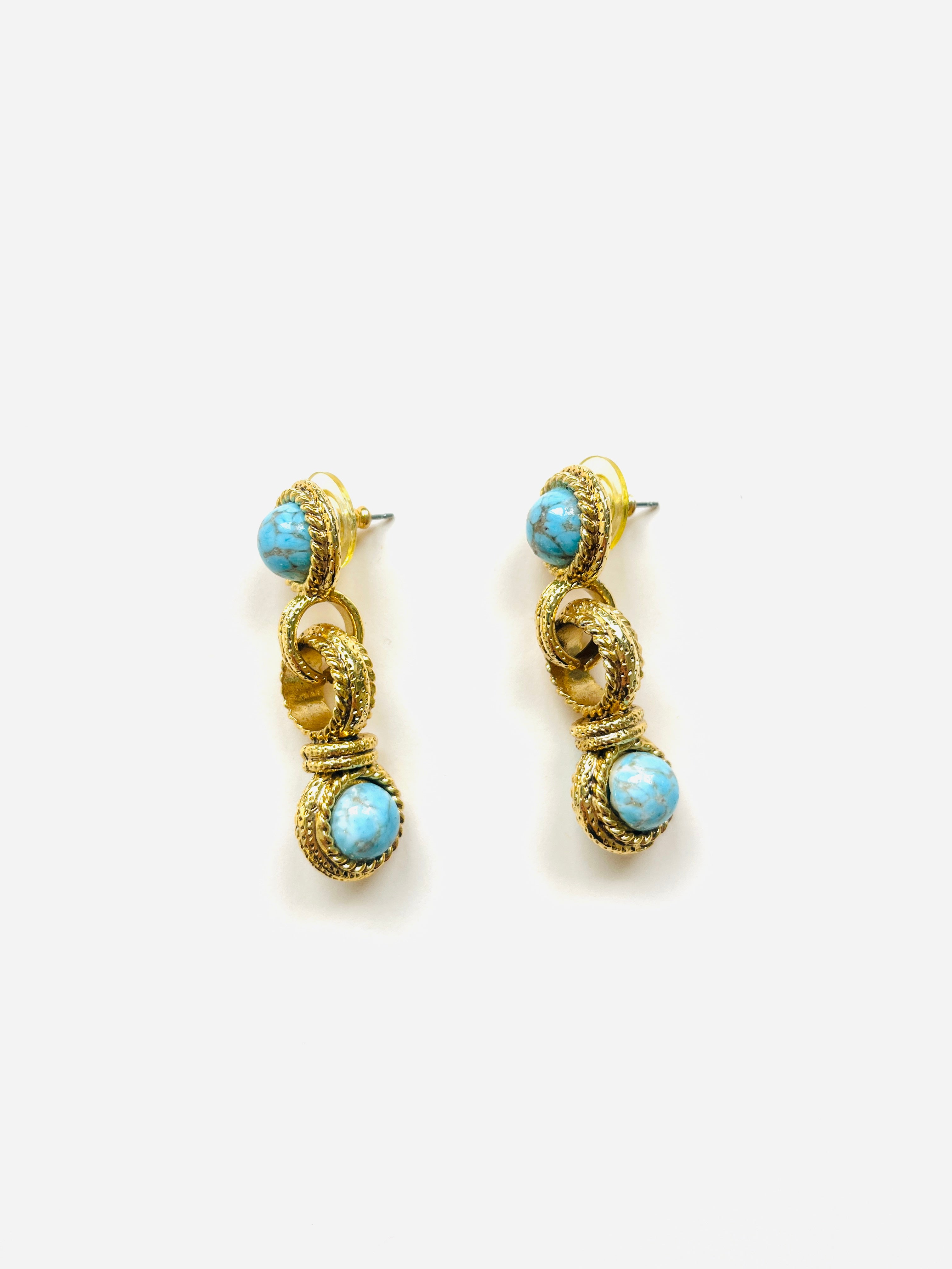 Pendientes vintage originales de los años 90 con cierre de tuerca. Base dorada redonda con aplique central y apliques de piedra azul.