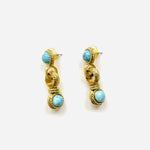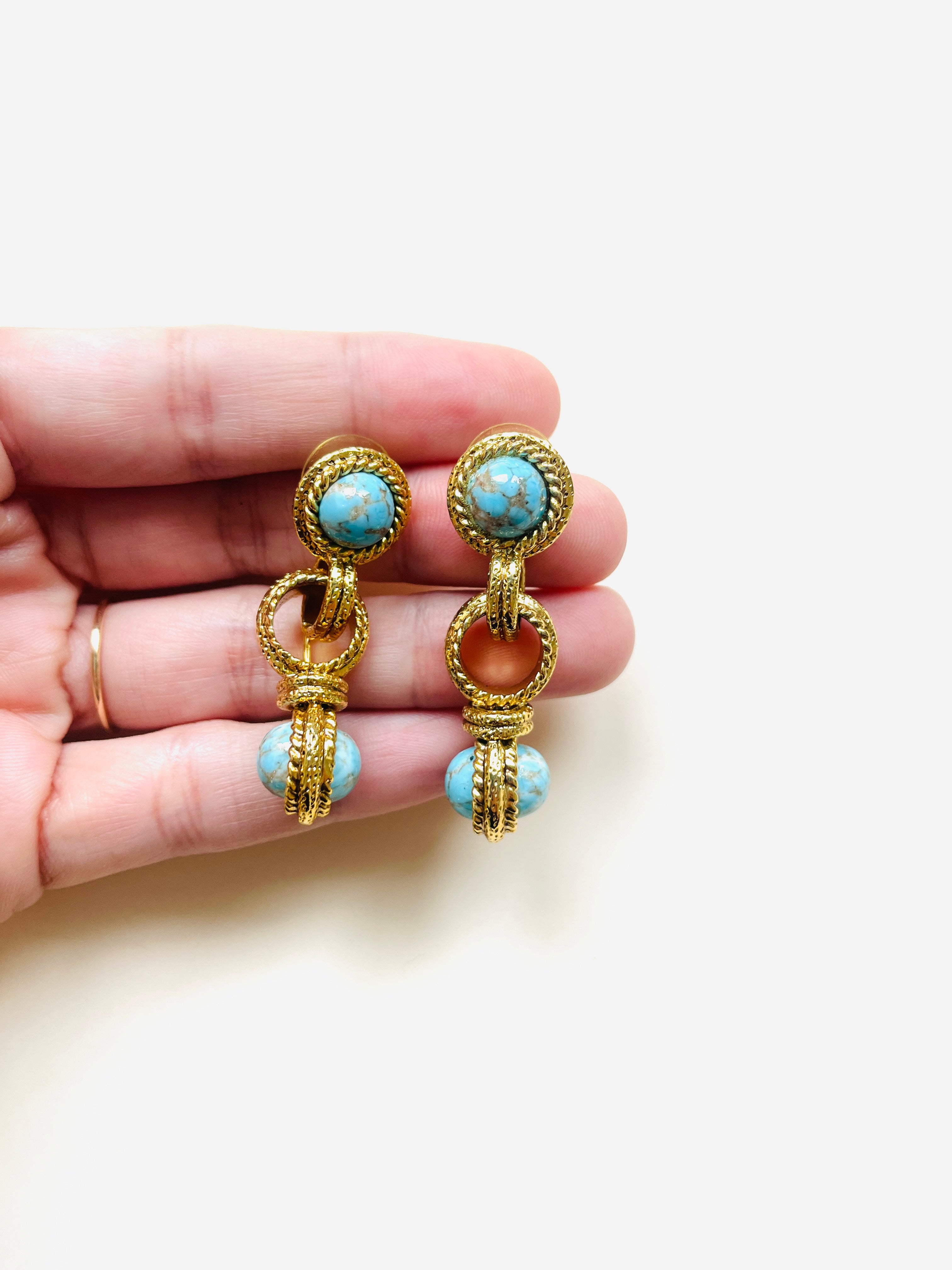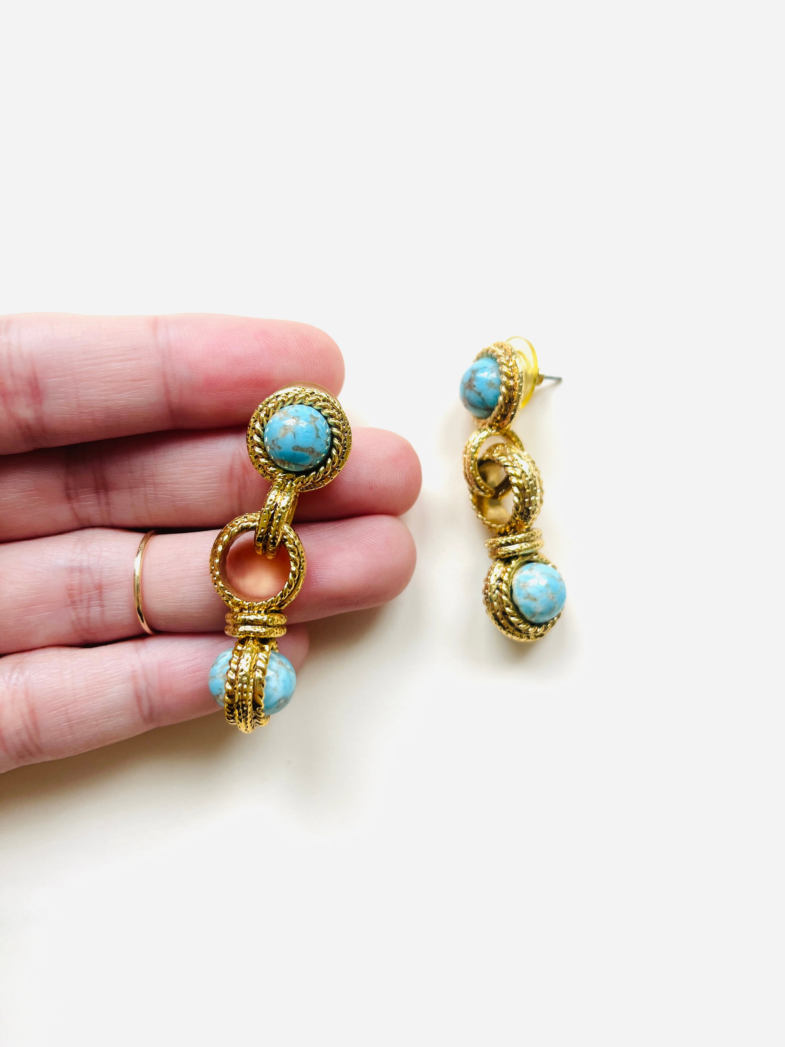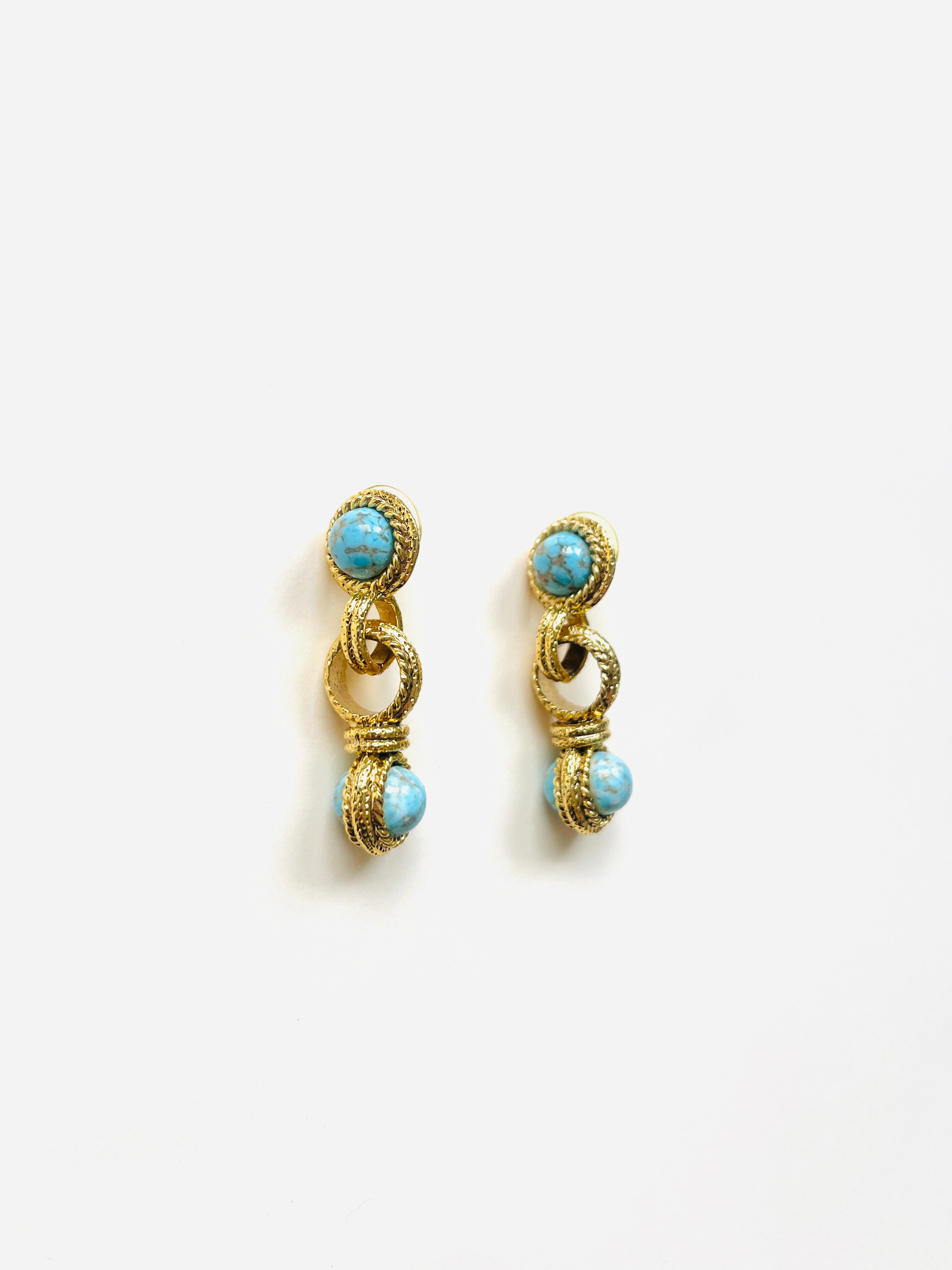 Pendientes vintage originales de los años 90 con cierre de tuerca. Base dorada redonda con aplique central y apliques de piedra azul.