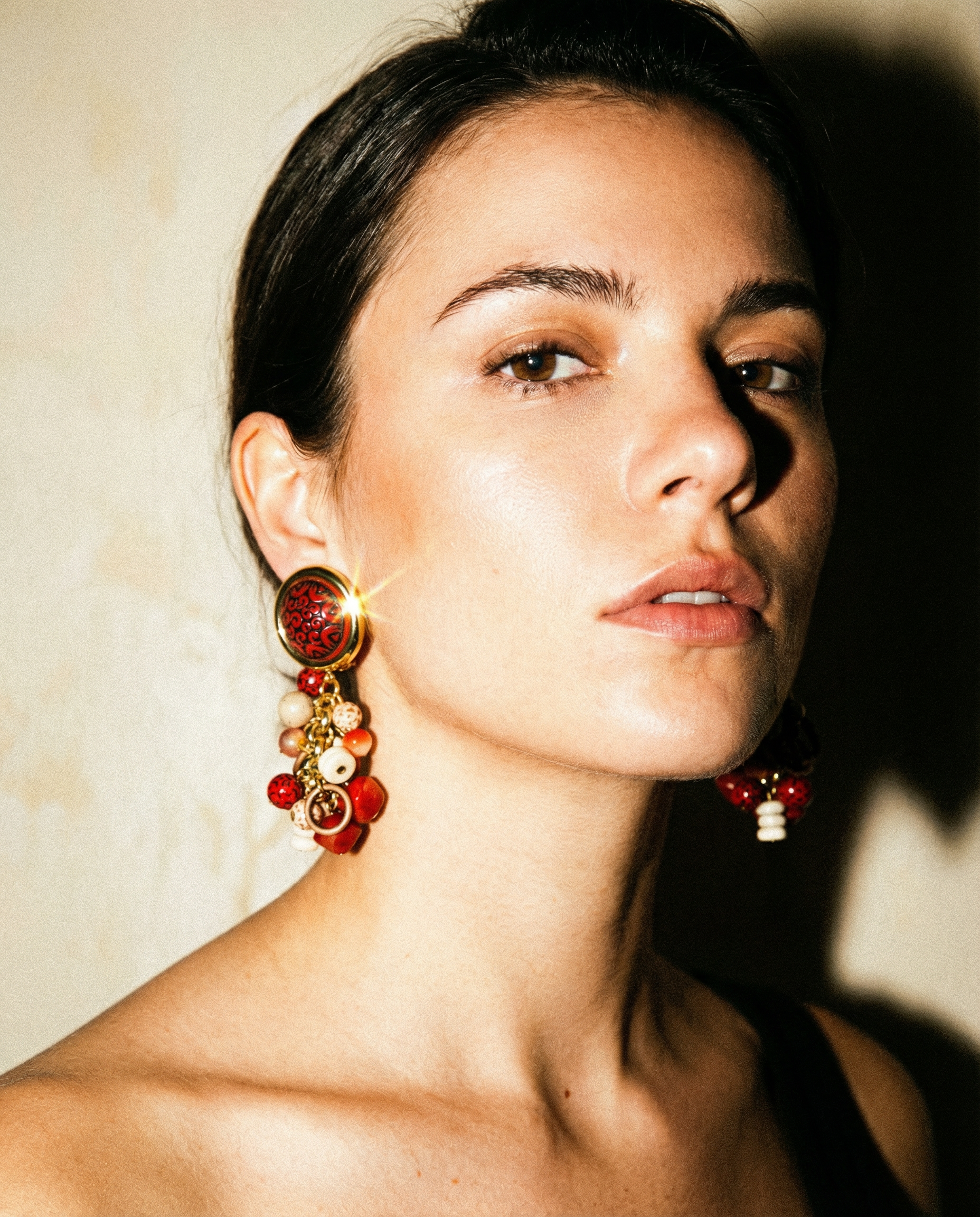 Maxi pendientes vintage originales de los años 90 con cierre de clip. Base dorada en forma redonda y colgante con abalorios en color rojo y beige.