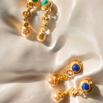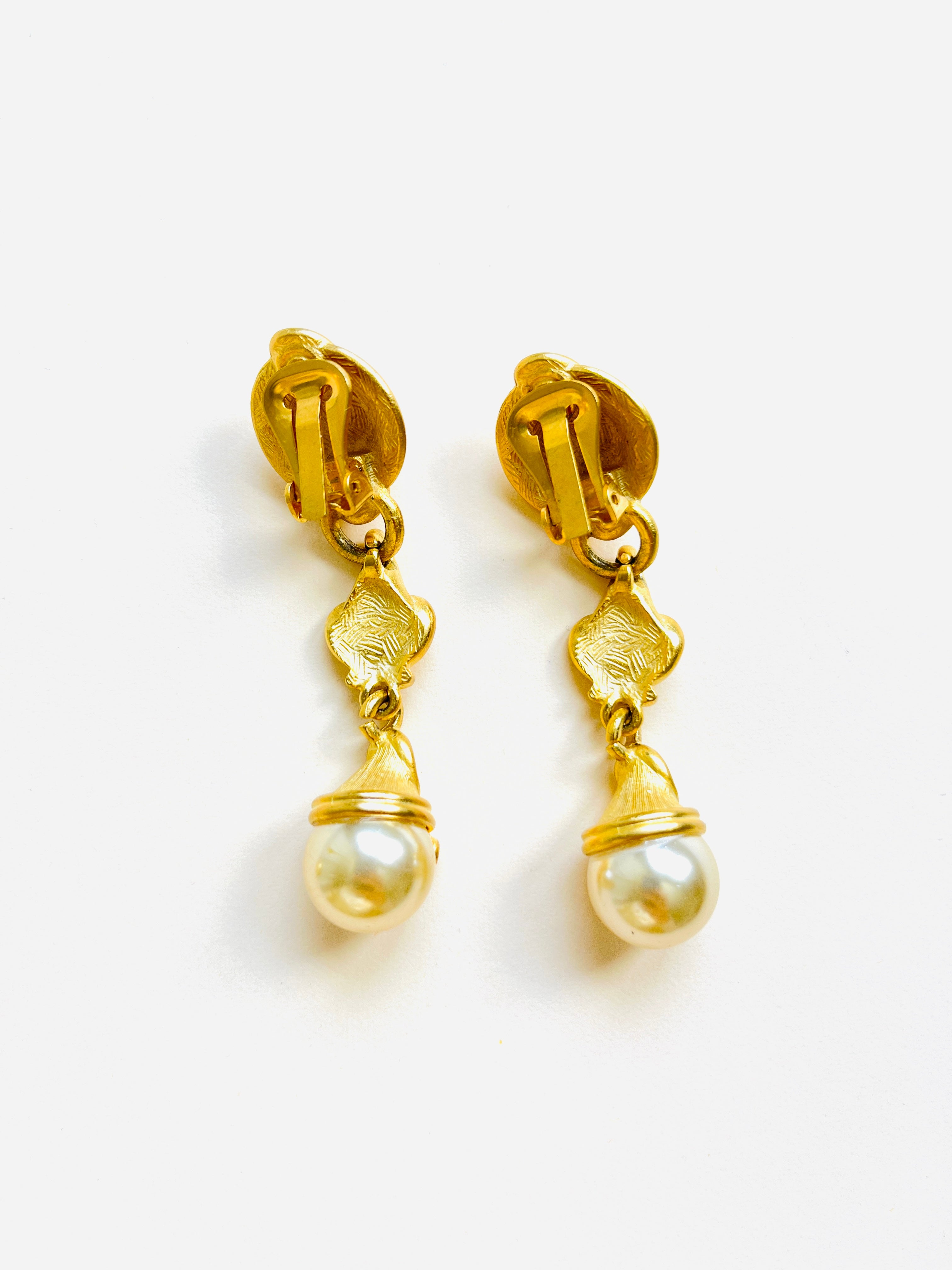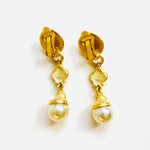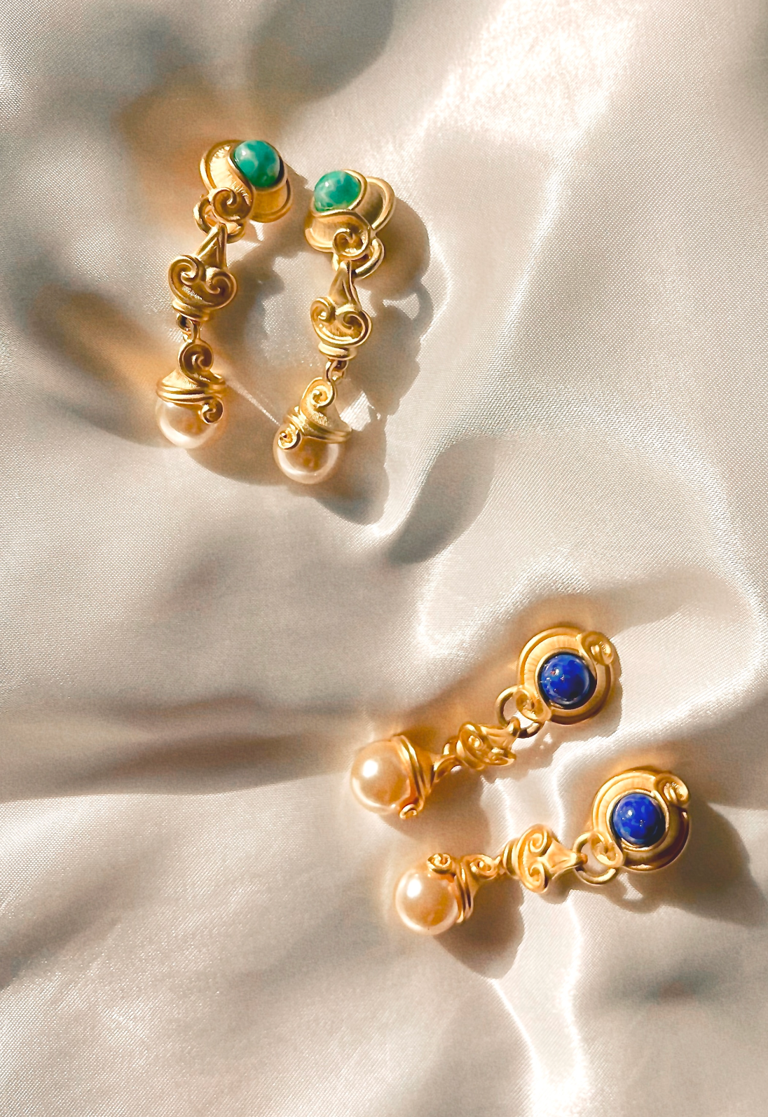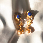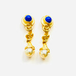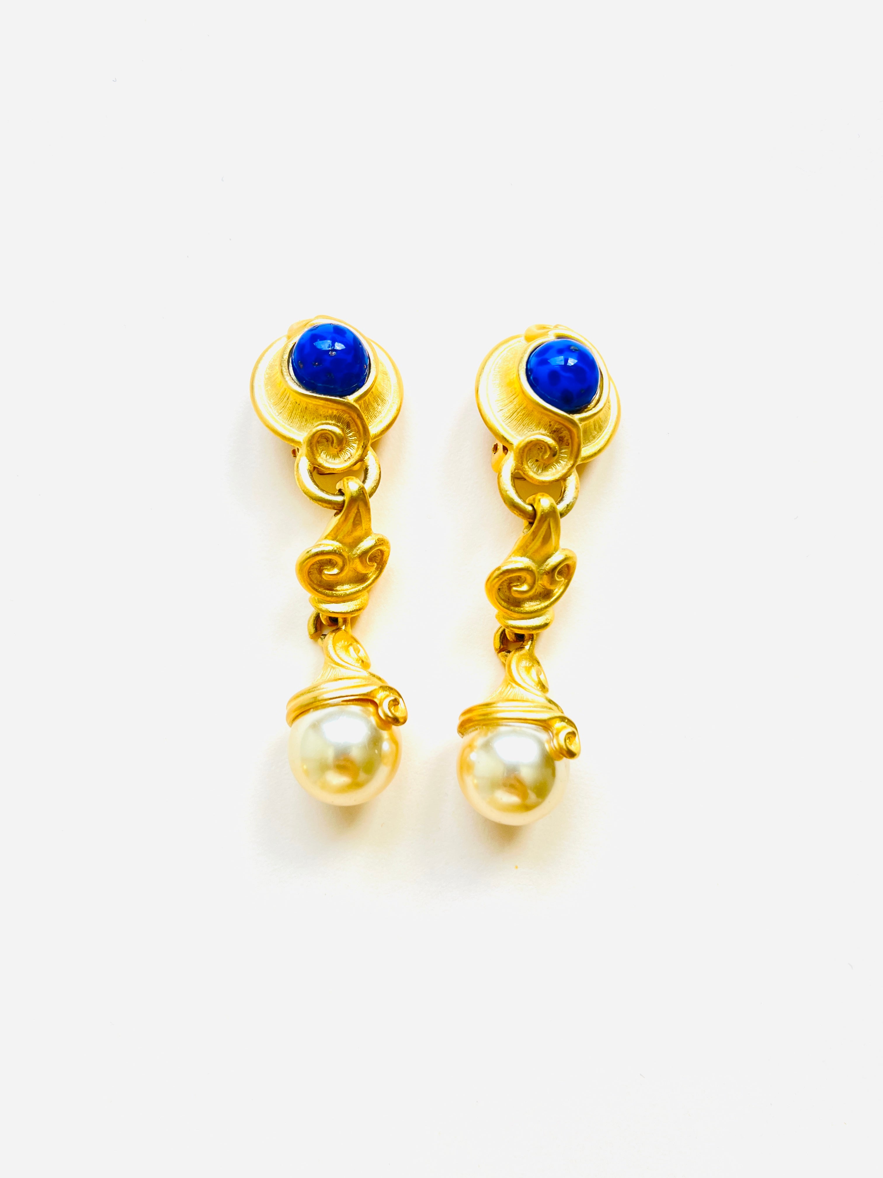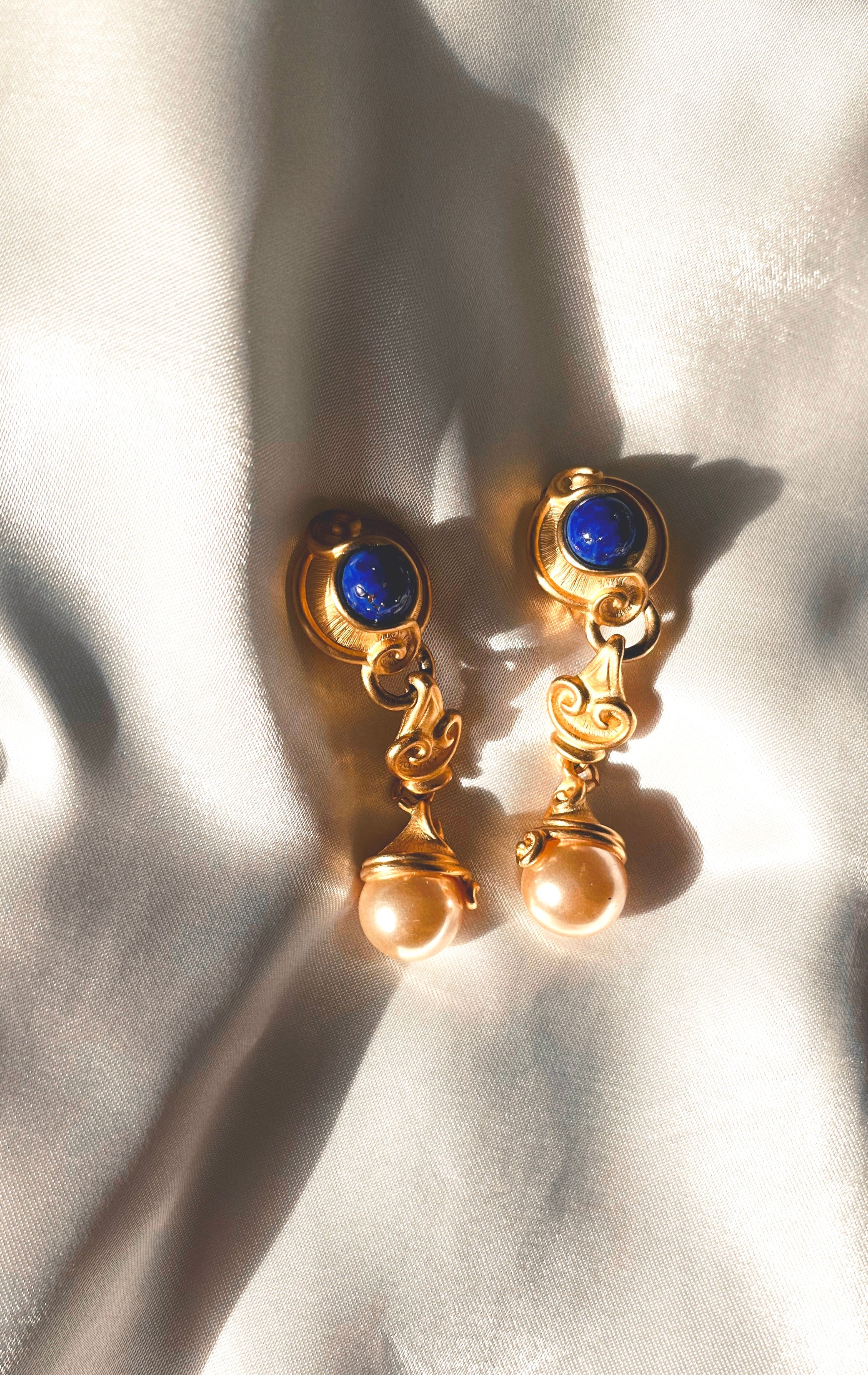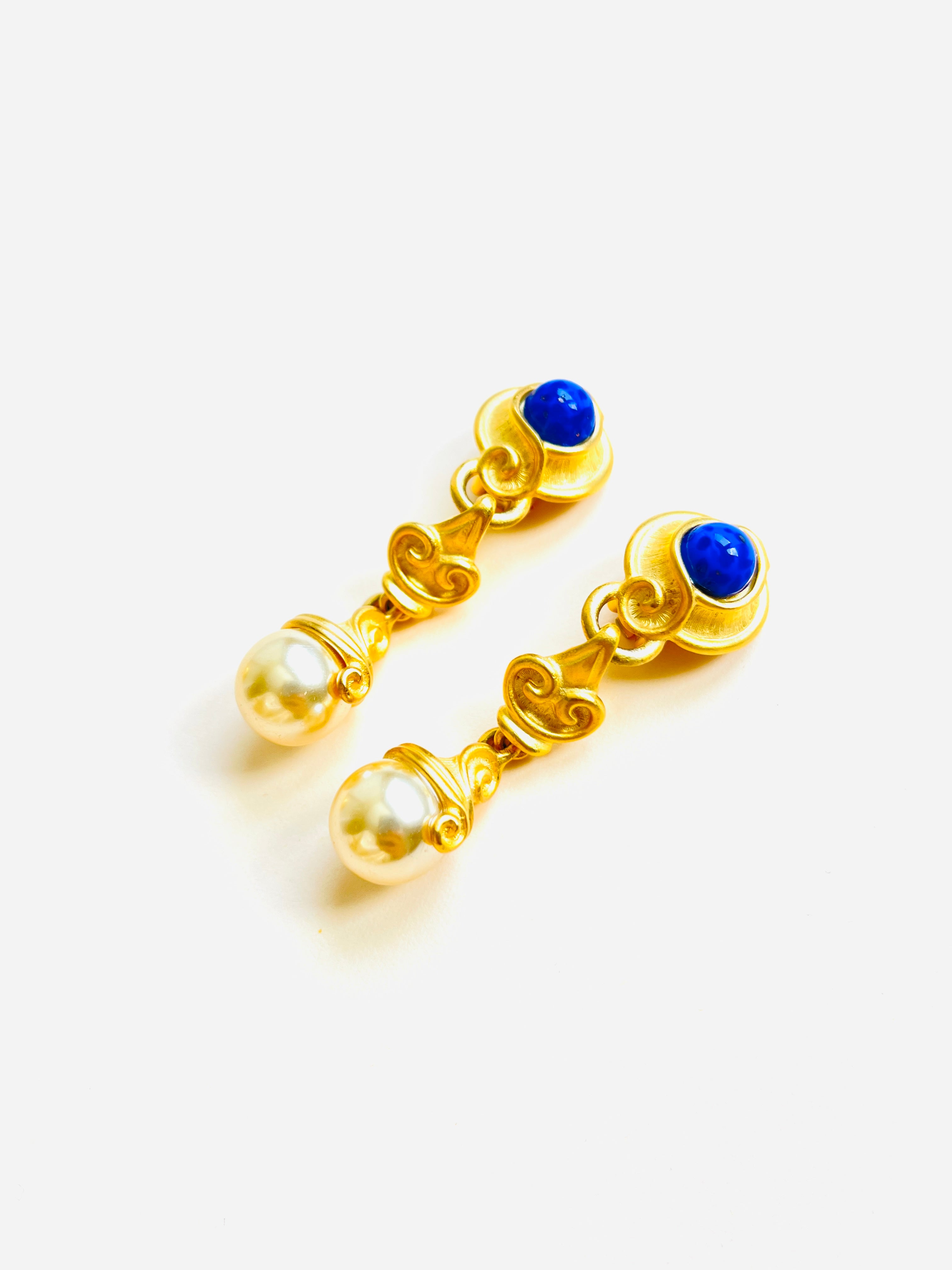 Pendientes vintage originales de los años 90 con base dorada mate, cristal azul central y colgante de perla blanca.
