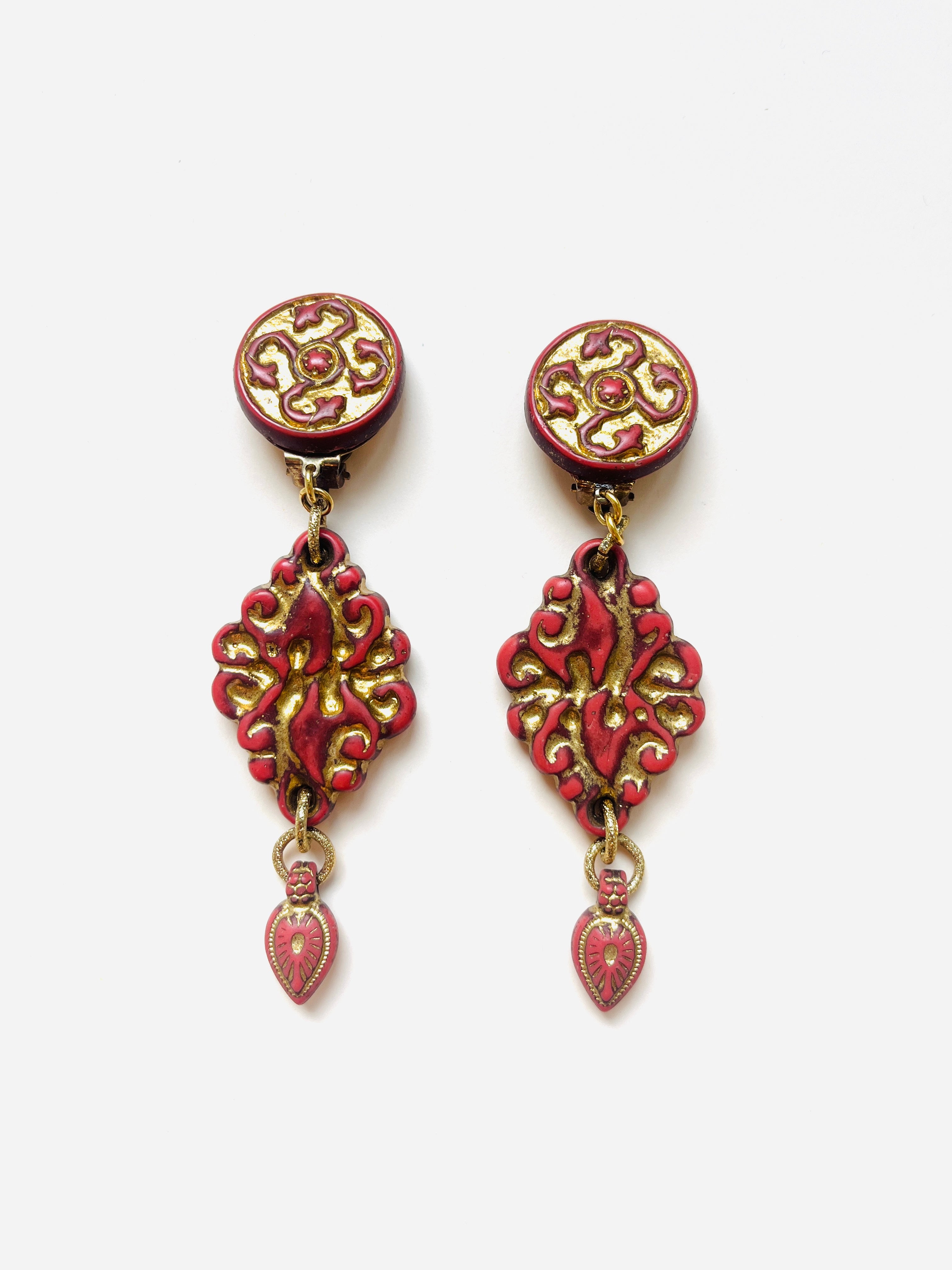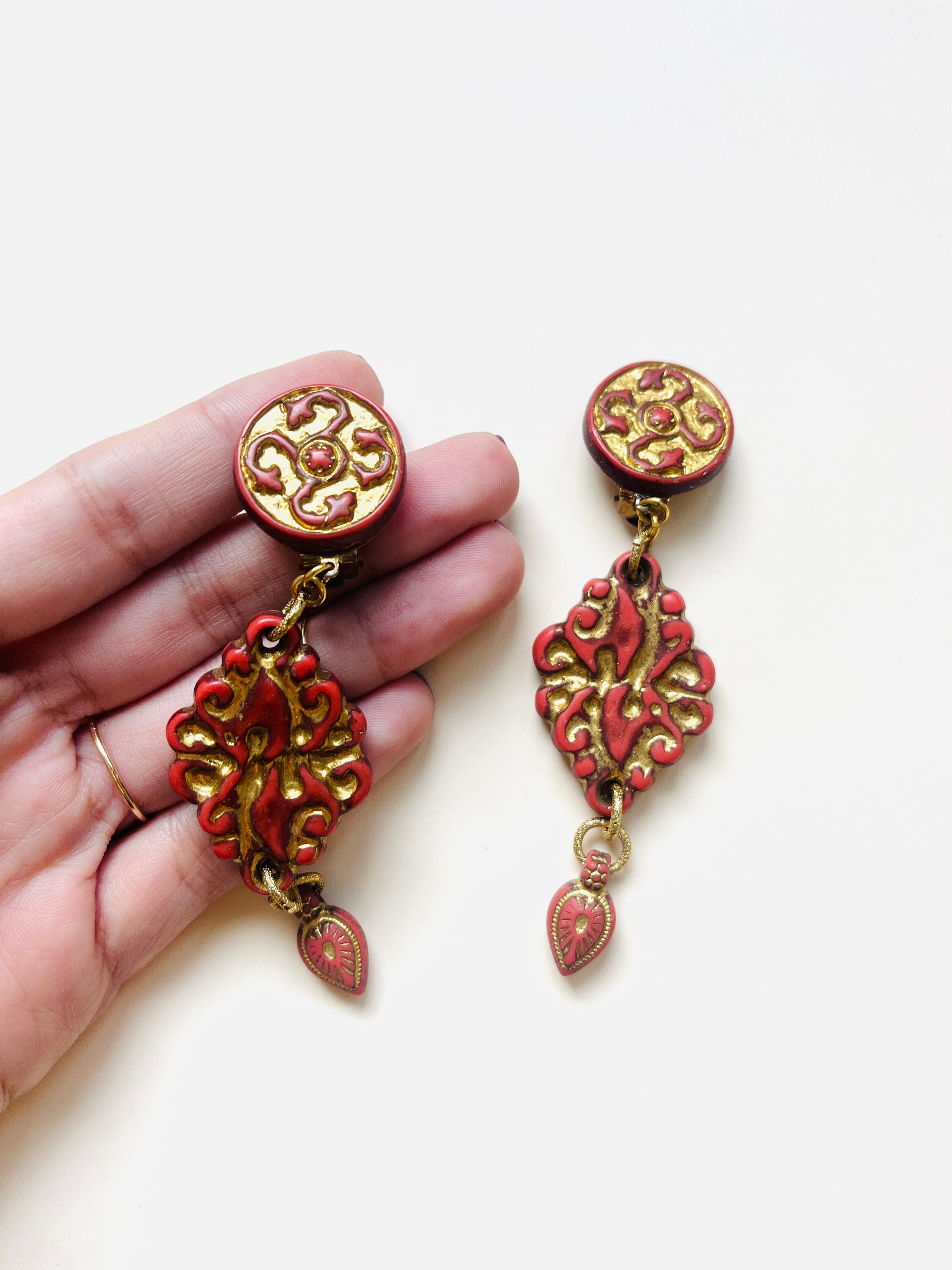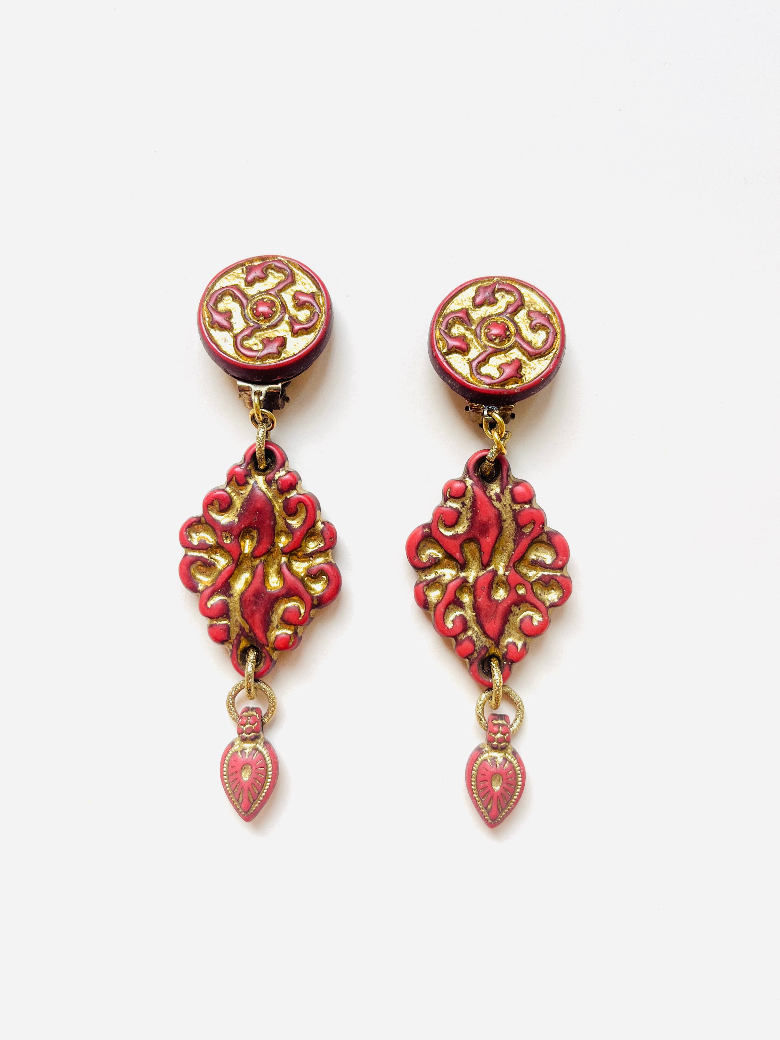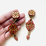 Maxi pendientes vintage originales de los años 90 con cierre de clip. Base dorada redonda con detalle central y colgante tallado en color teja con toques dorados.