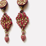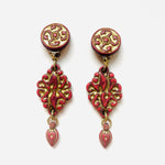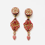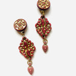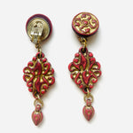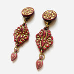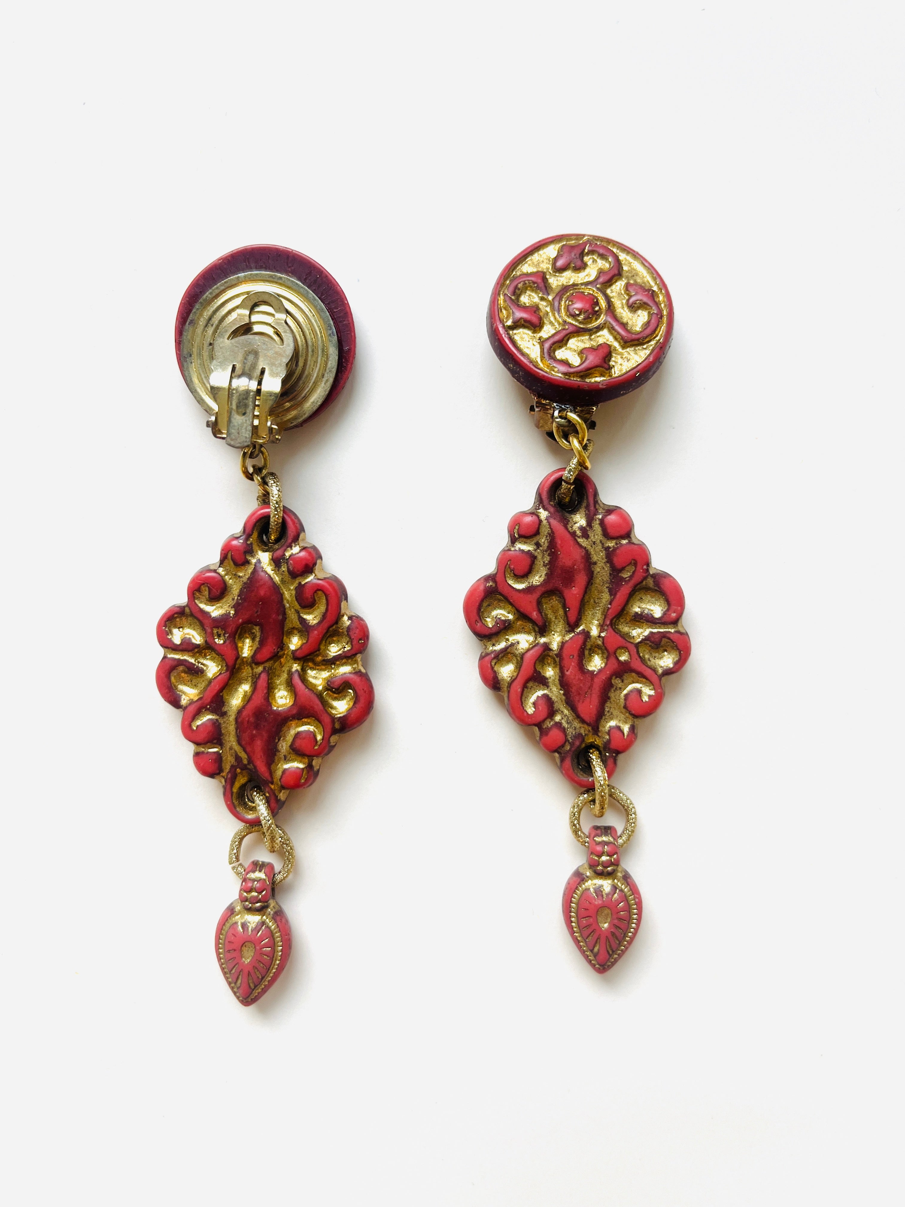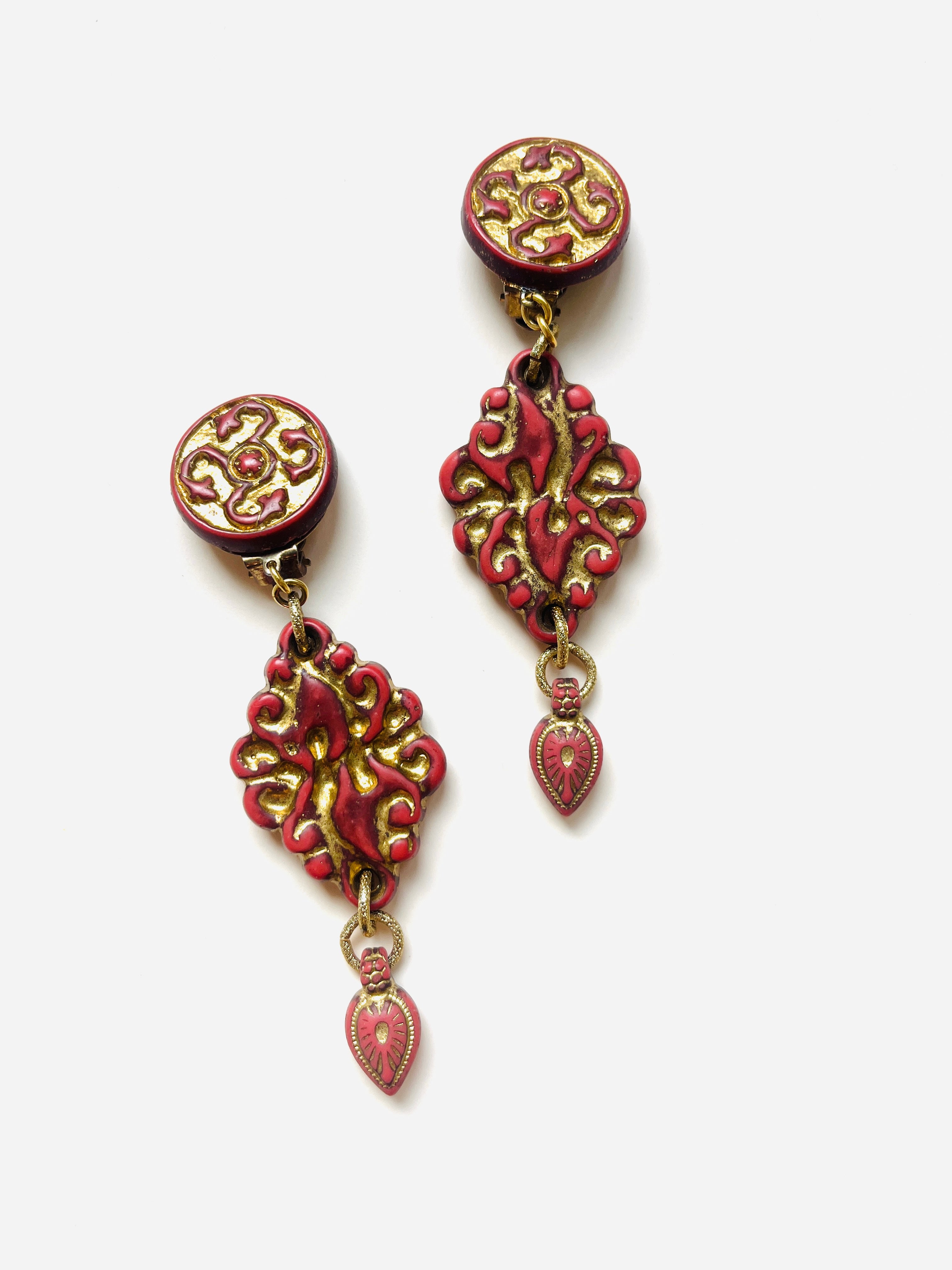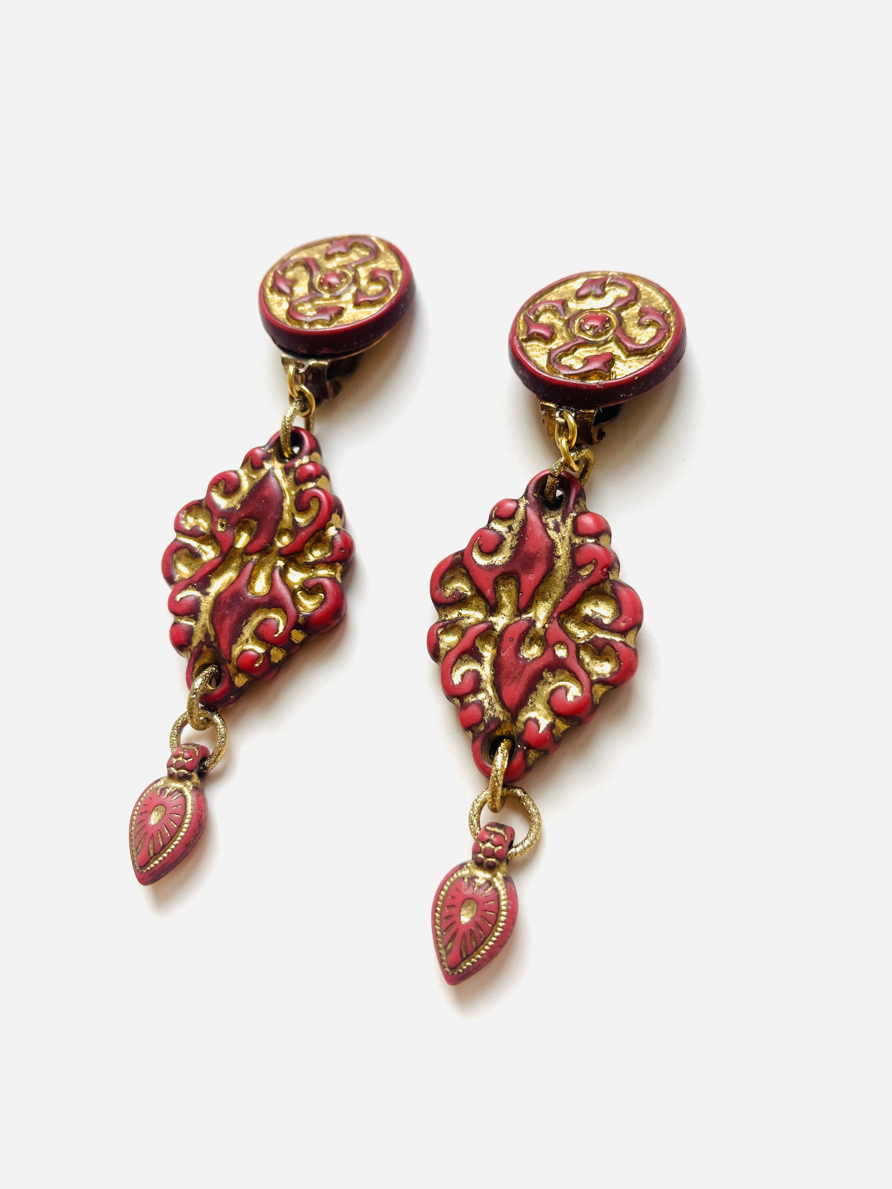 Maxi pendientes vintage originales de los años 90 con cierre de clip. Base dorada redonda con detalle central y colgante tallado en color teja con toques dorados.