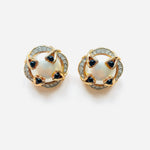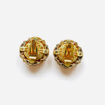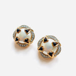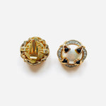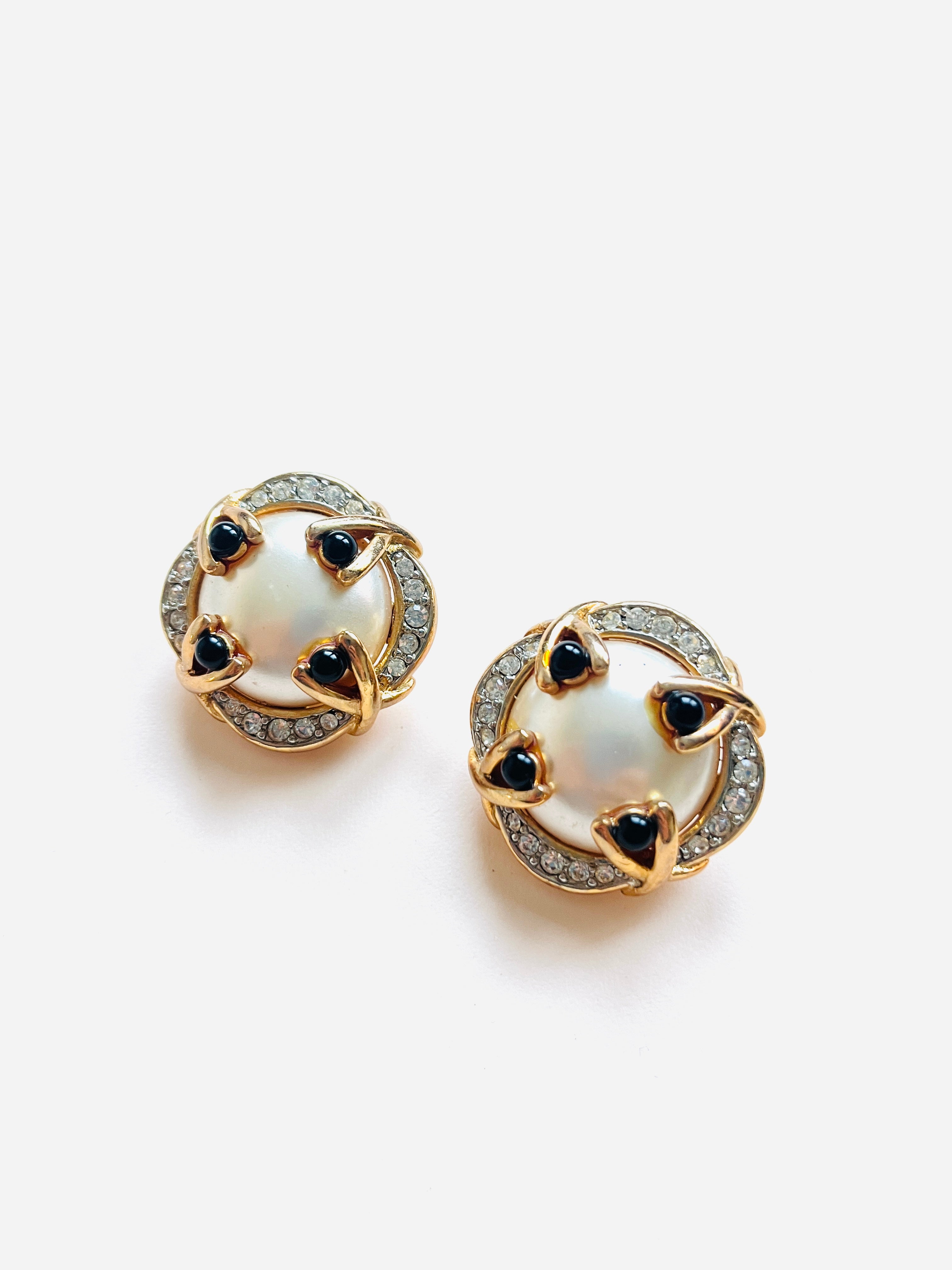 Pendientes vintage originales de los años 90 con cierre de clip. Base dorada, maxi perla blanca y detalles en cristal blanco y negro.