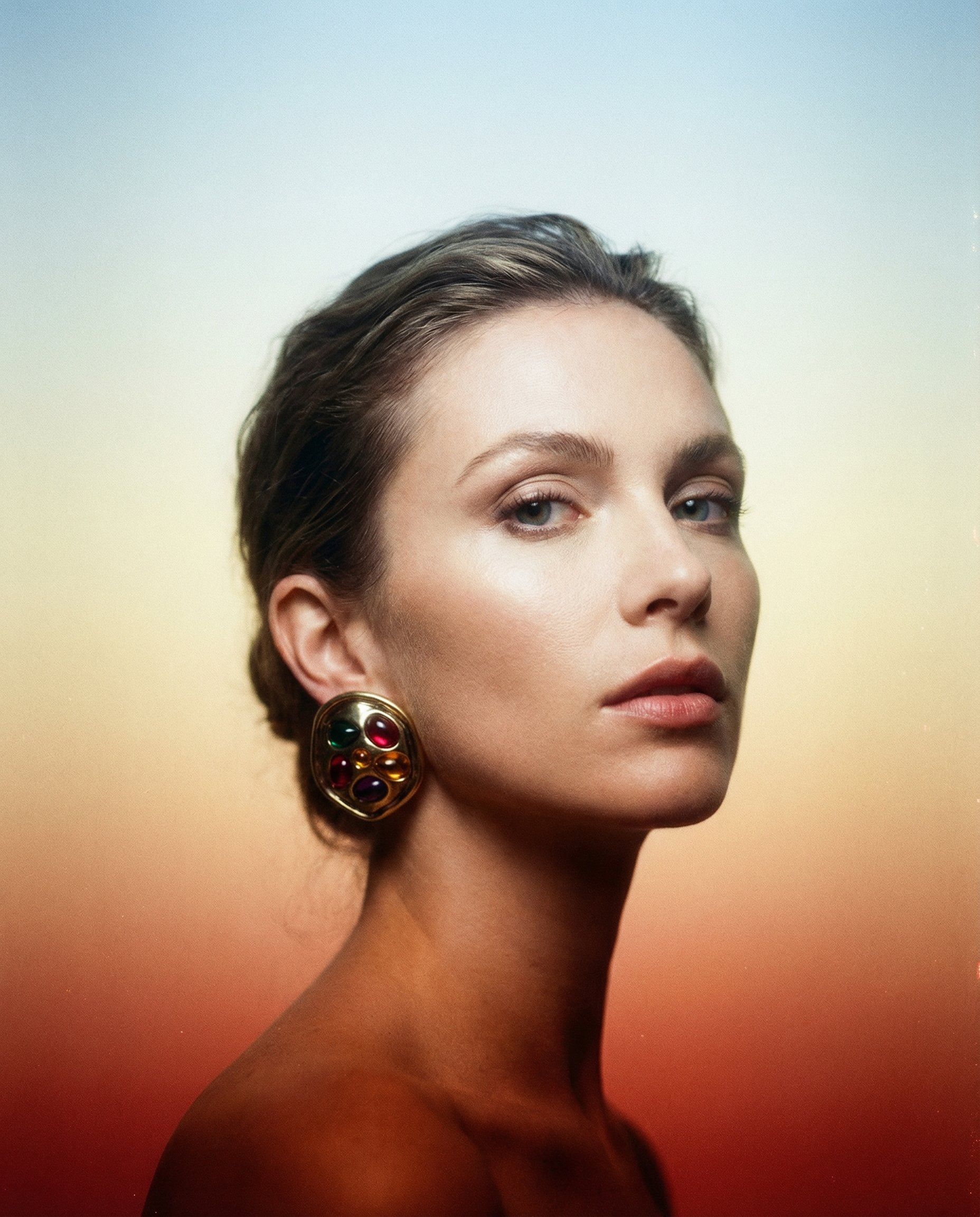 Maxi pendientes vintage originales de los años 90 con cierre de clip. Base dorada redonda con maxi cristales multicolor.
