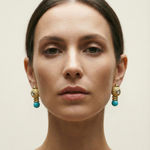 Pendientes vintage originales de los años 90 con cierre omega. Base dorada redonda en dorado, detalle en abalorio azul turquesa y aplique en cristal blanco.