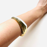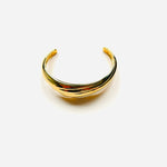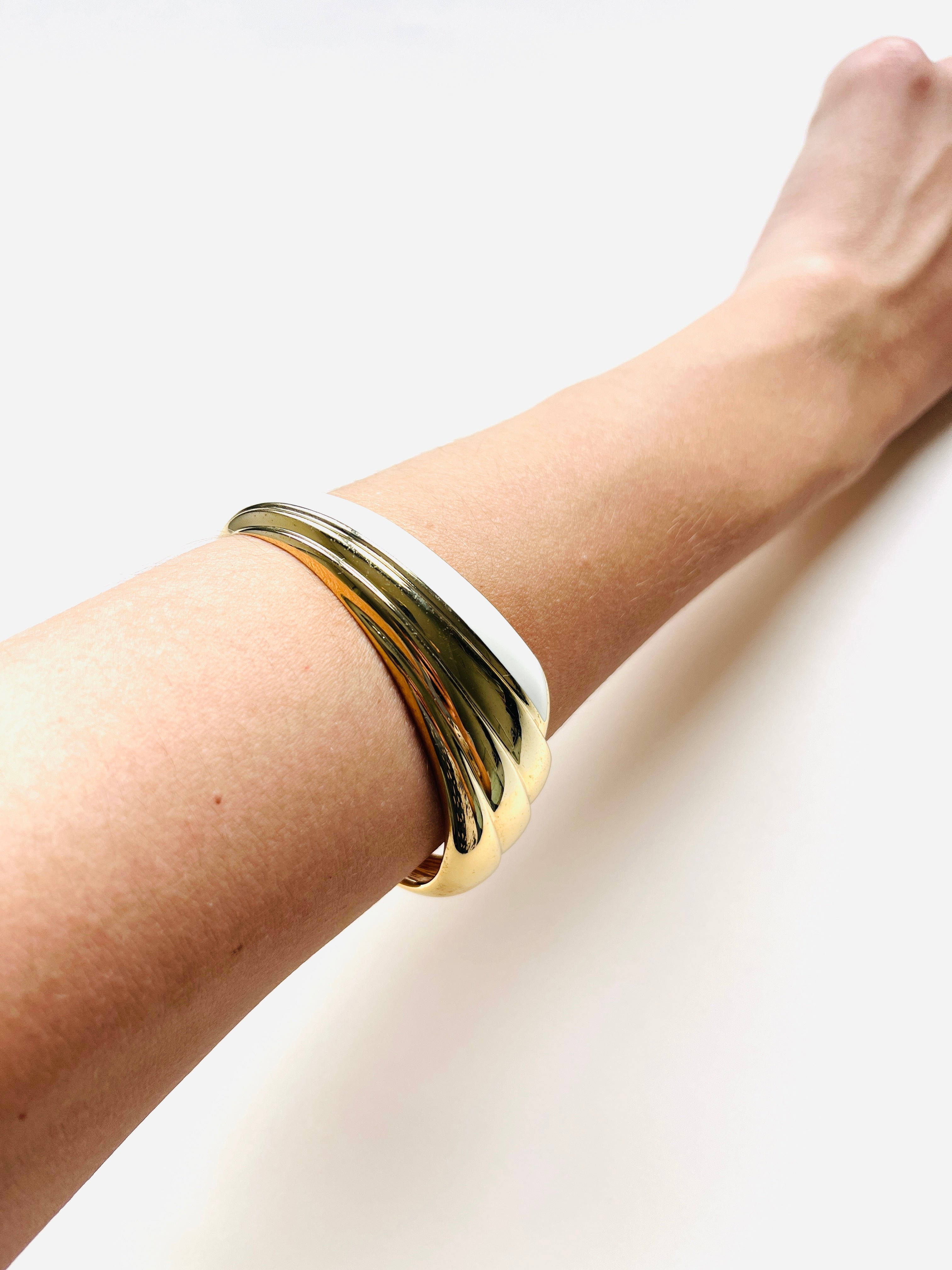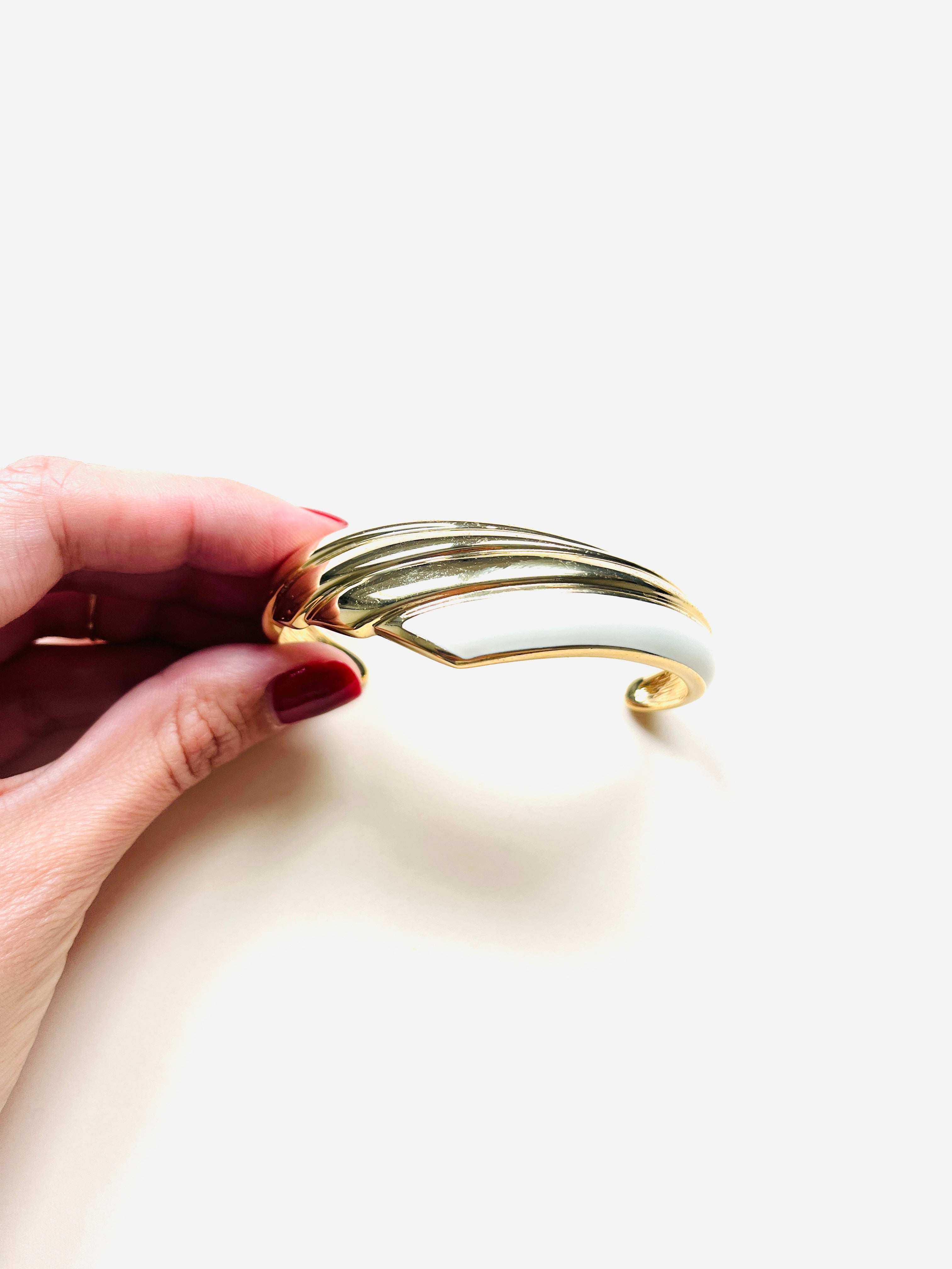 Pulsera vintage original de los años 90 de base dorada rígida abierta y detalle de esmaltado blanco.