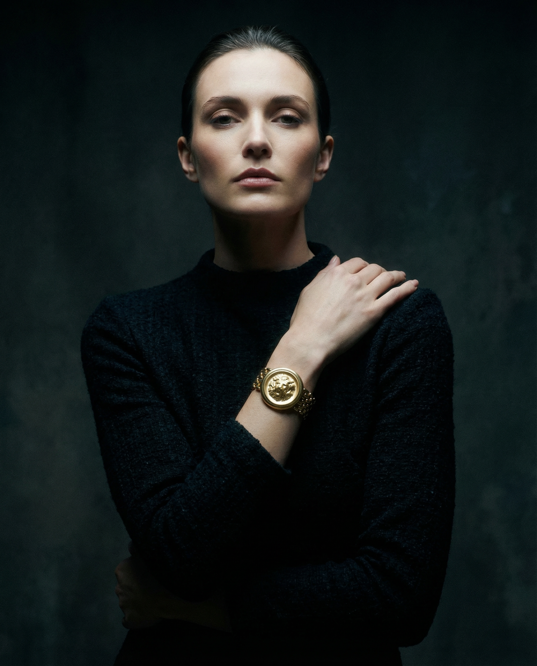 Pulsera vintage original de los años 90 con cadena y detalle central con cabeza de león en dorado.