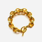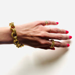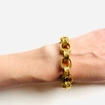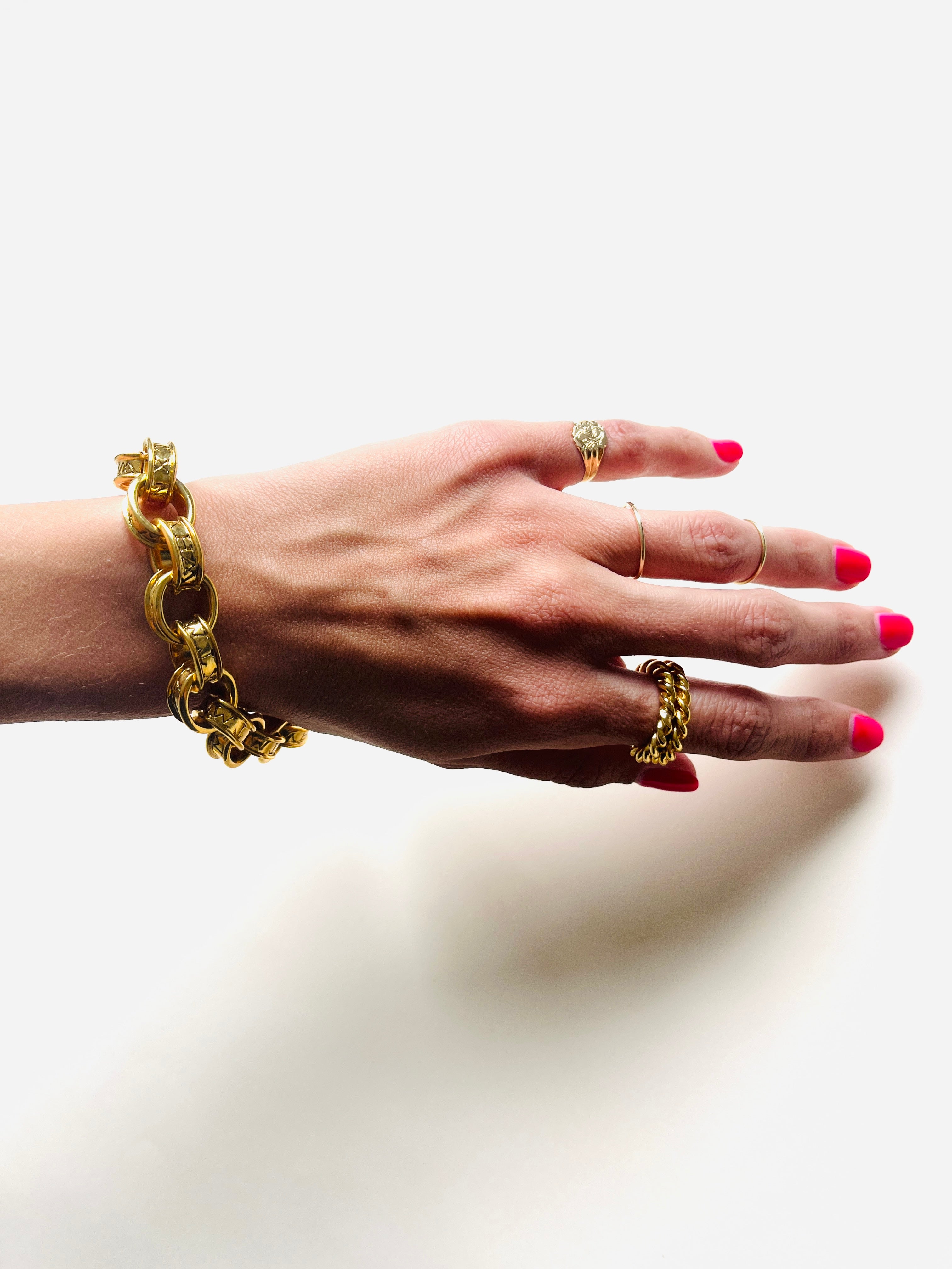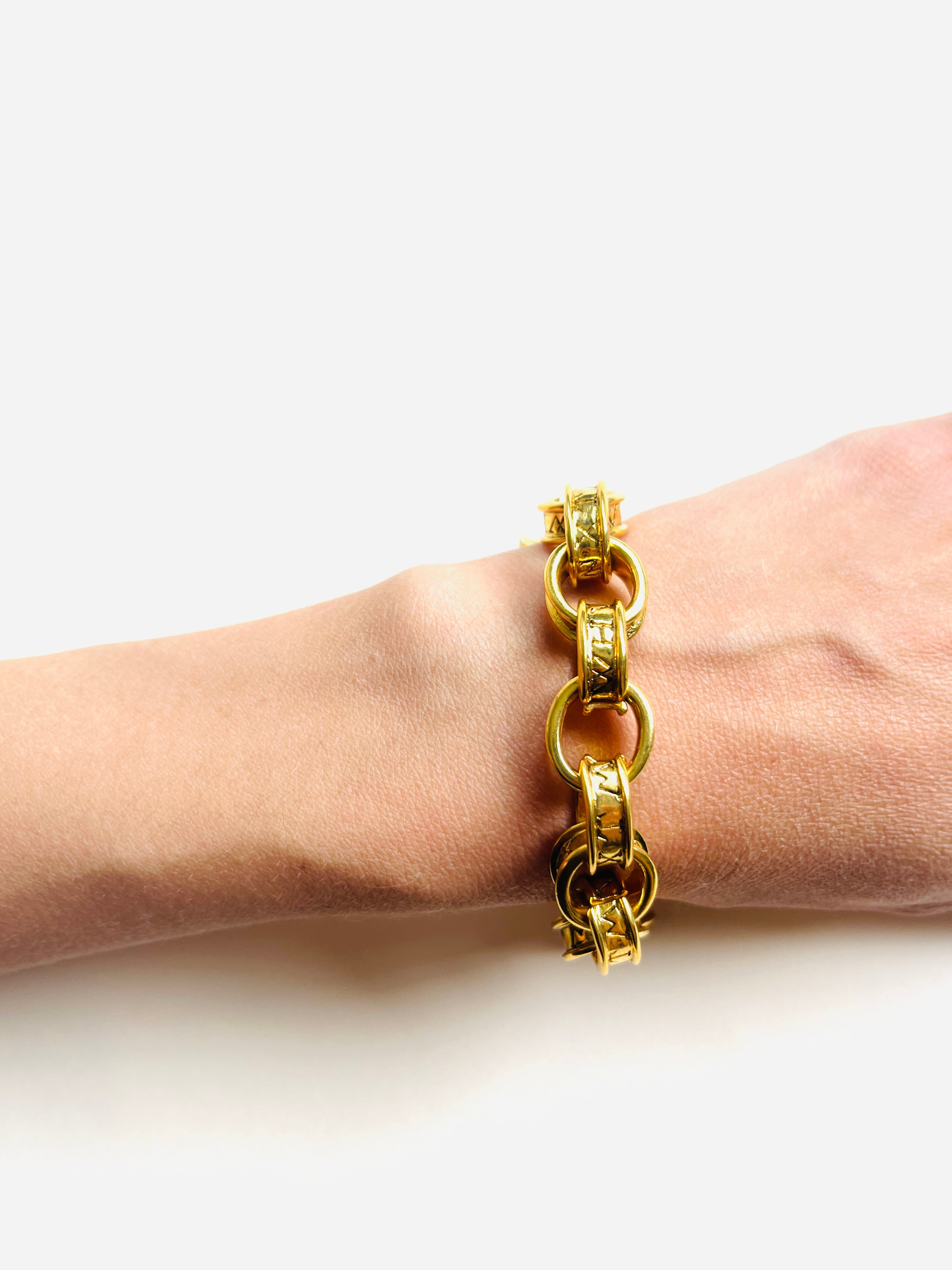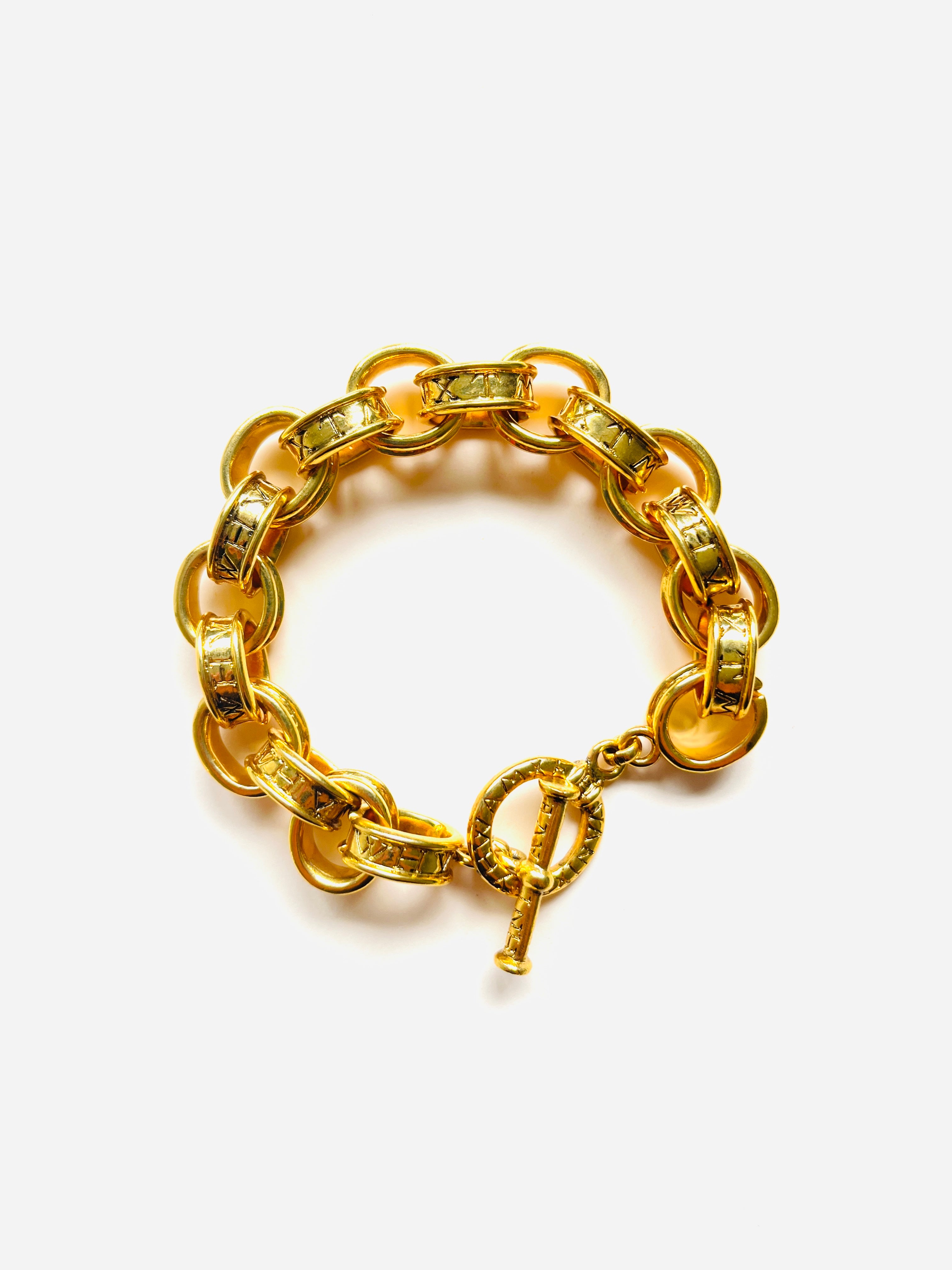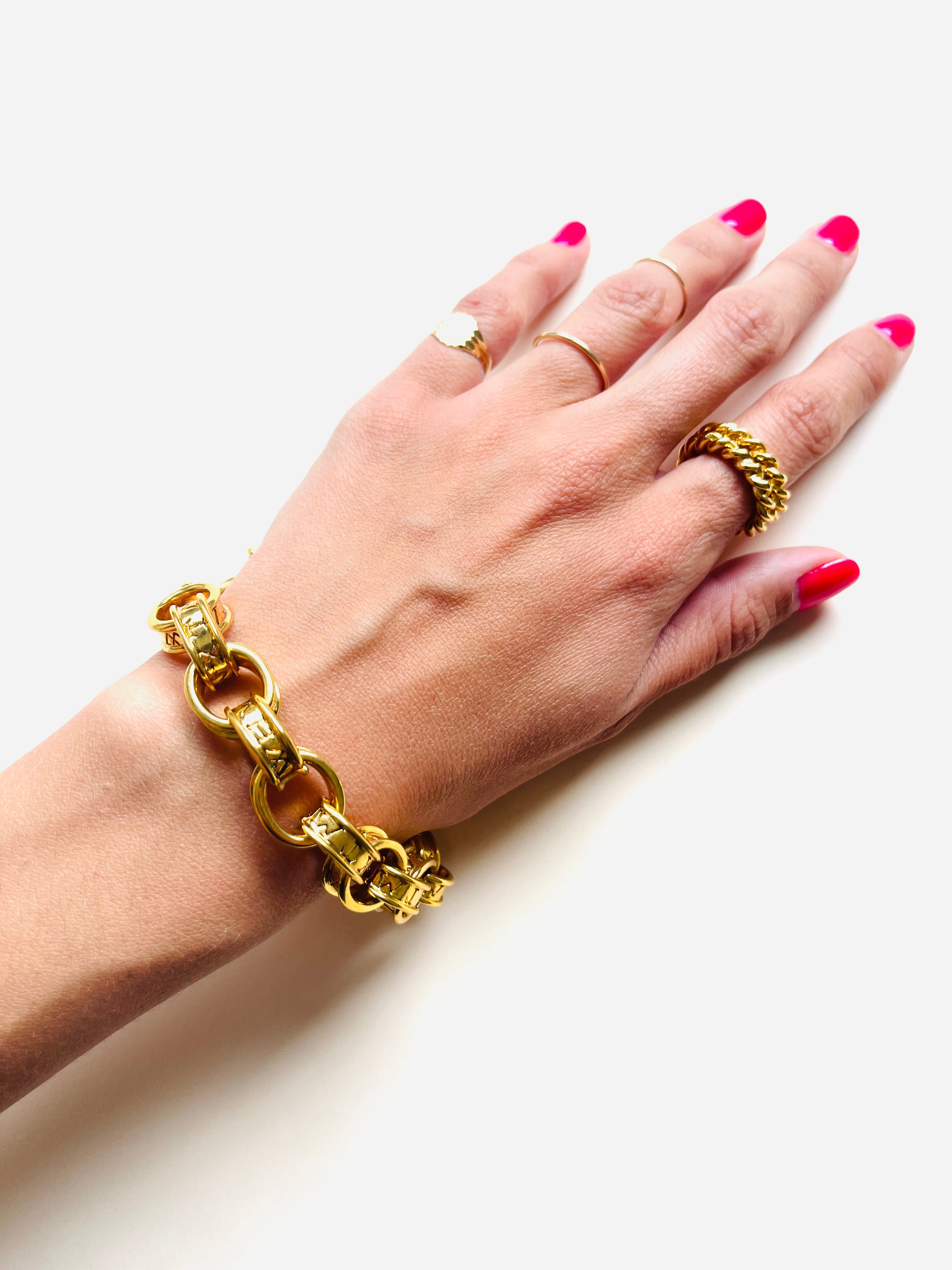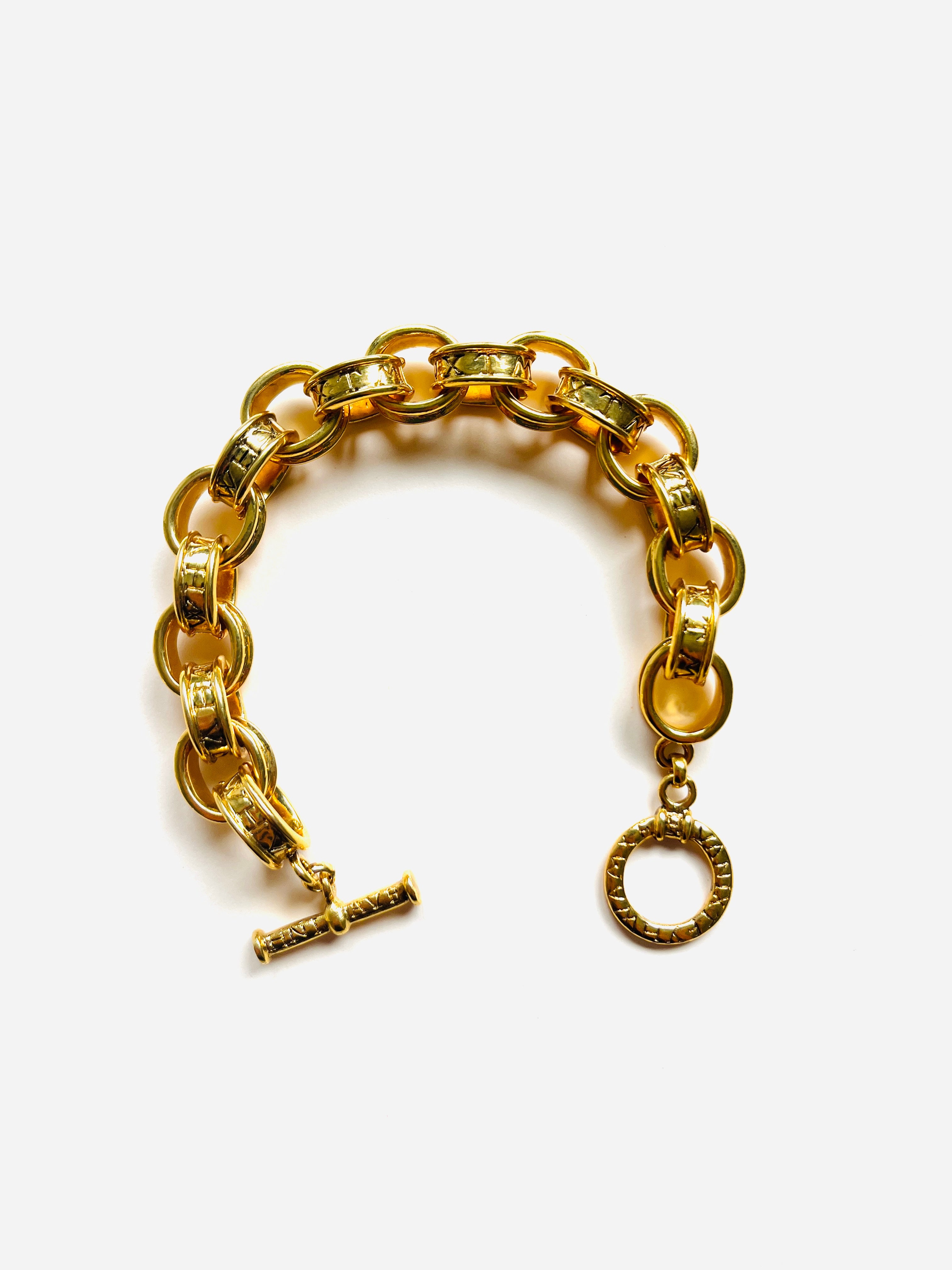Pulsera vintage original de los años 90 de base dorada de eslabones con detalles de letras y cierre de palanca.