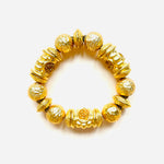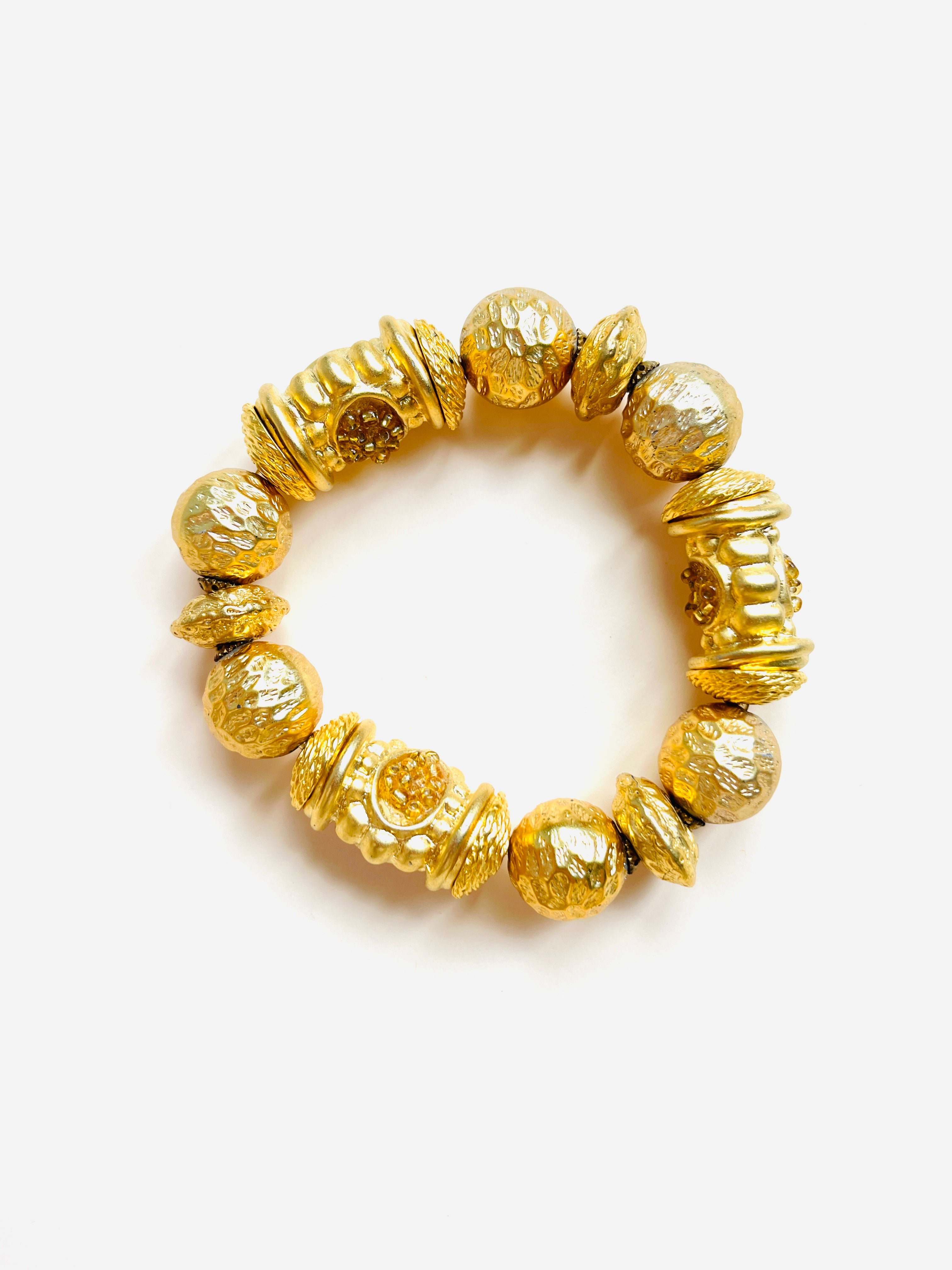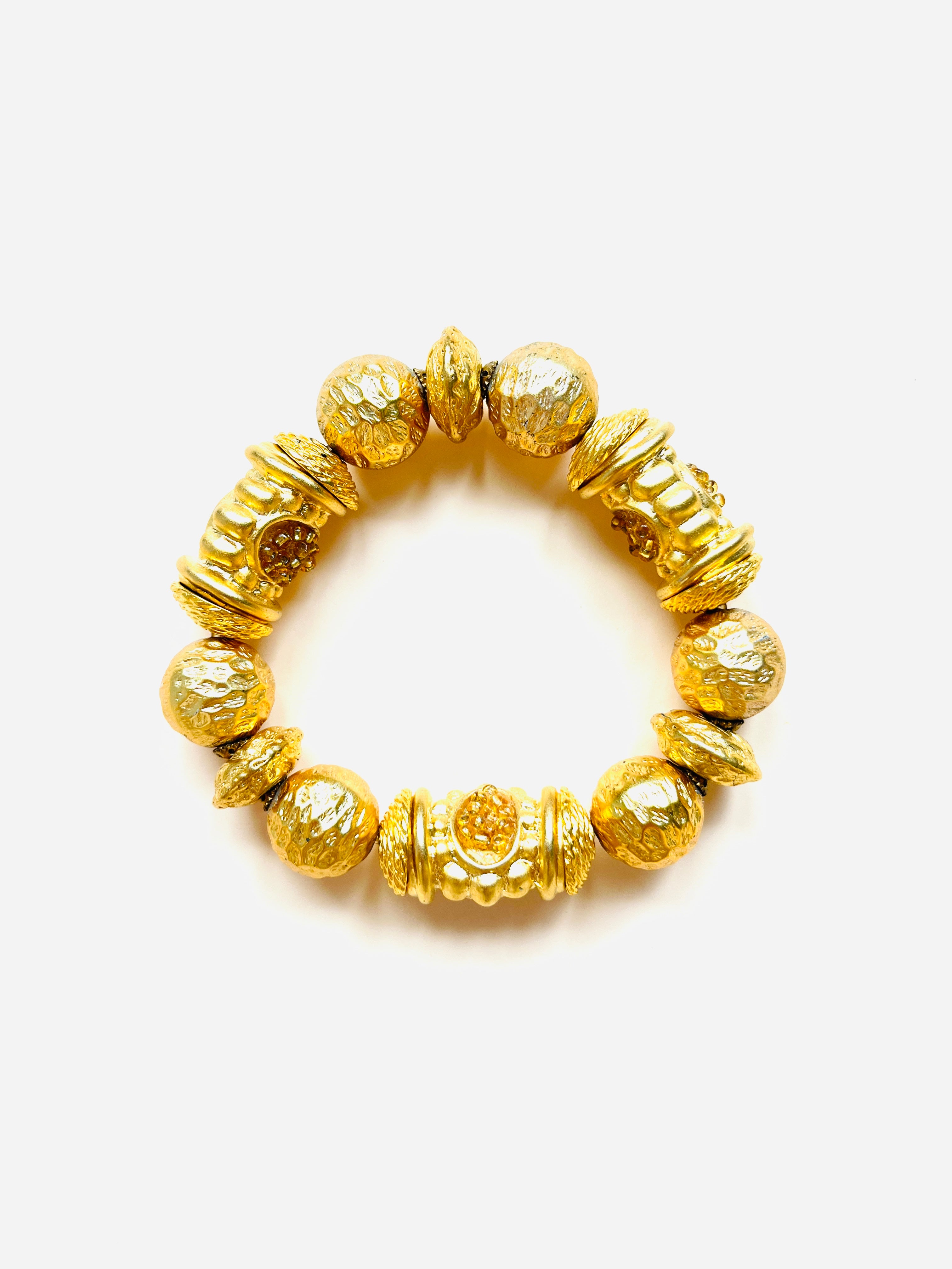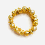 Pulsera vintage original de los años 90. Base dorada elástica de maxi abalorios en dorado con detalles en amarillo.