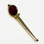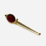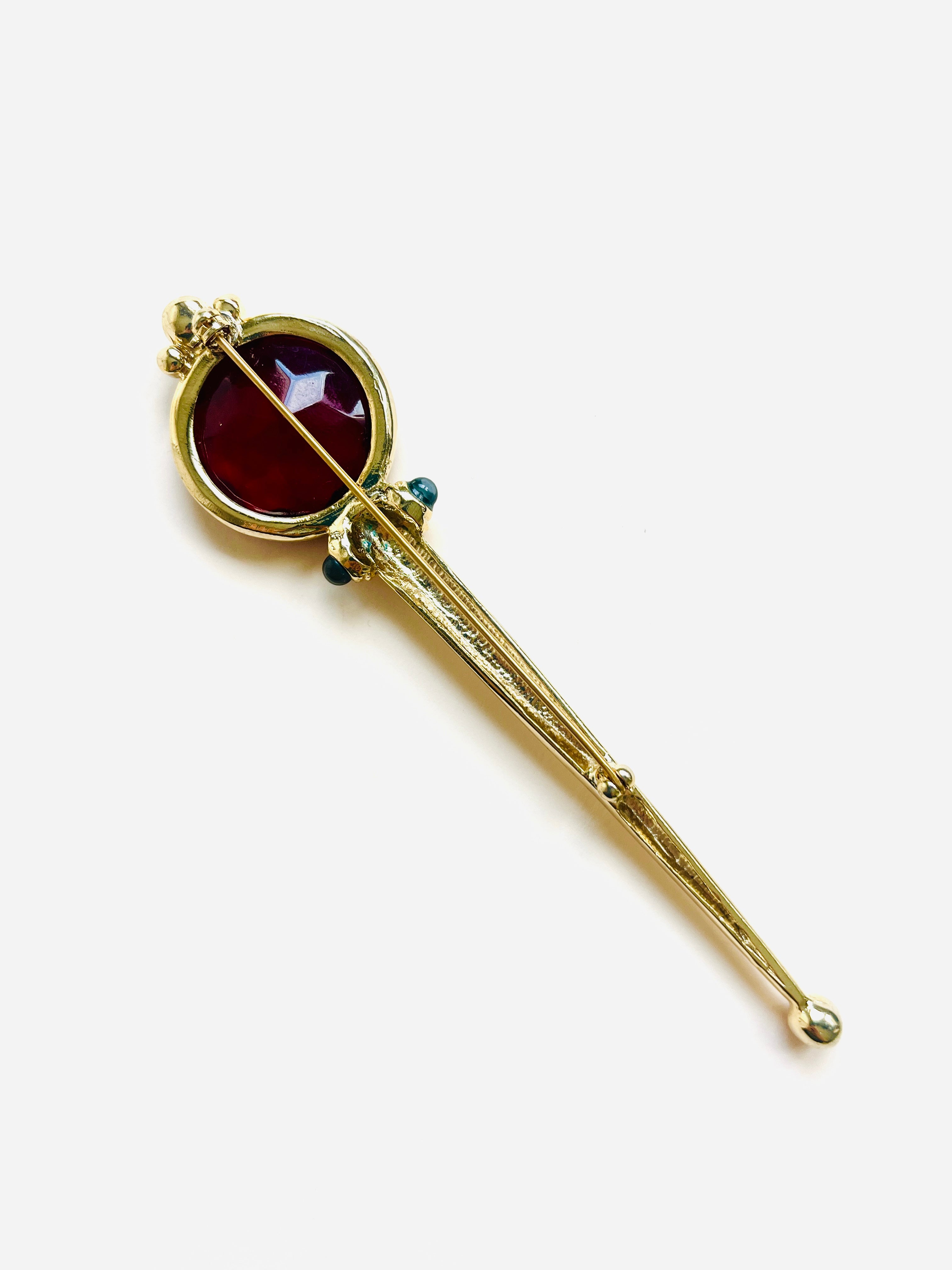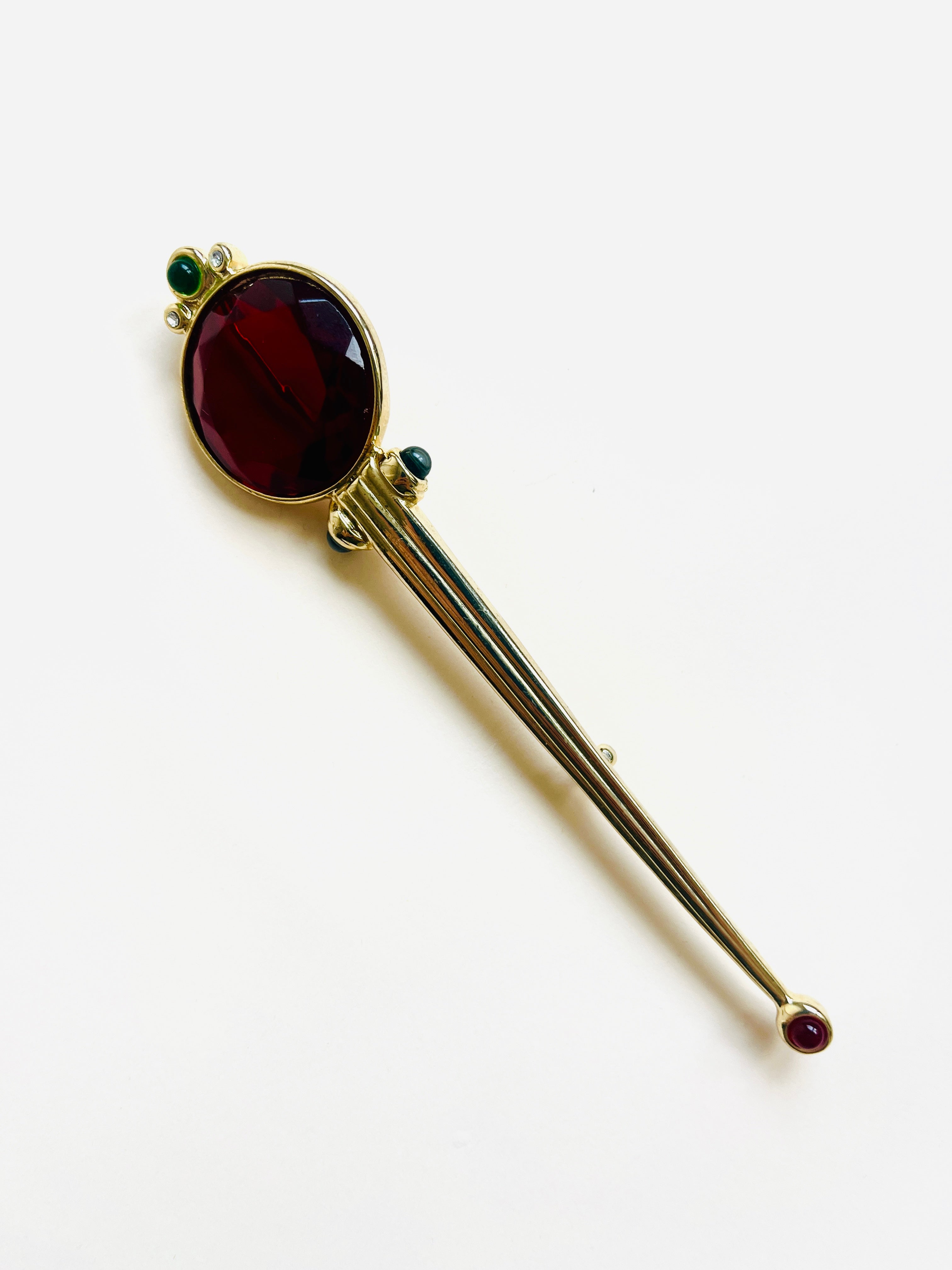 Alfiler vintage original de los años 90 con base dorada ovalada, detalle central con maxi cristal rojo y apliques en color verde.
