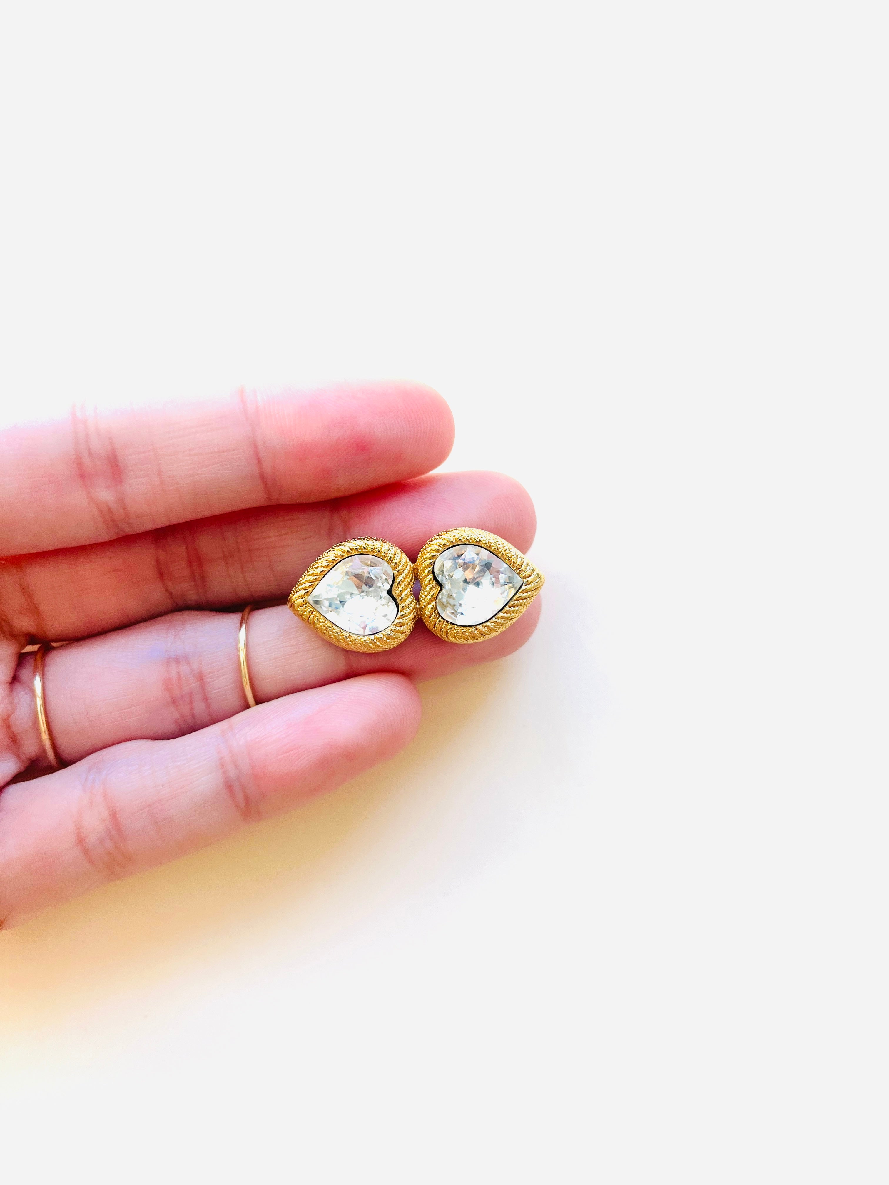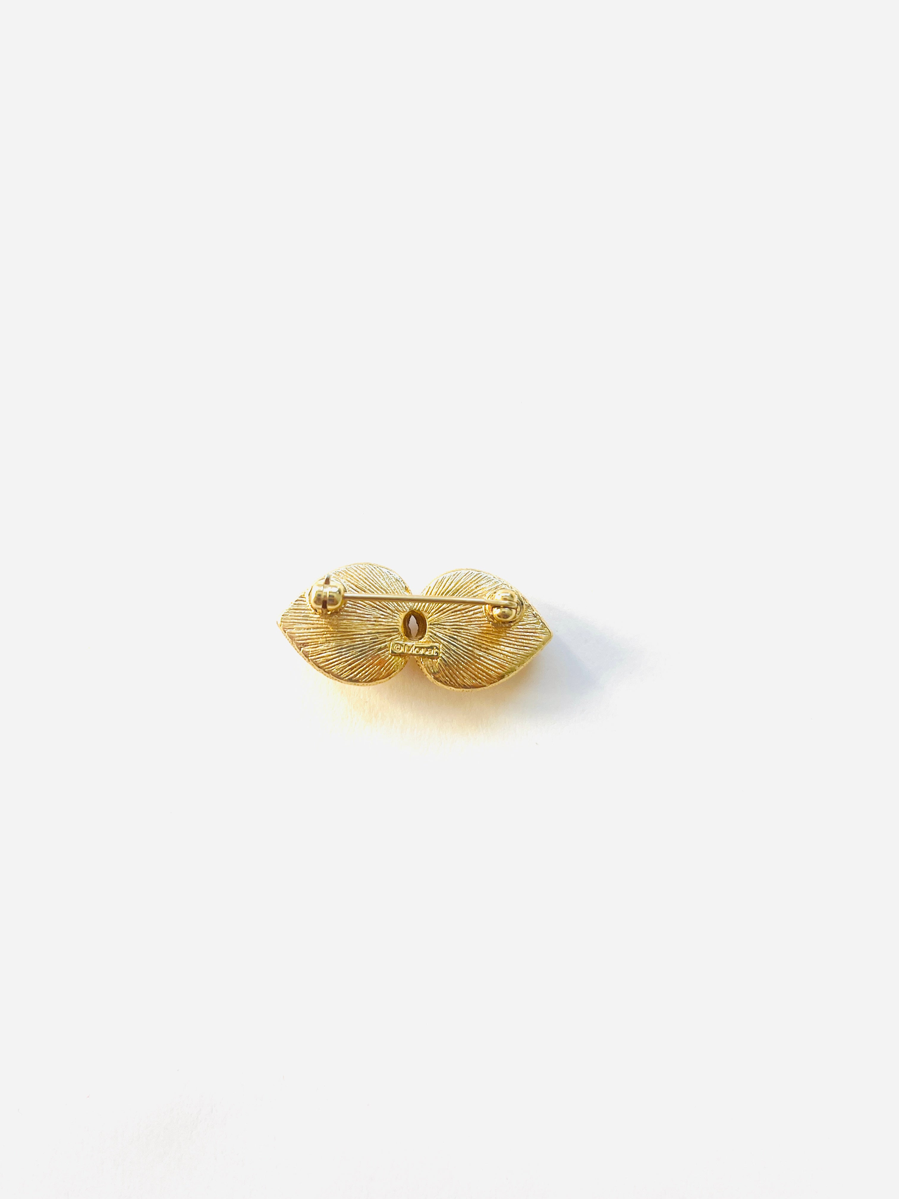 Broche vintage original de los años 90 con base dorada en forma de doble corazón con cristales blancos.