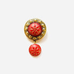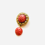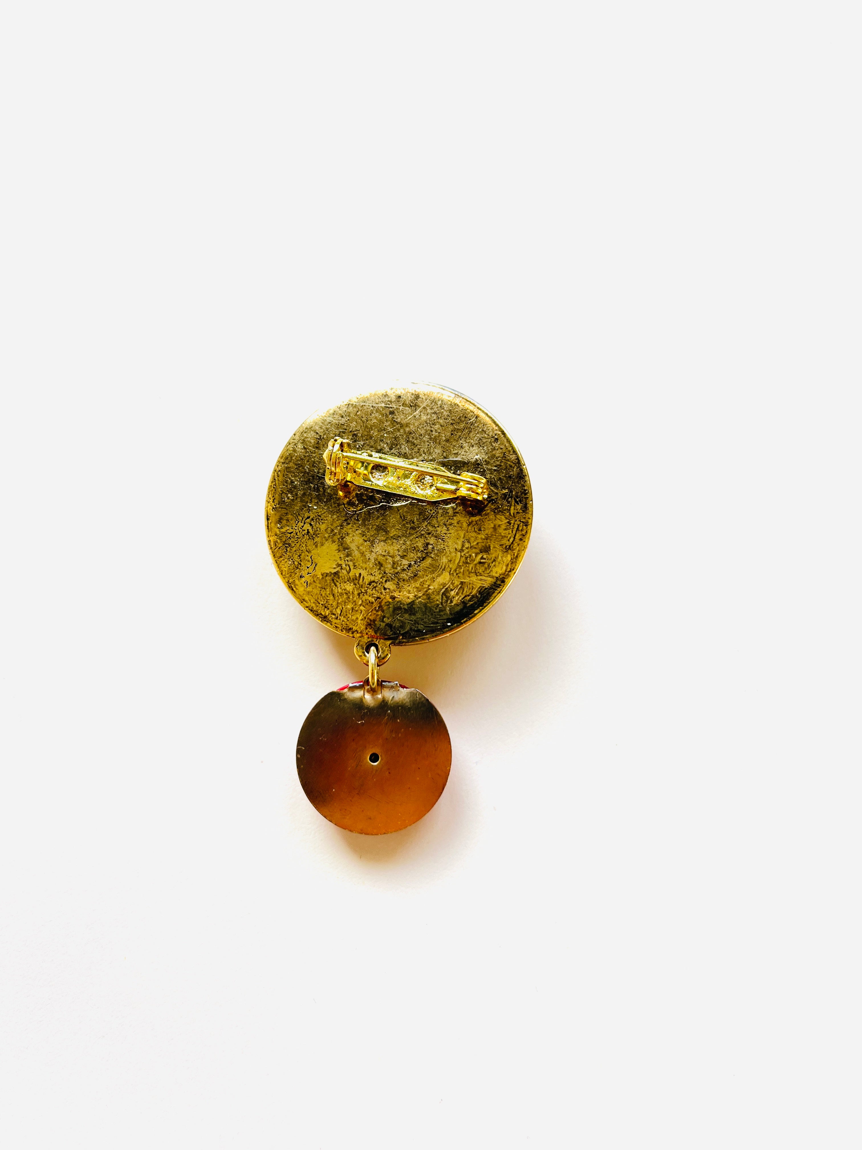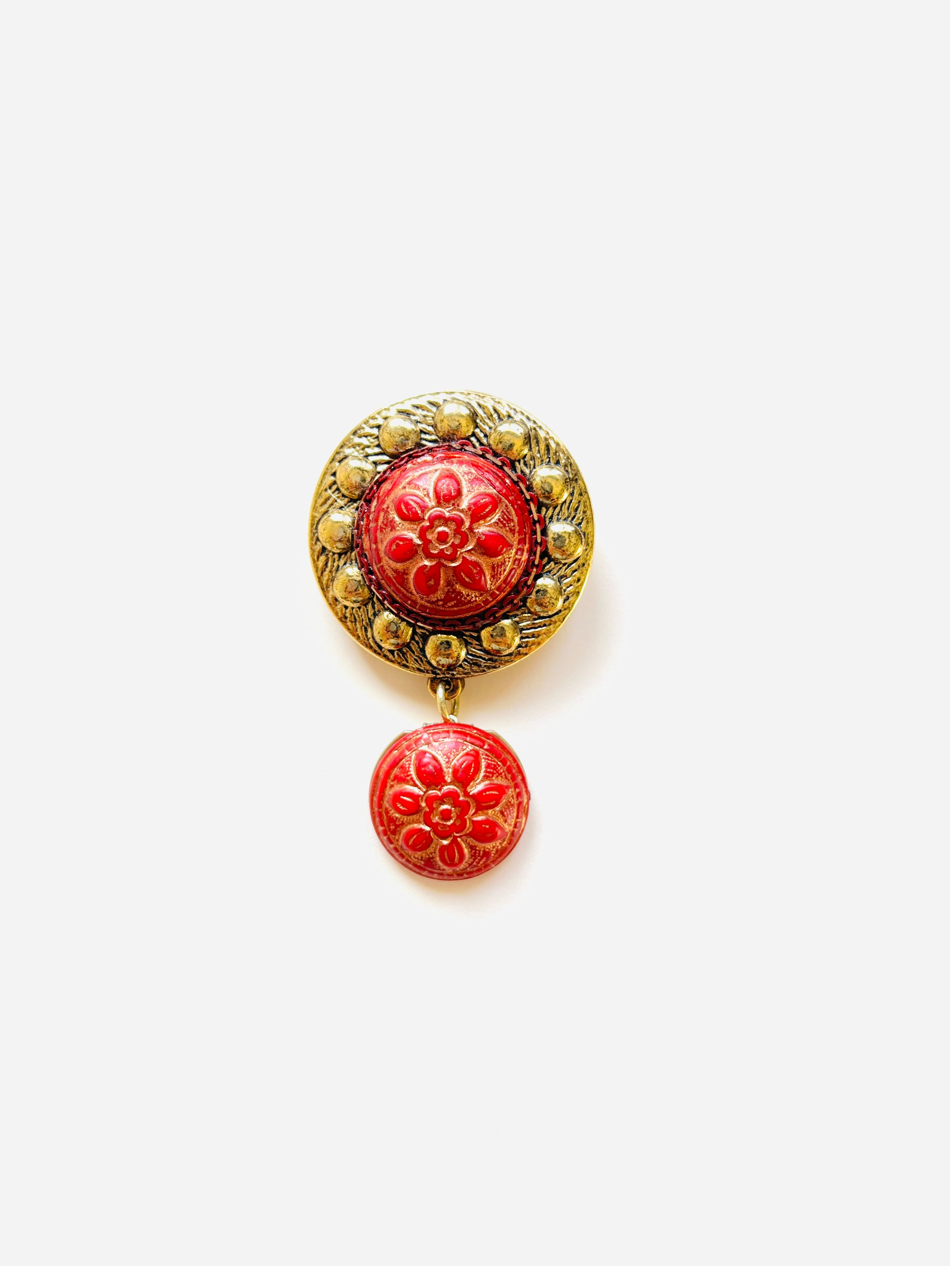 Broche vintage con base dorada y colgante con detalles ornamentales en dorado y rojo.