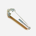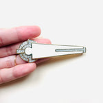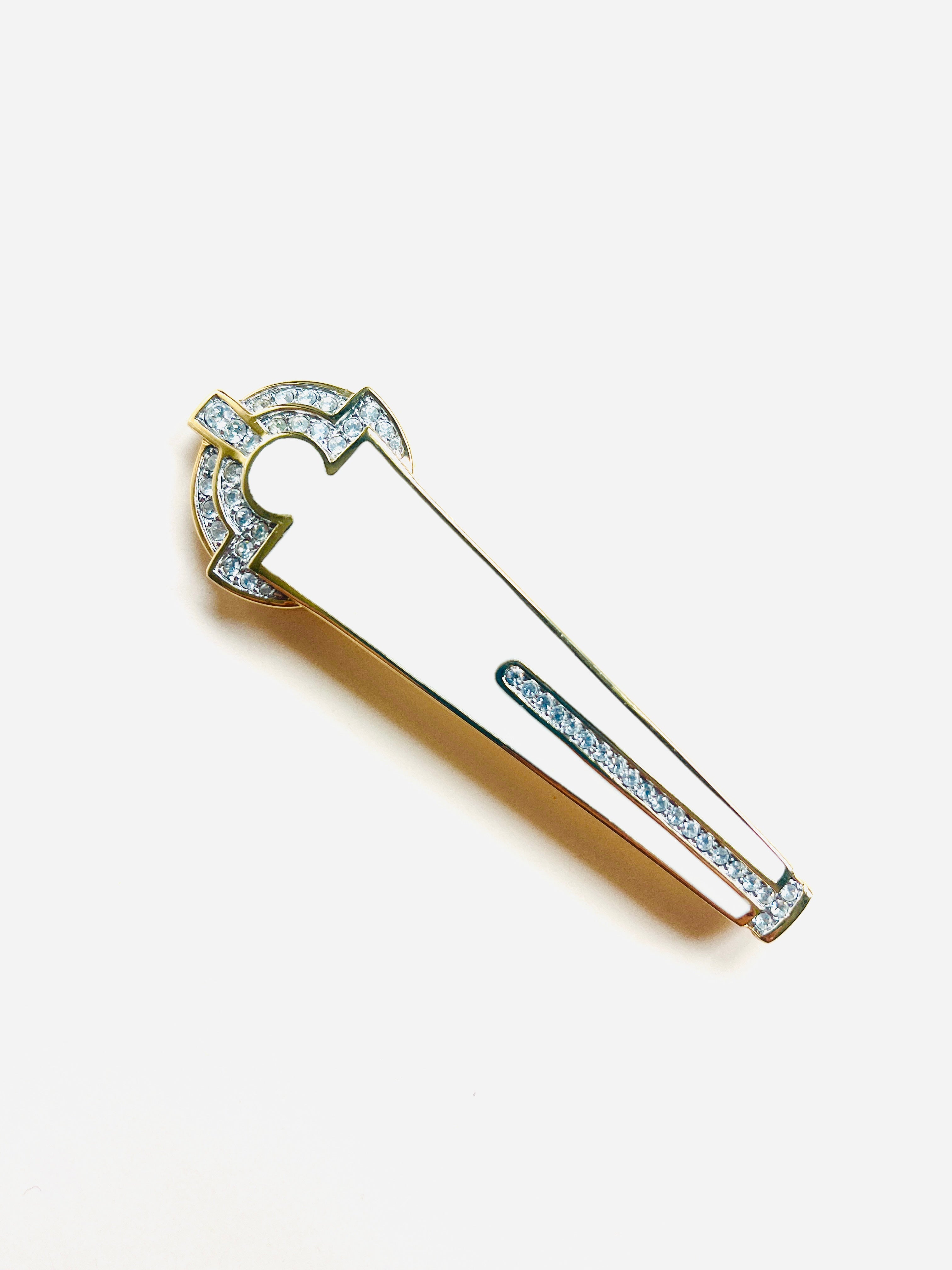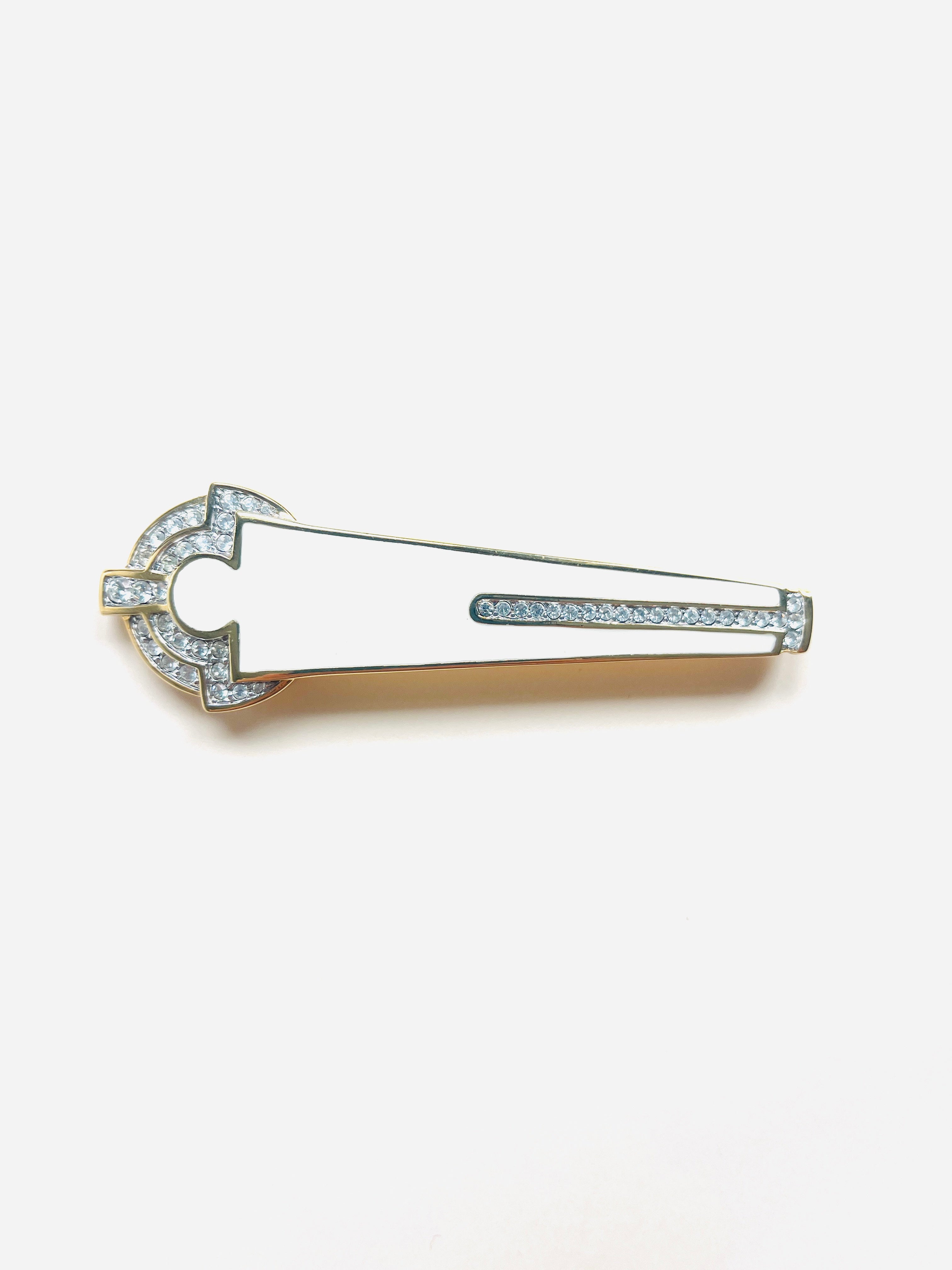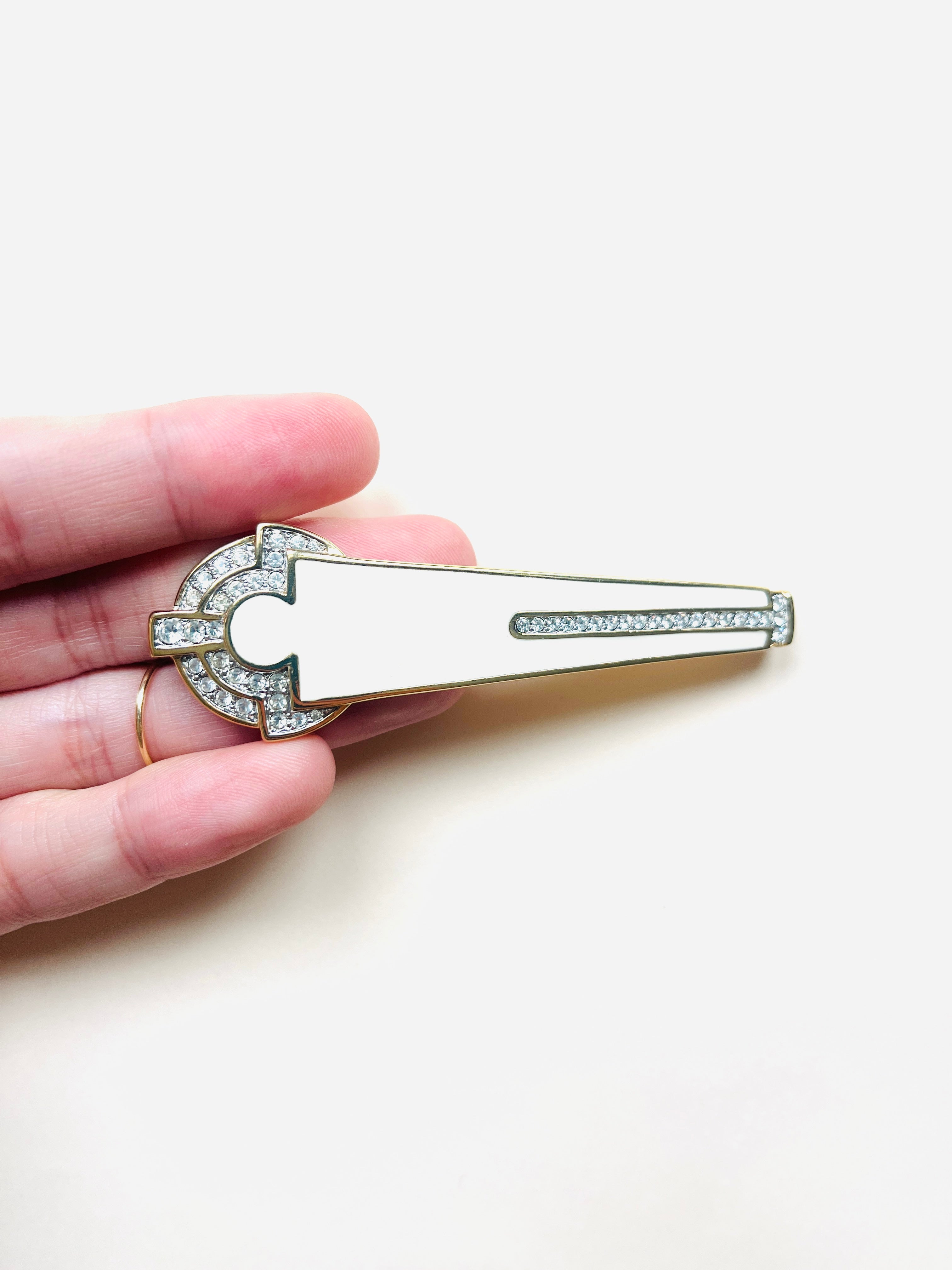 Broche vintage original de los años 90 con base dorada y esmaltado blanco con apliques en cristal blanco.