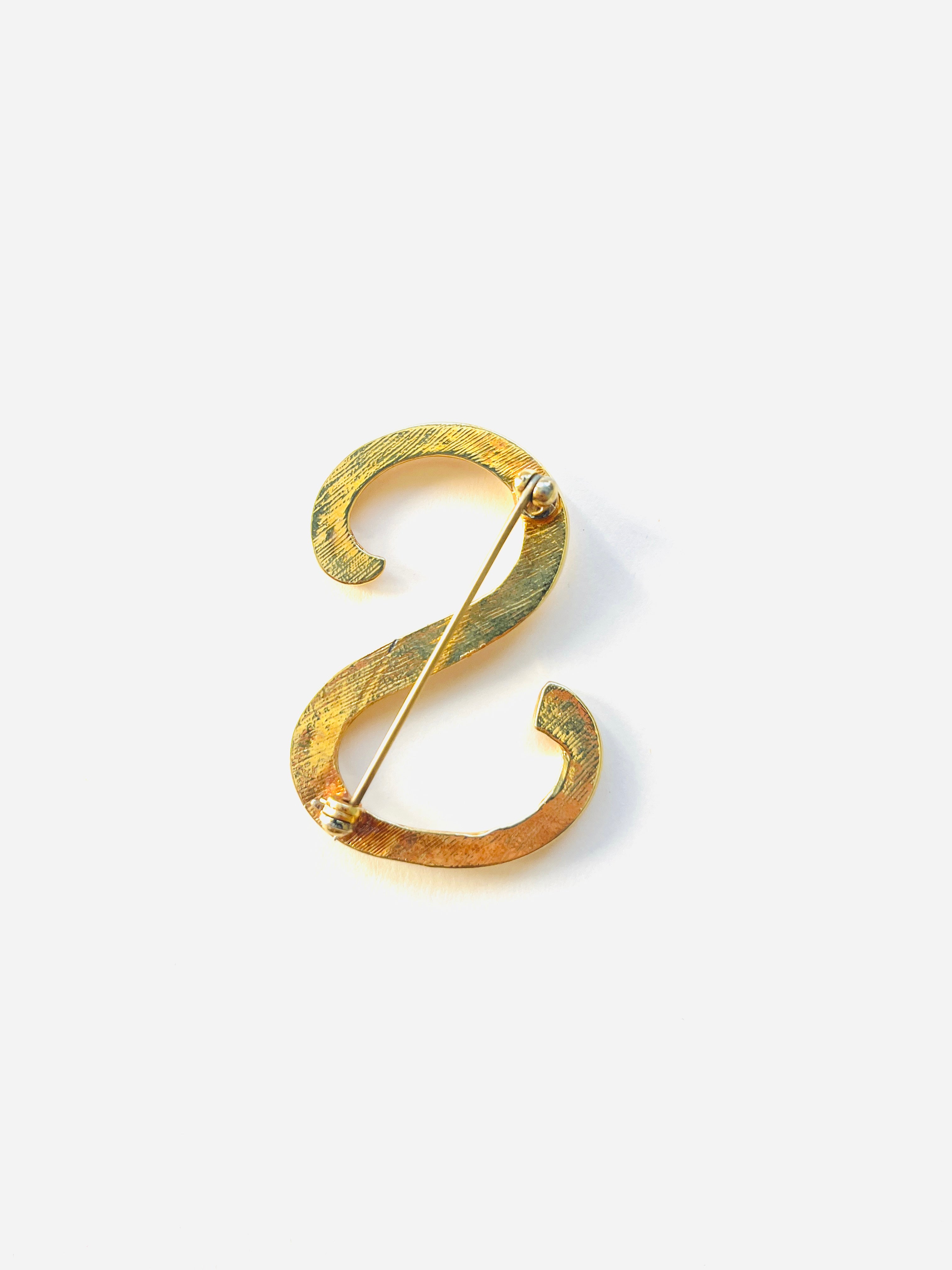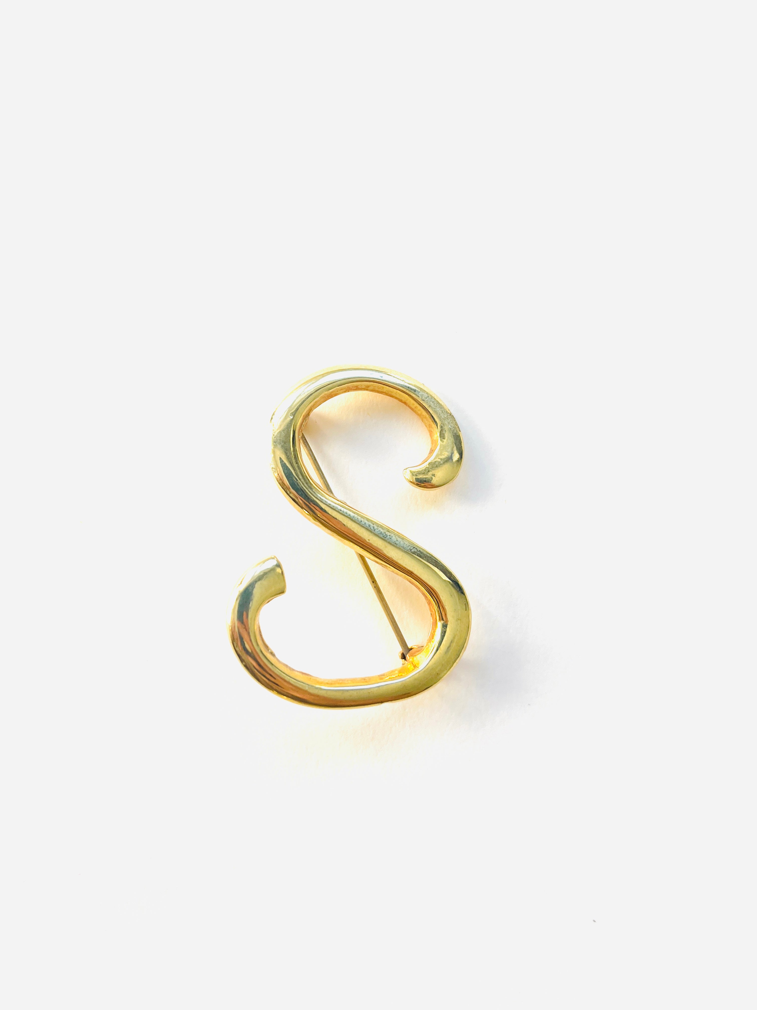 Broche vintage original de los años 90 con cierre de alfiler. Base dorada en forma de inicial S mayúscula.