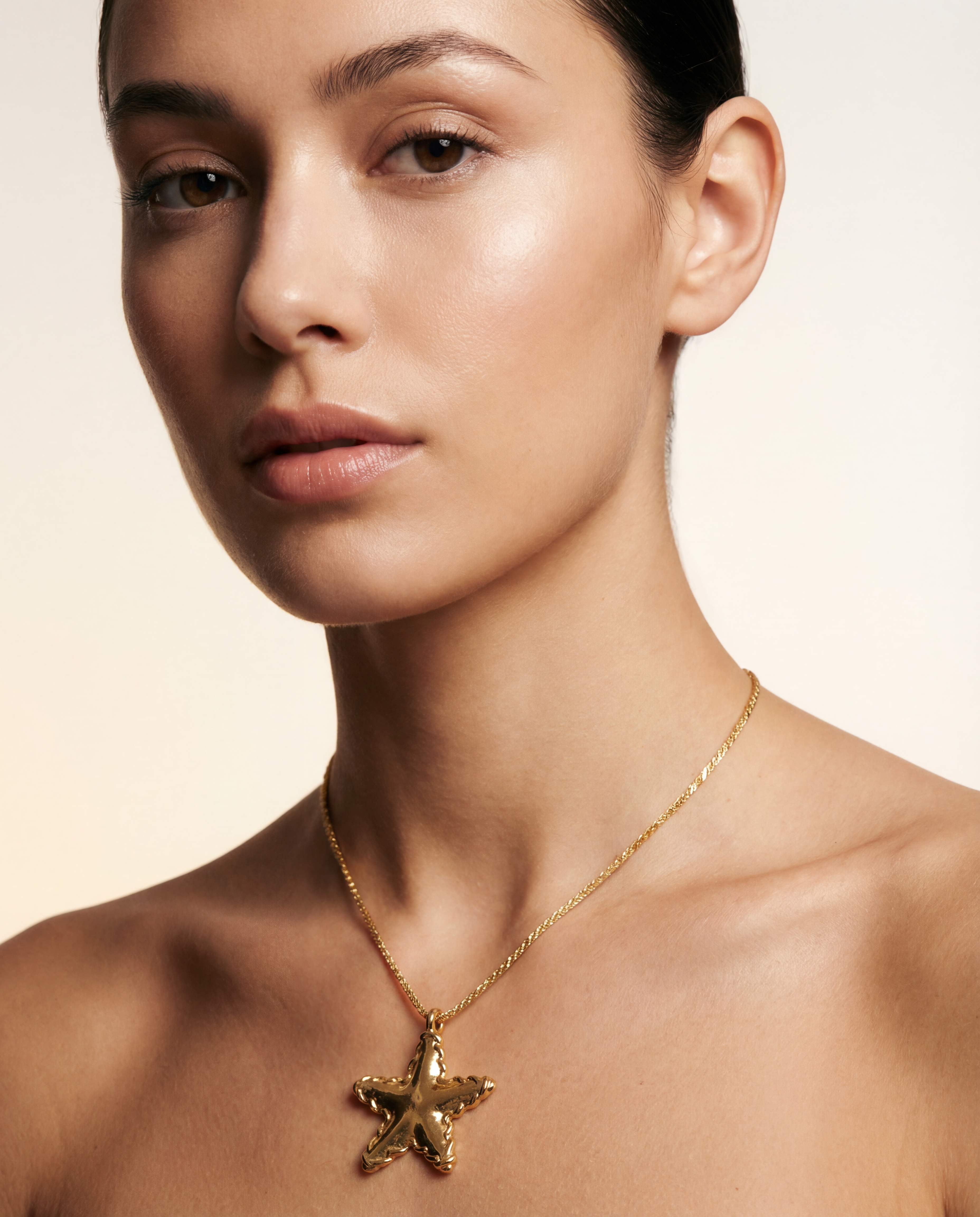 Collar vintage original de los años 90. Base dorada con cadena tipo cola topo, cierre de gancho y colgante en forma de estrella.