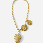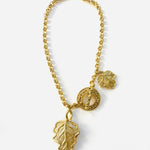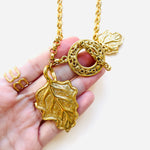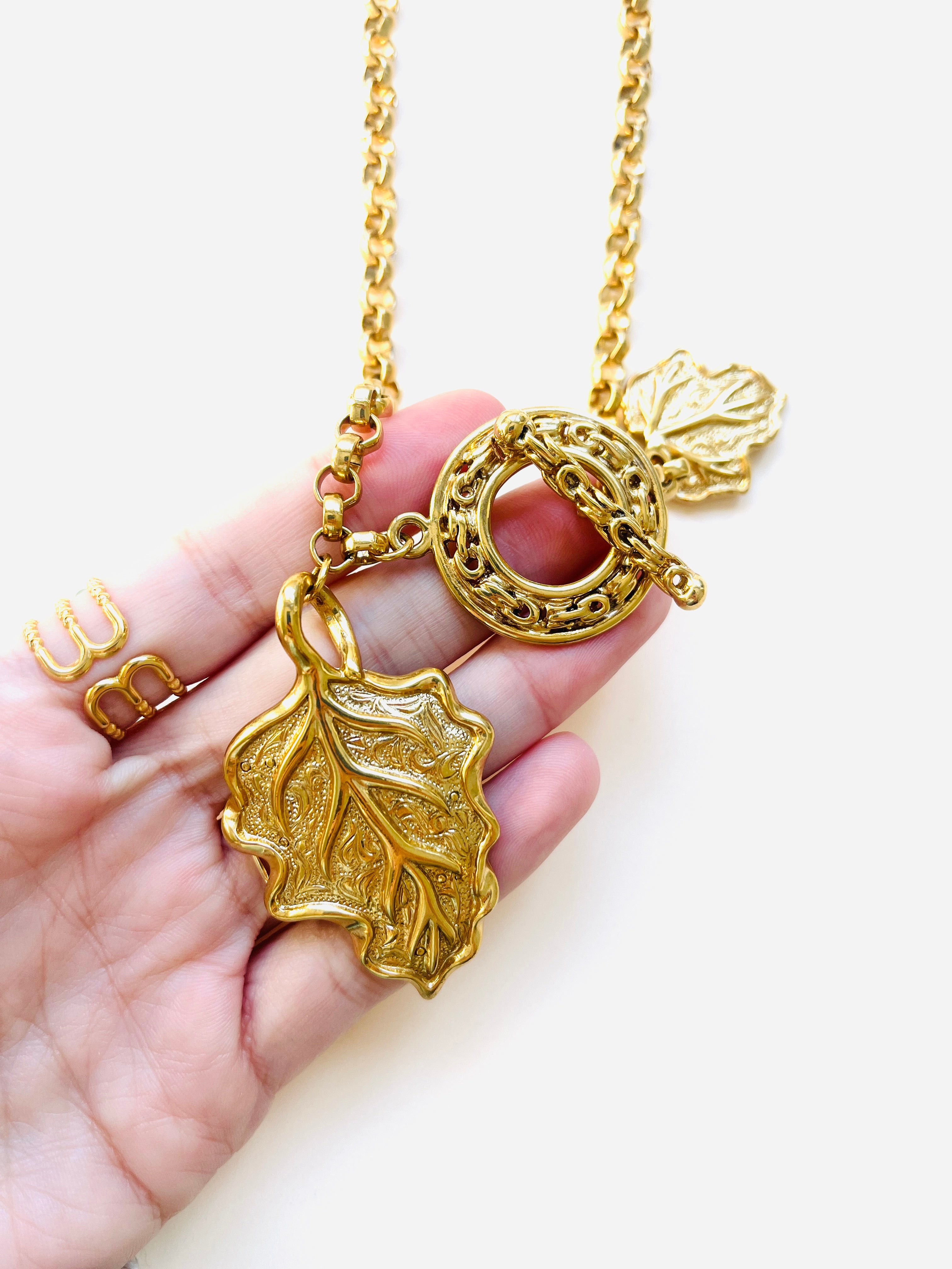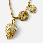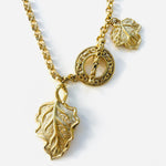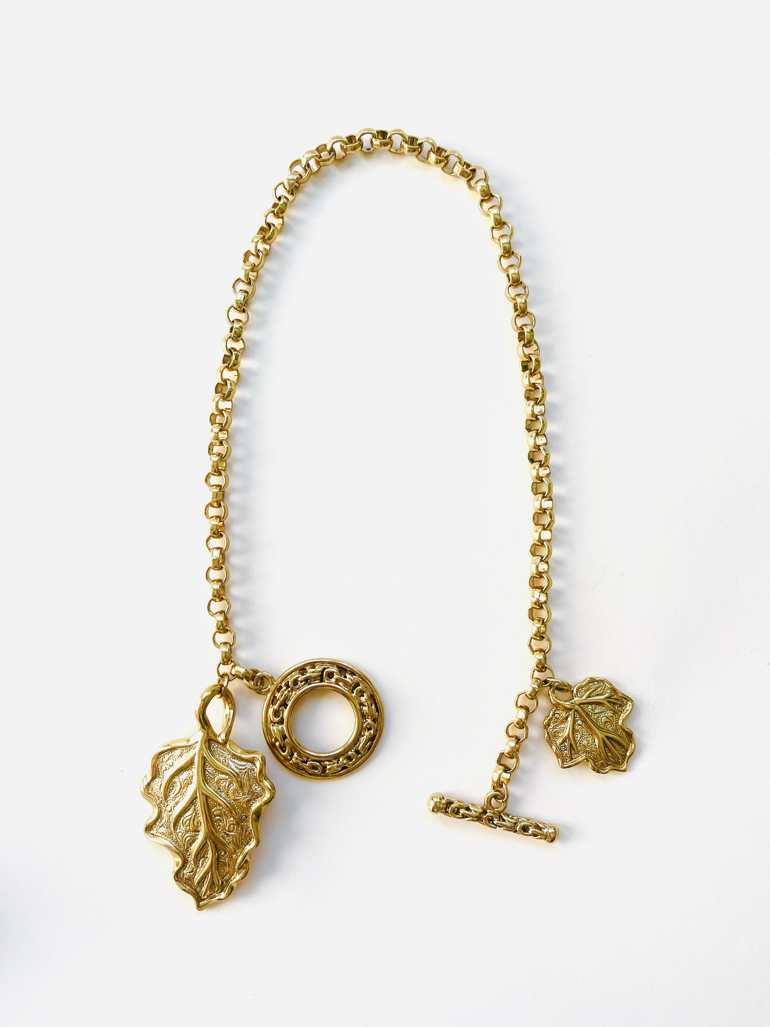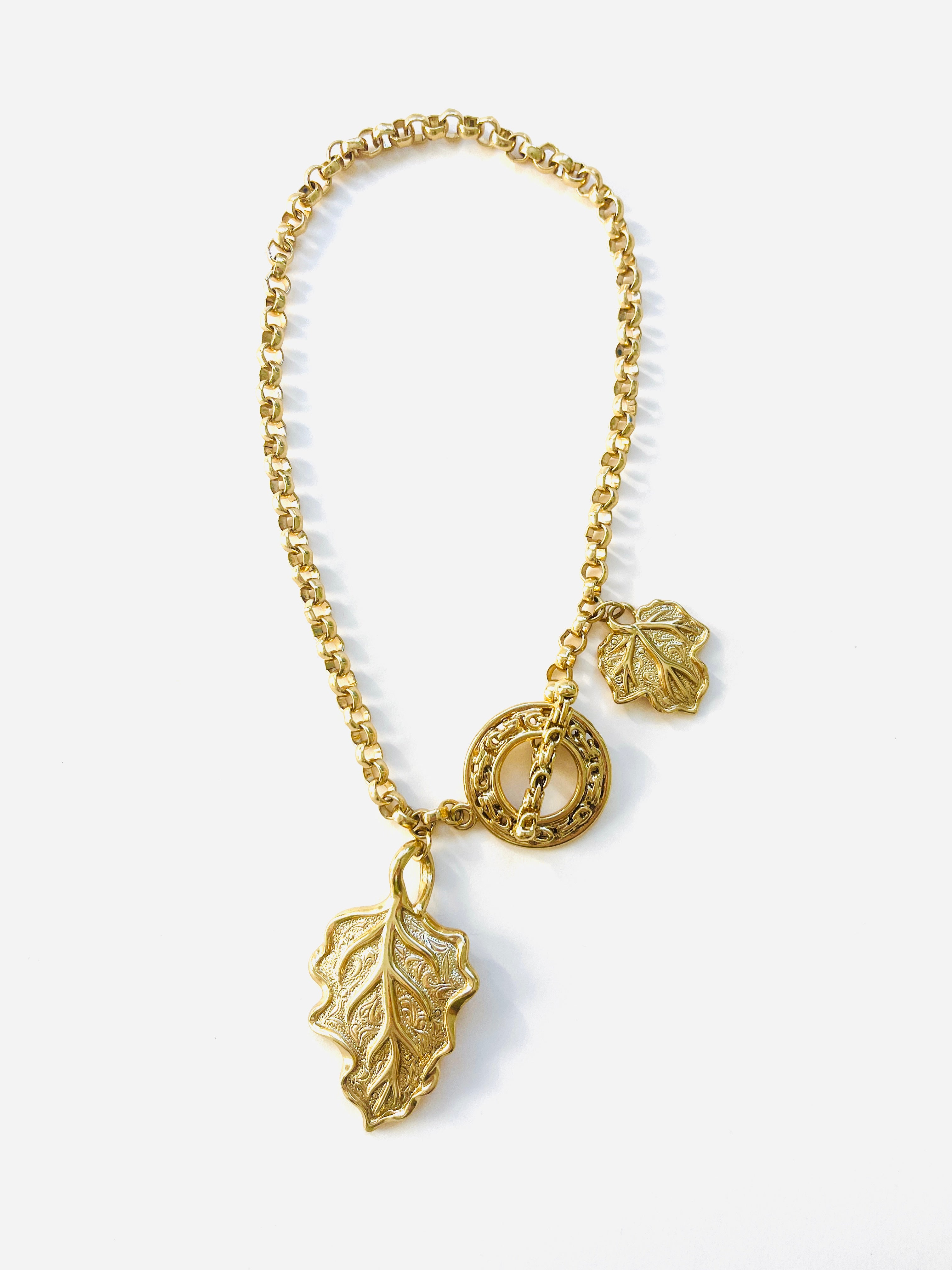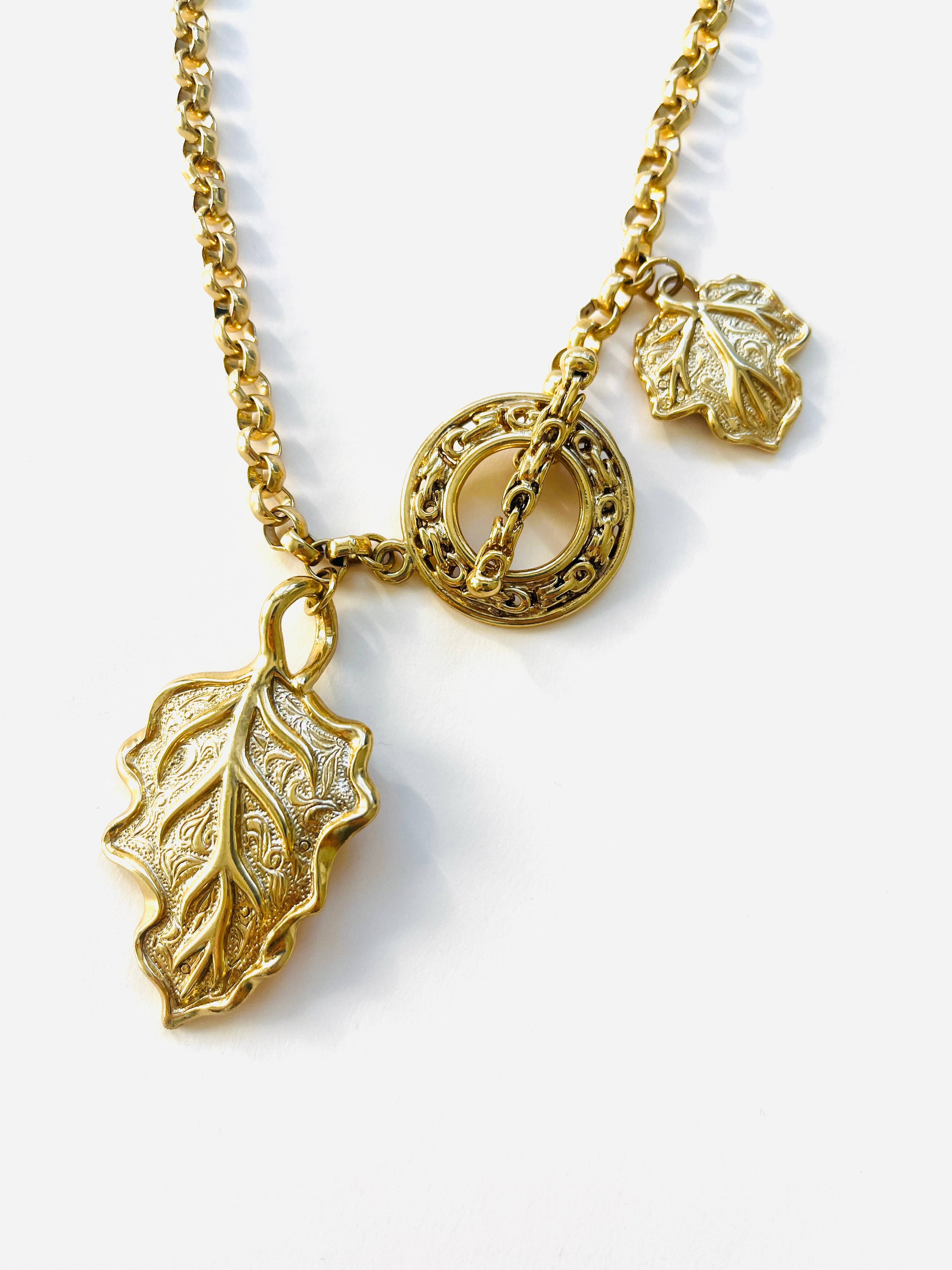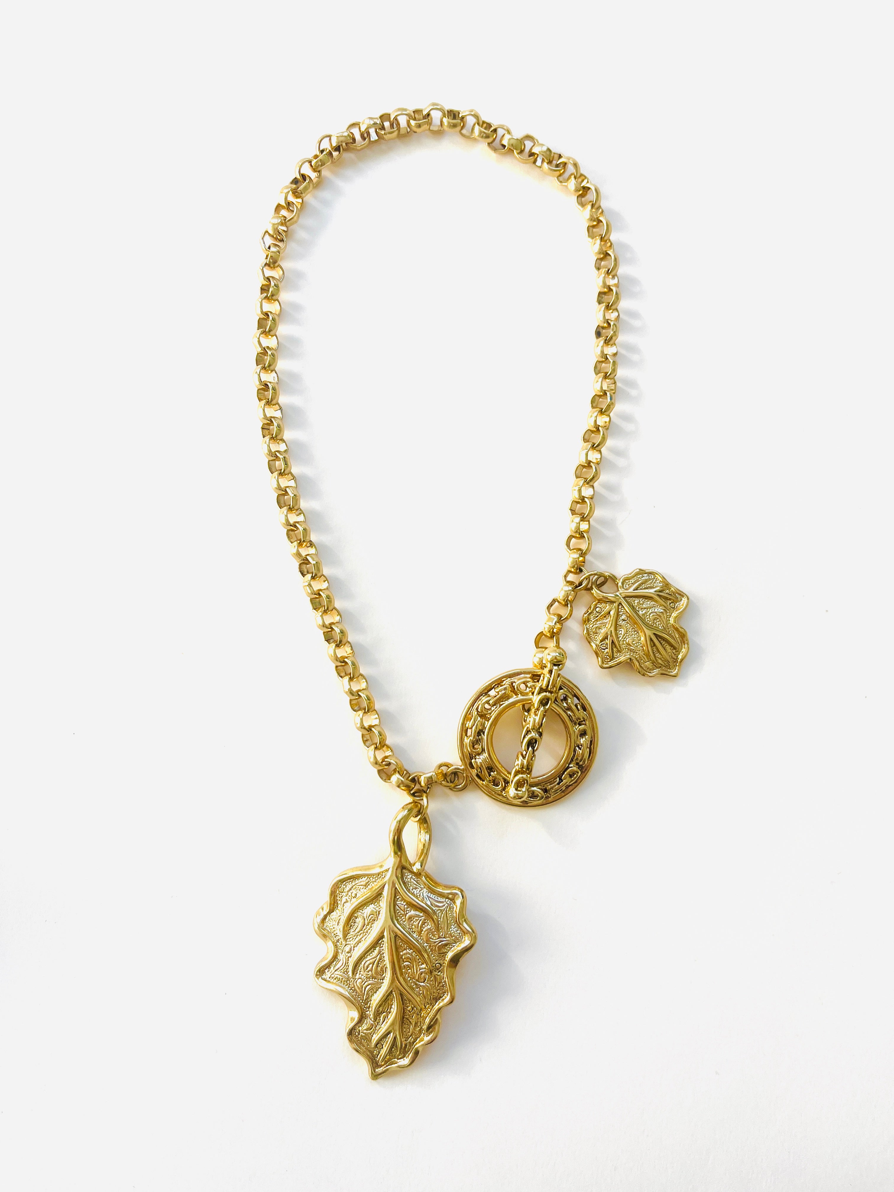 Collar vintage original de los años 90. Base dorada con cadena y colgante central en forma de hoja con cierre palanca.