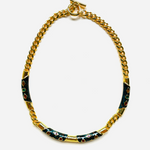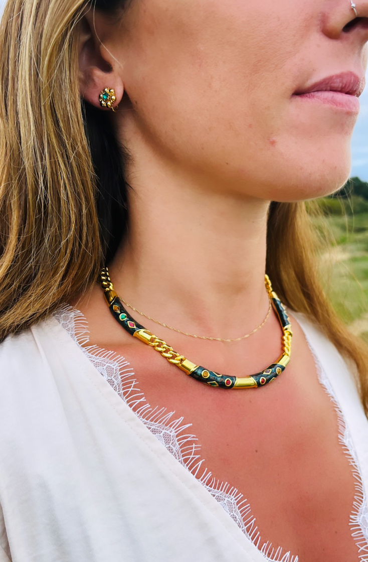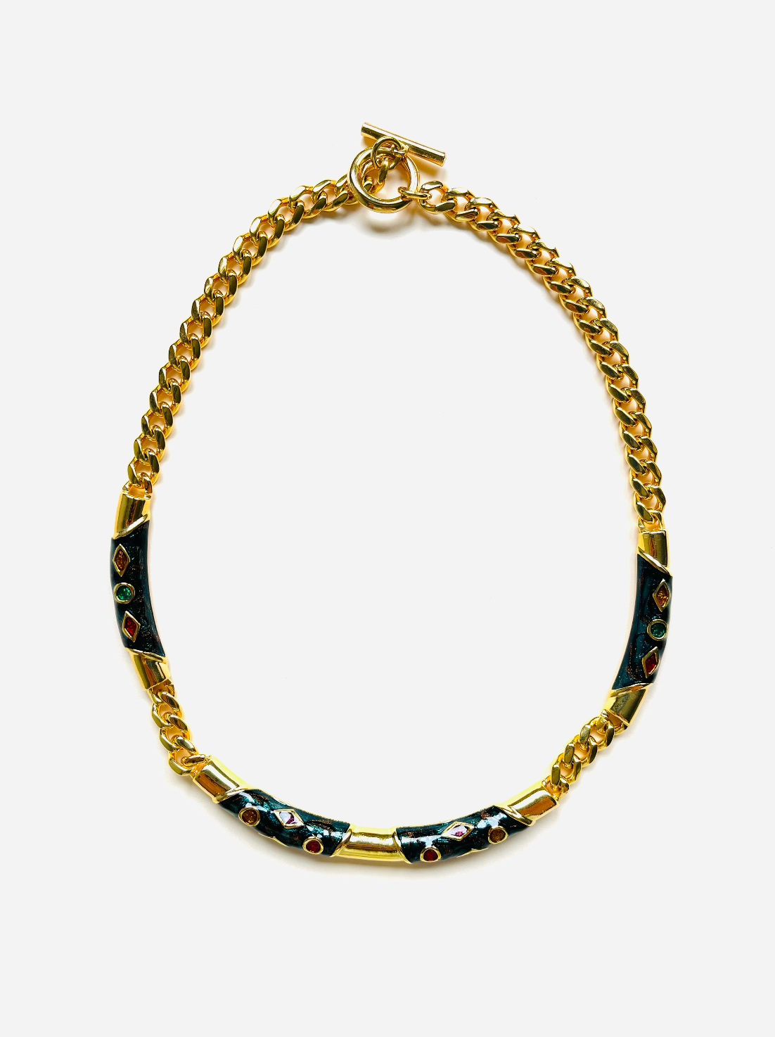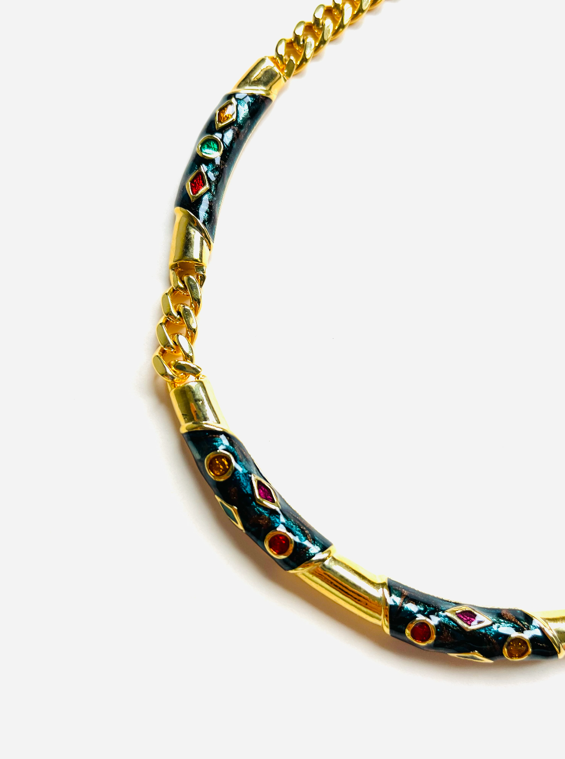 Gargantilla vintage original de los años 90. Cadena de eslabón y cierre de barra, chapado en oro y esmaltado verde con detalles en colores tornasolados.