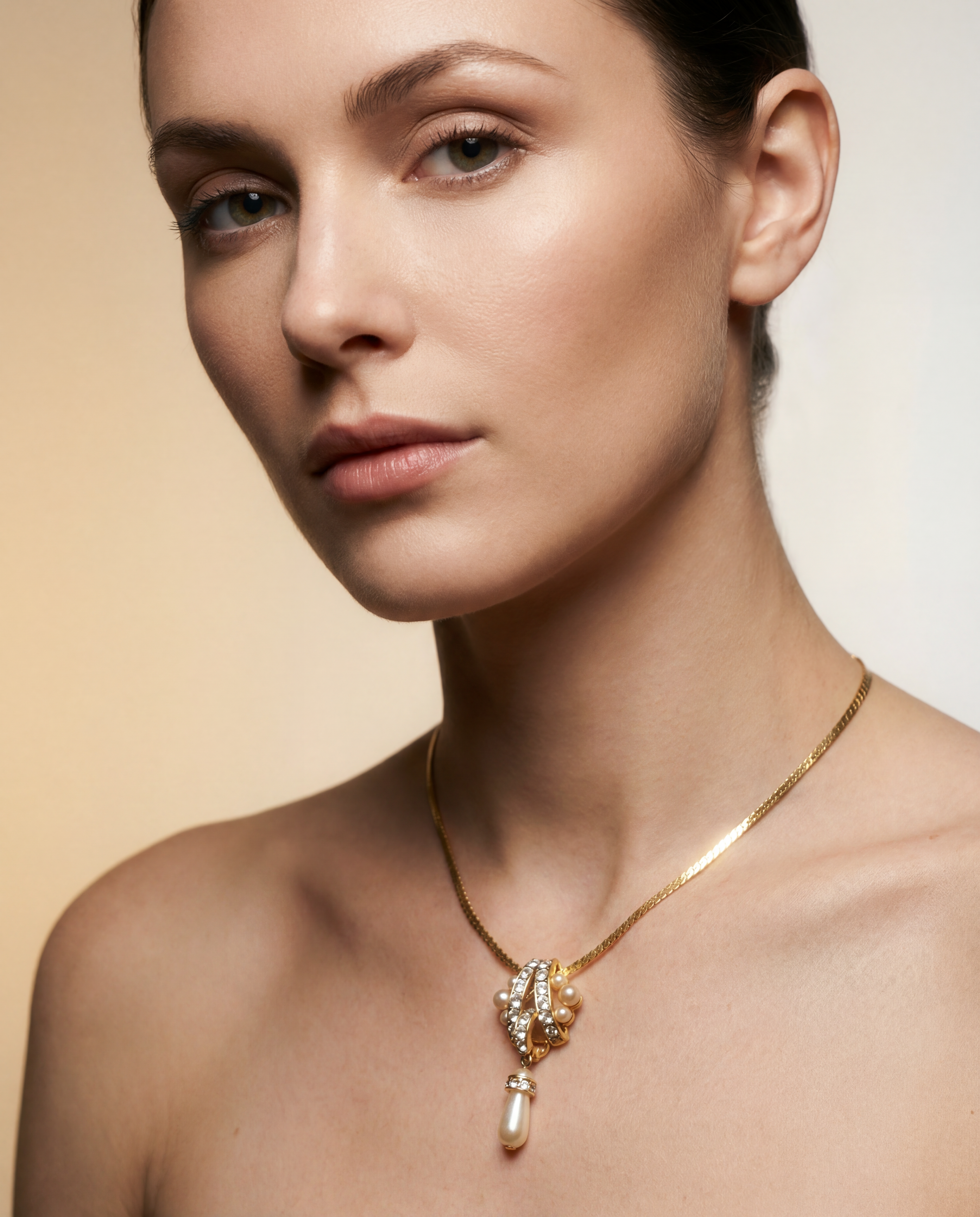 Gargantilla vintage original de los años 90. Base dorada con cadena de minimal, cierre de mosquetón y colgante con apliques de cristal y perlas blancas.